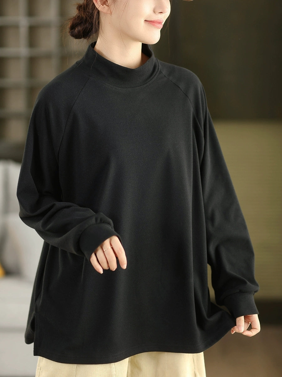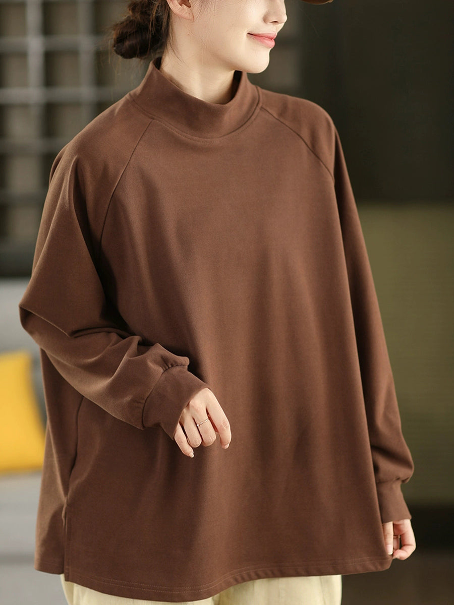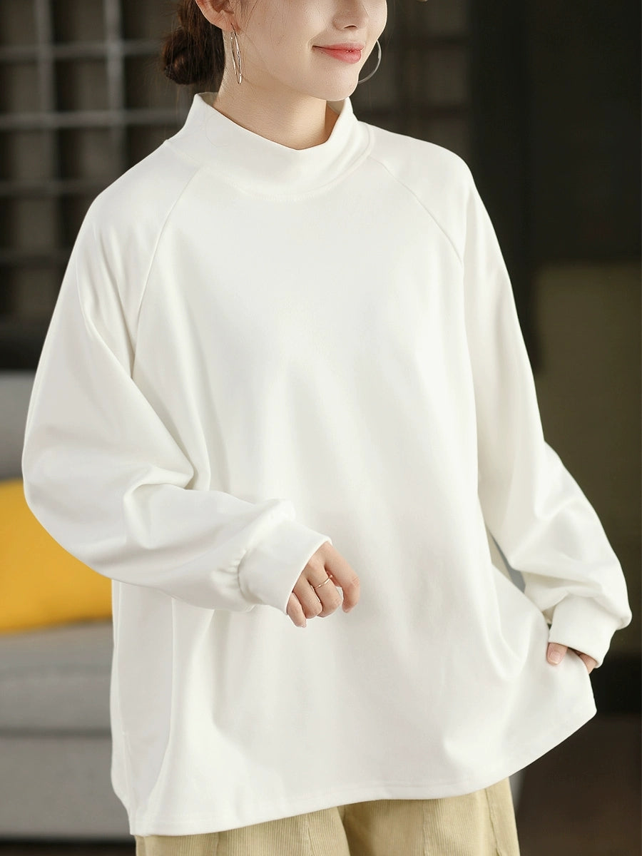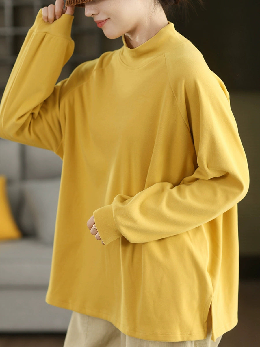 Women Winter Artsy Pure Color Half-Turtleneck 100%Cotton Blouse
