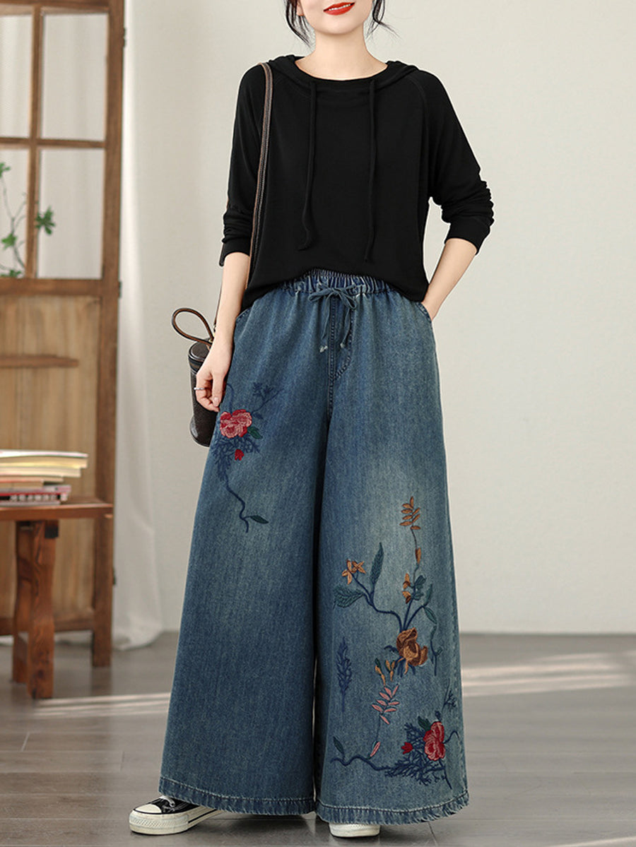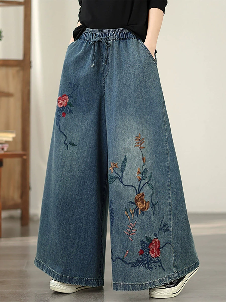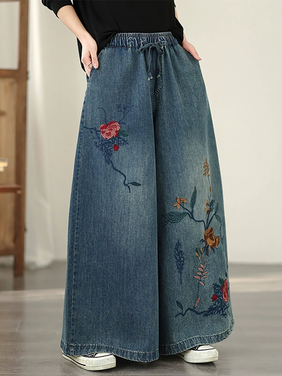 Women Spring Vintage Denim Flower Embroidery Wide-leg Pants