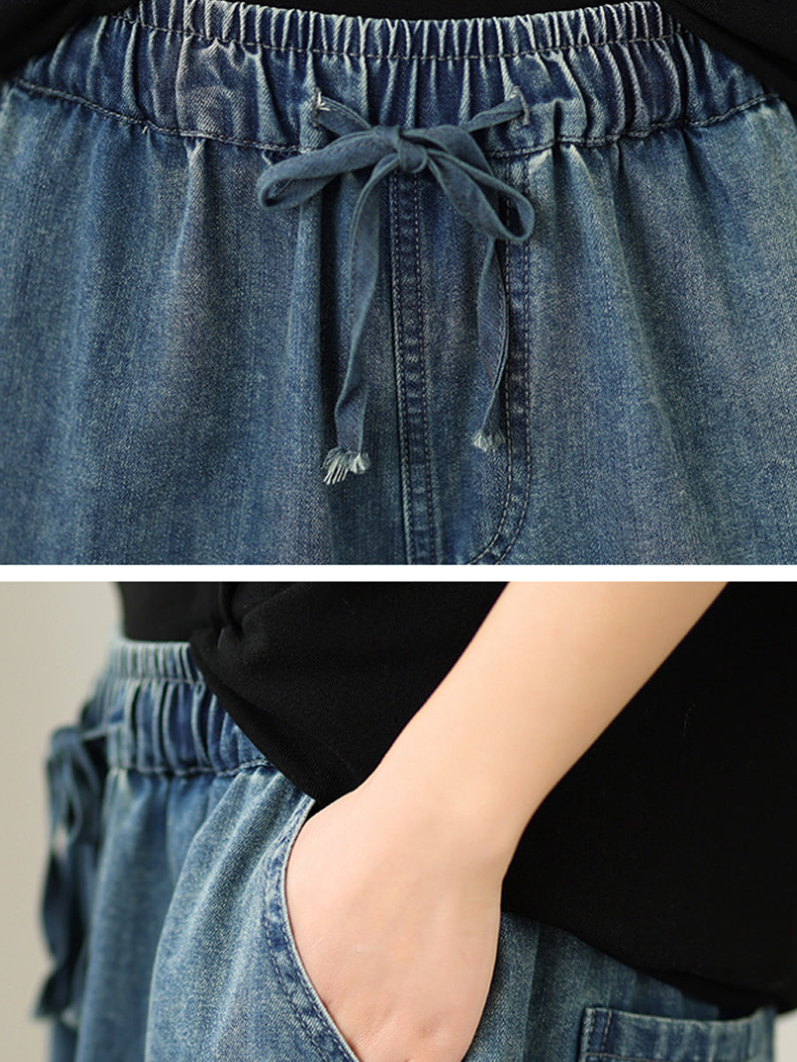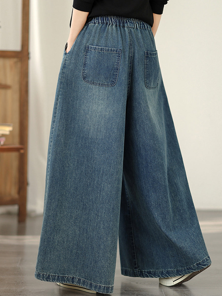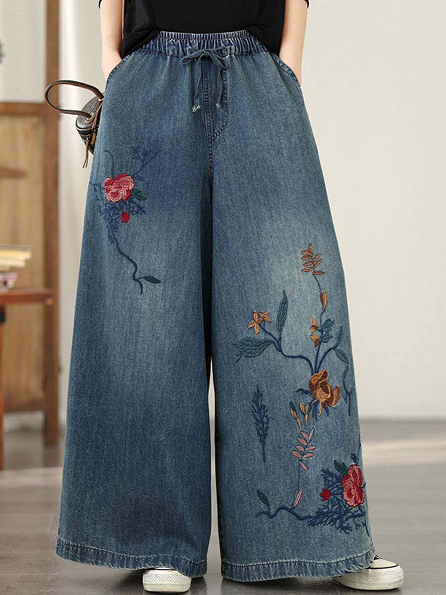 Women Spring Vintage Denim Flower Embroidery Wide-leg Pants