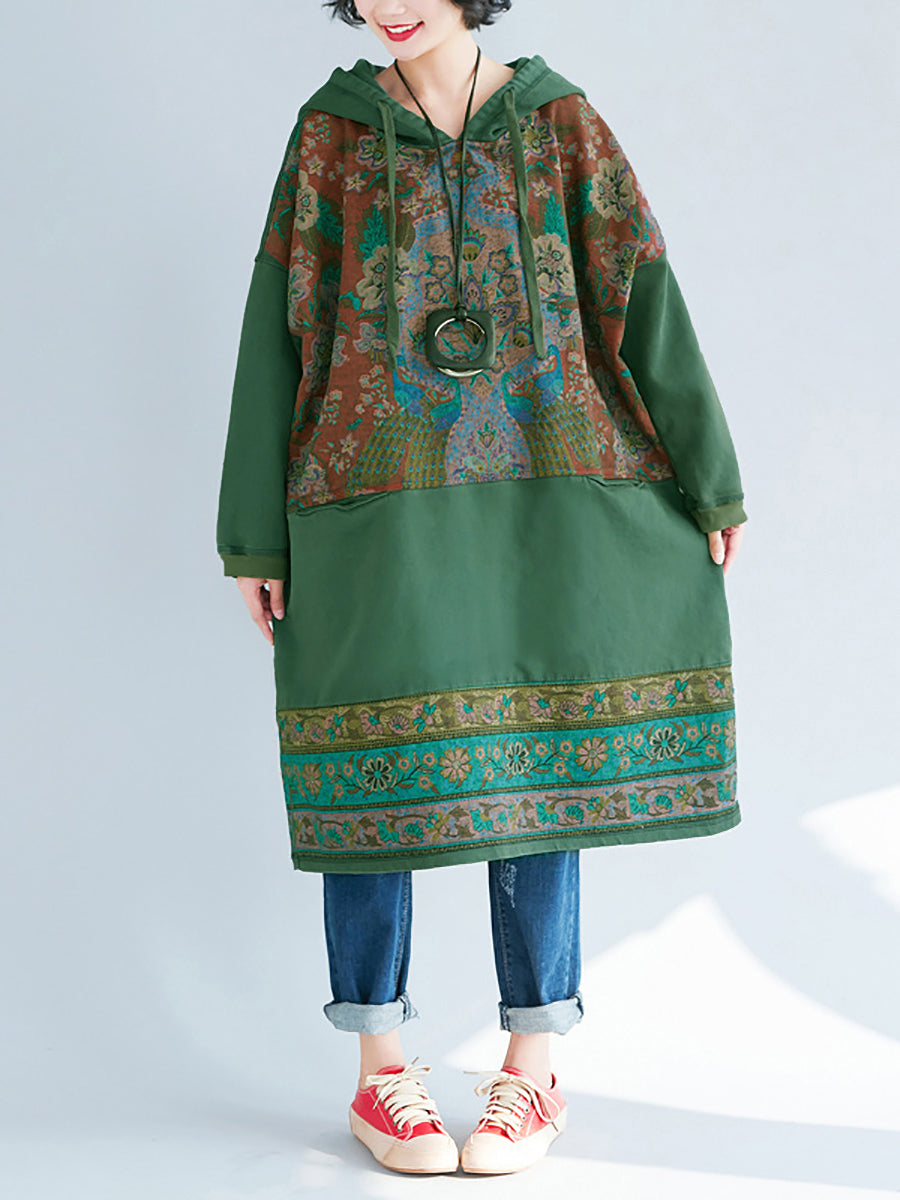 Plus Size Women Ethnic Flower Spliced Long Pocket Hooded Dress