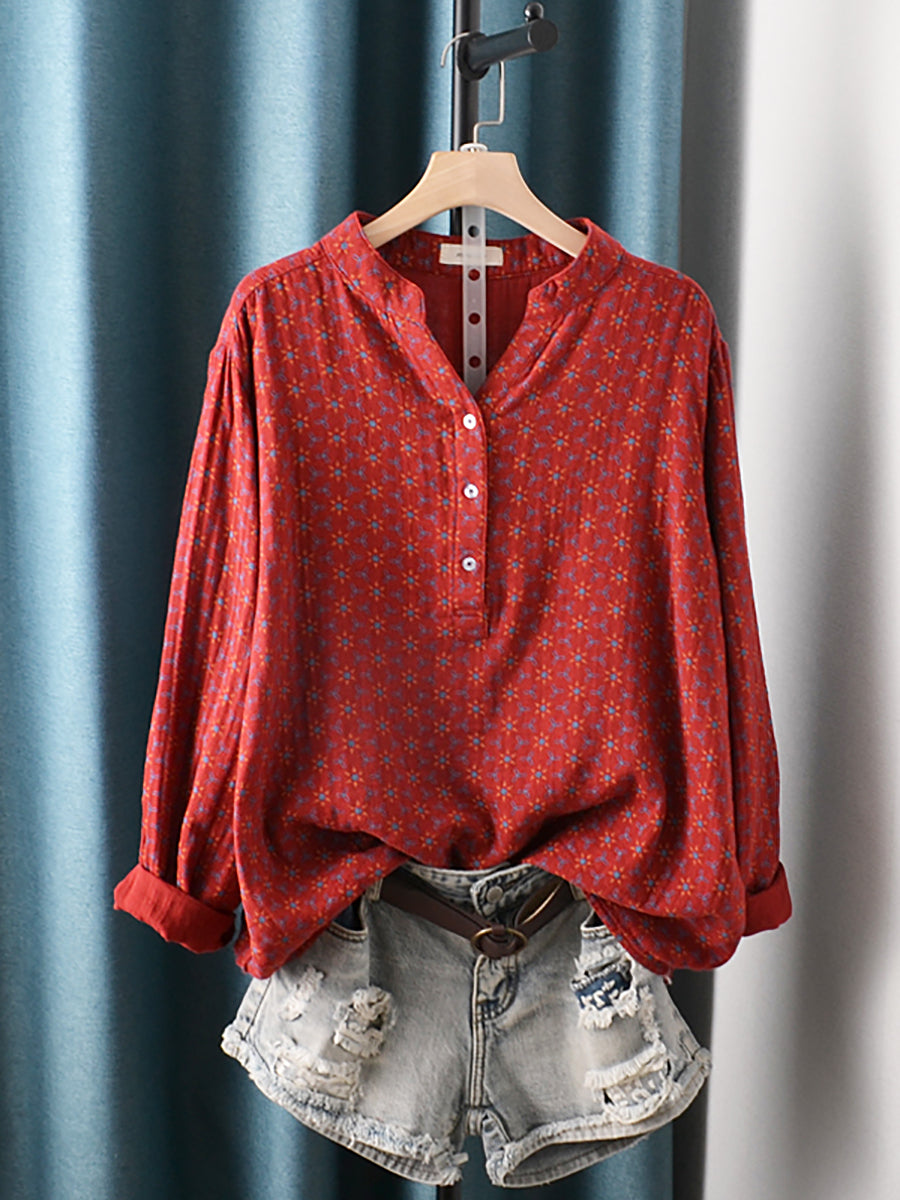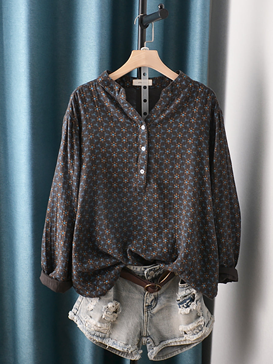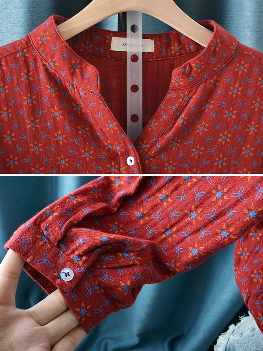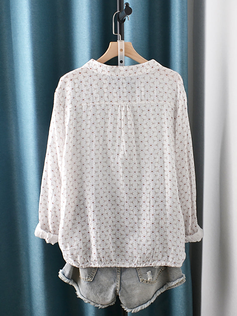 Women Artsy Floral 100%Cotton Stand Collar Blouse