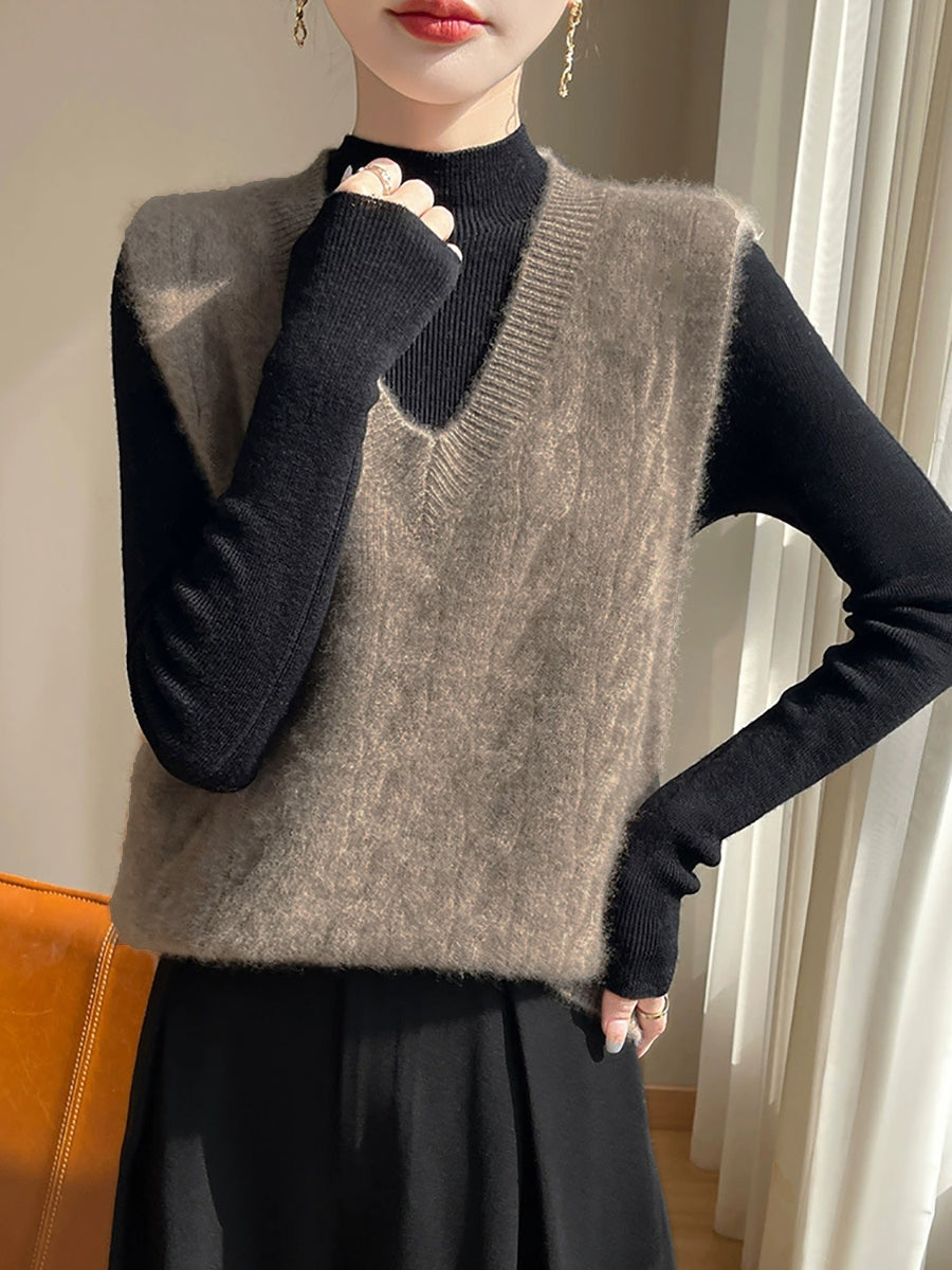 Women Autumn Casual Pure Color V-Neck Knitted Vest