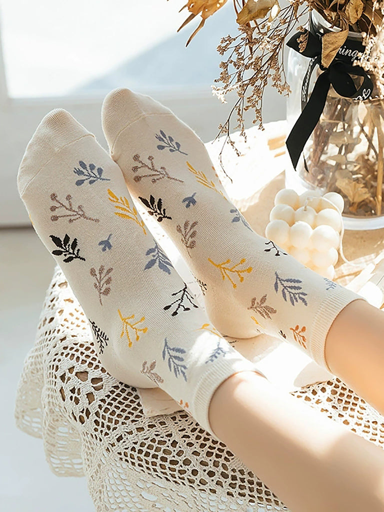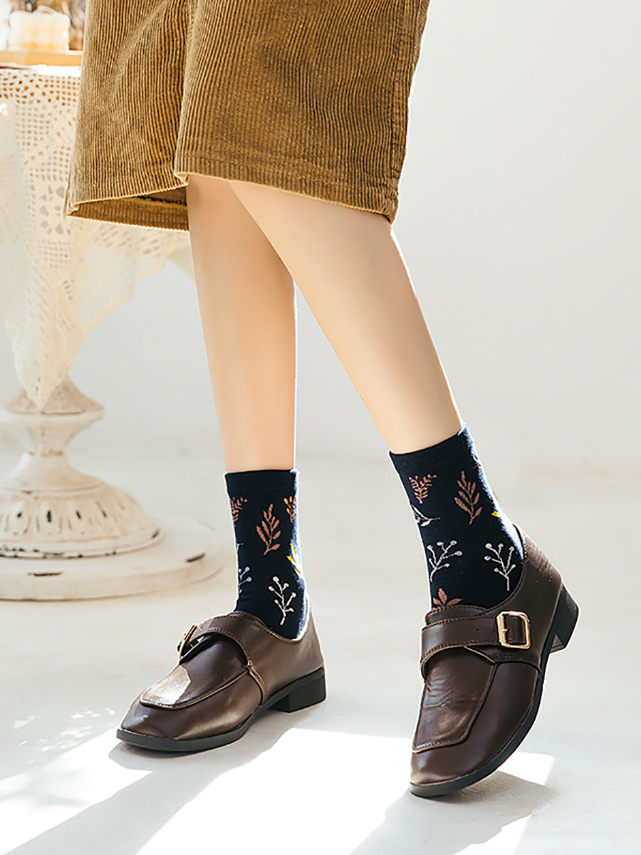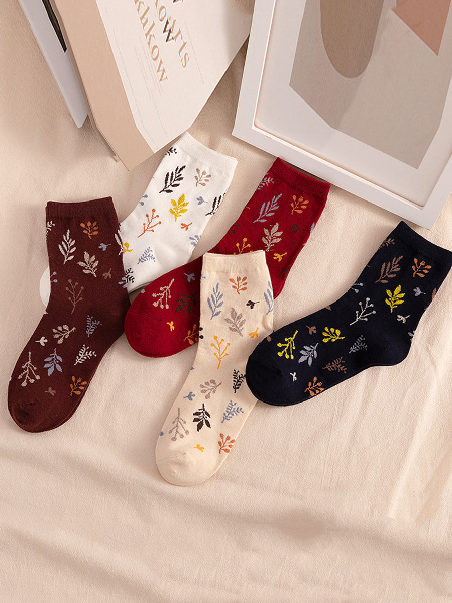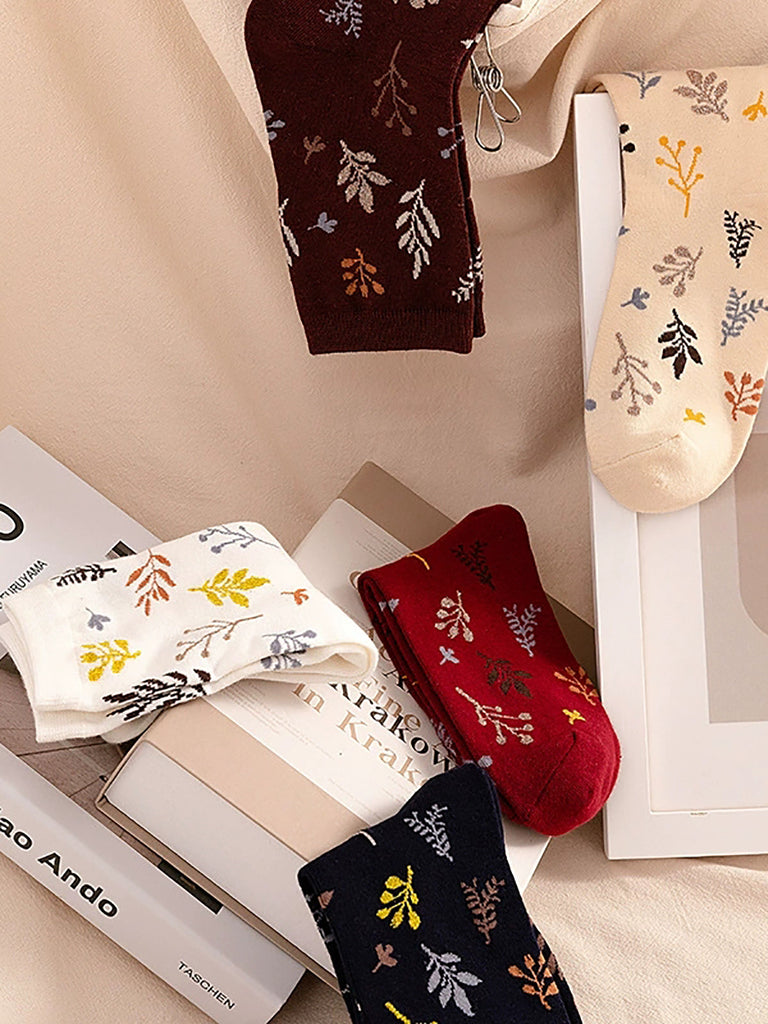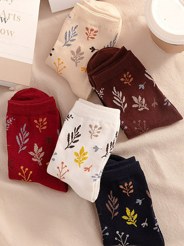 5 Pairs Women Artsy Vintage Leaf Cotton Socks