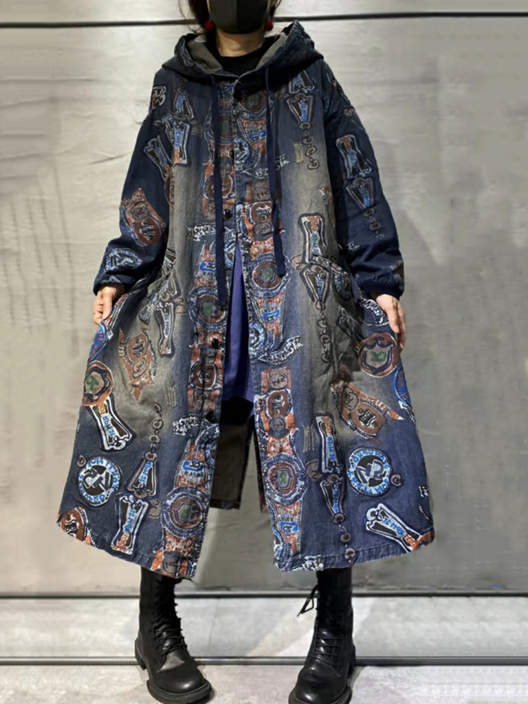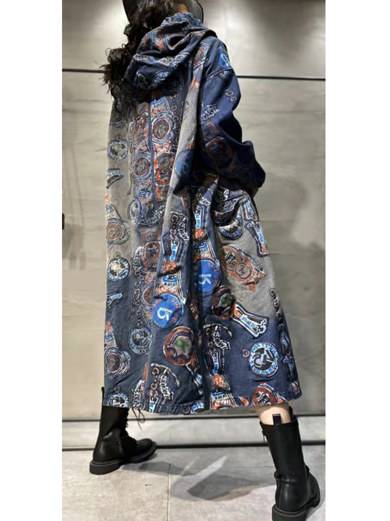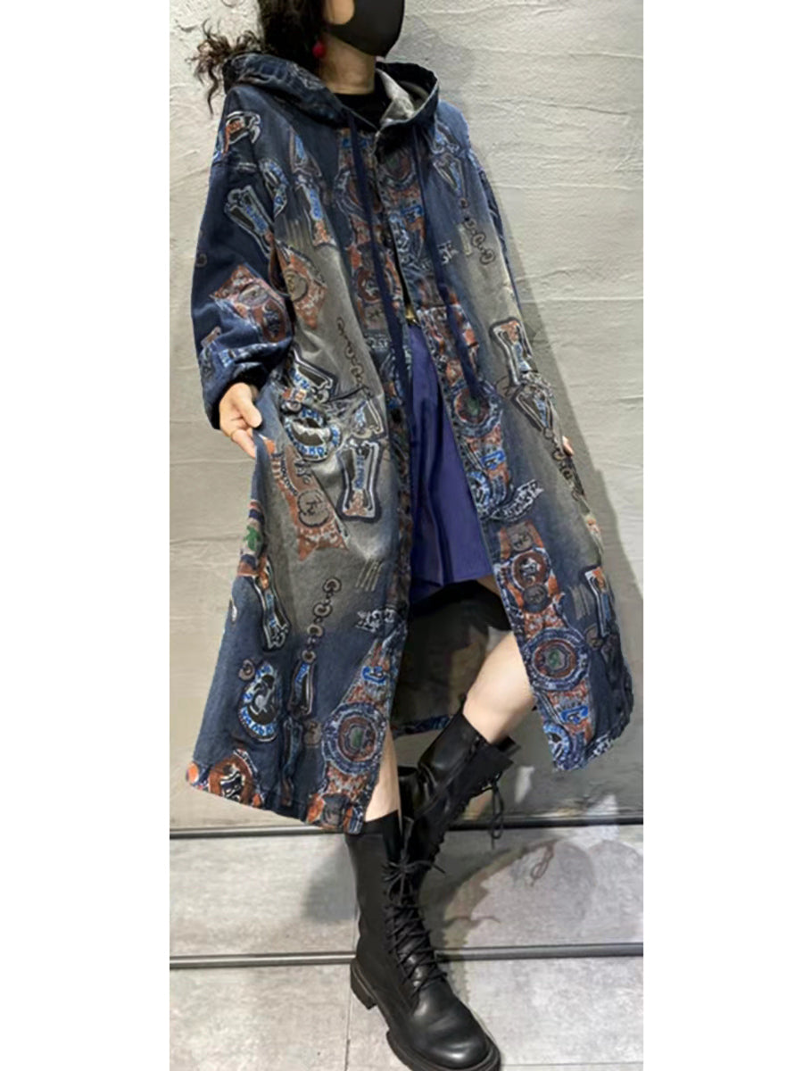 Women Autumn Vintage Flower Hooded Denim Long Coat