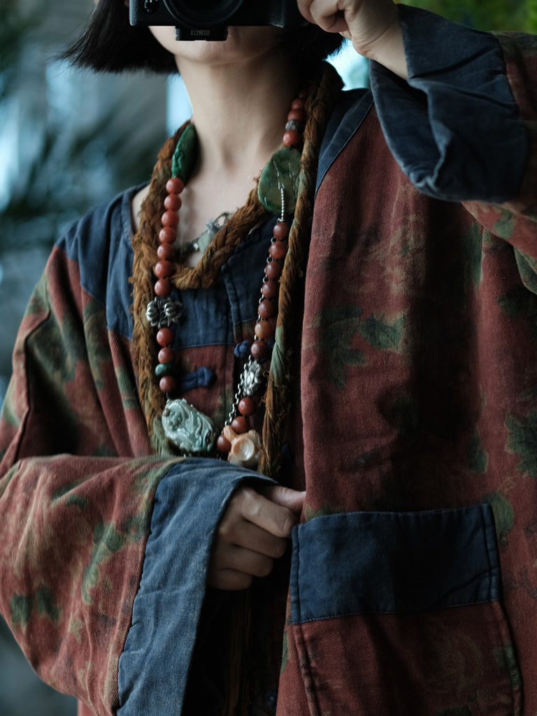 Women Autumn Vintage Flower Spliced O-Neck Padded Coat