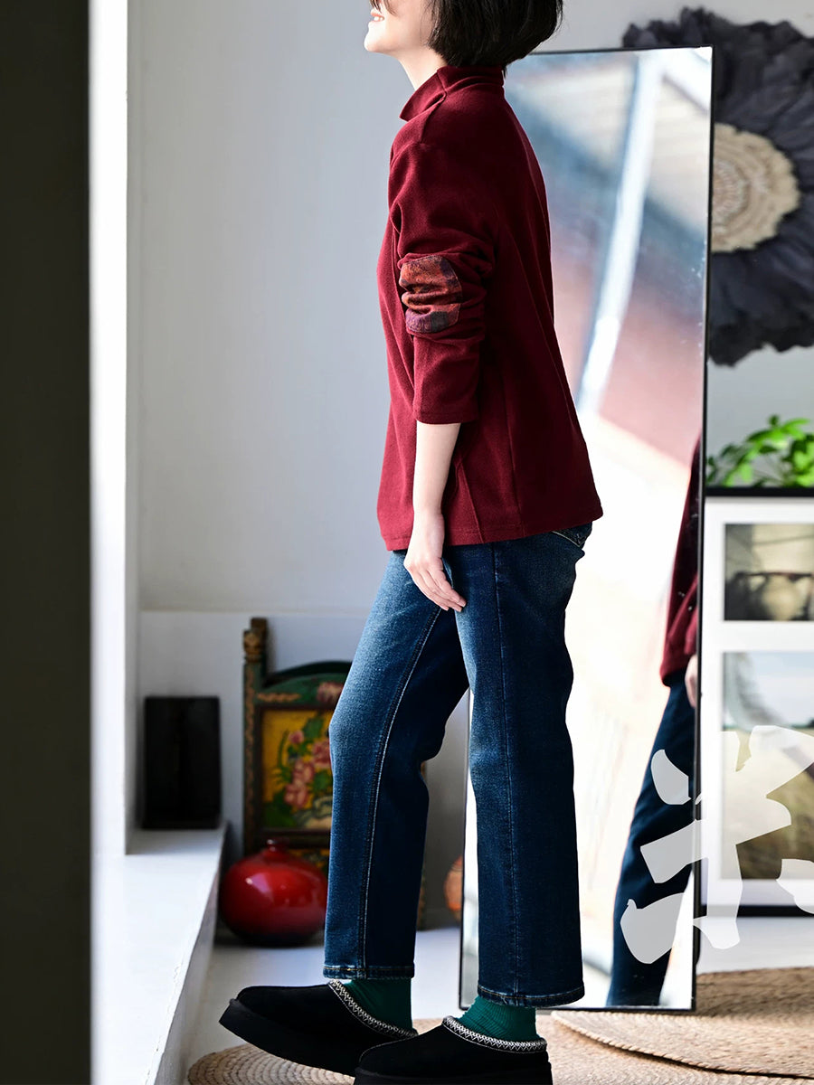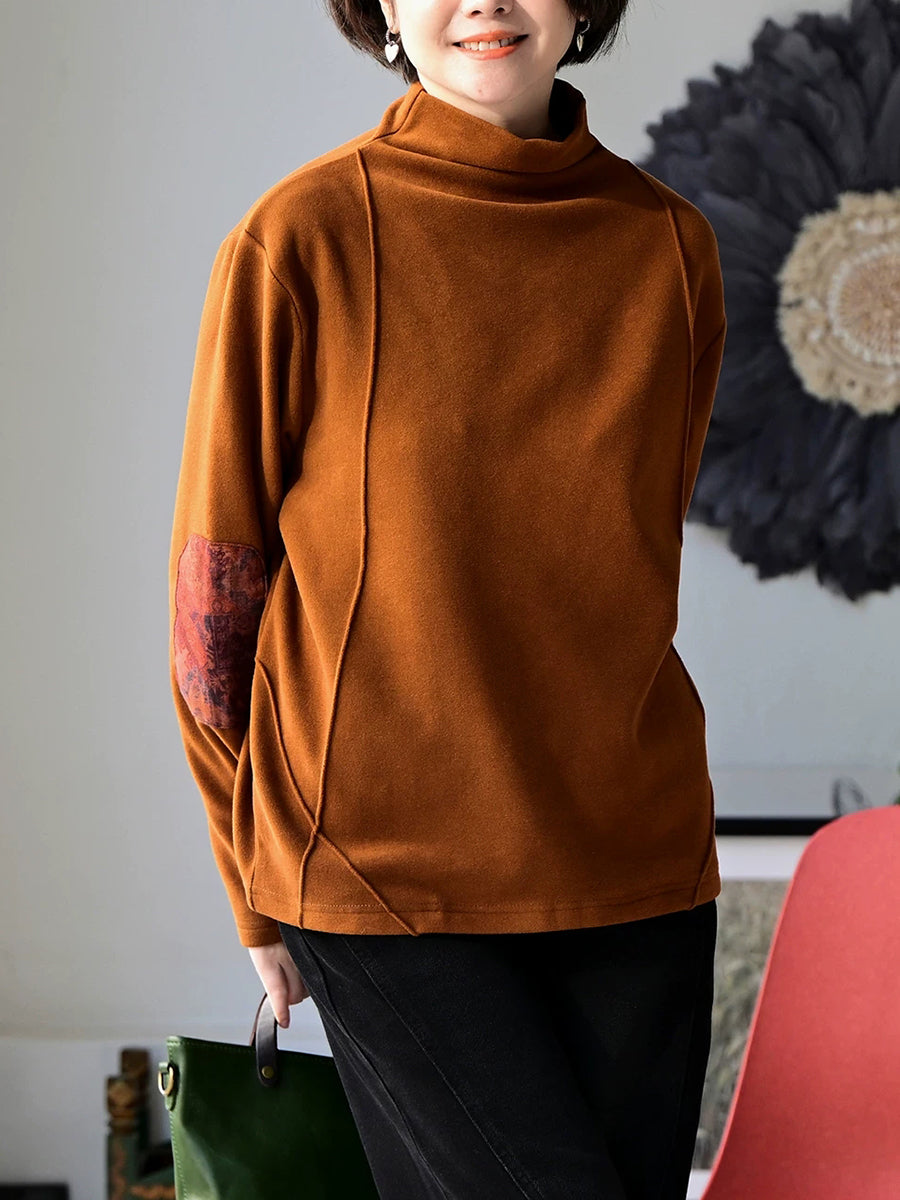Women Spring Retro Patch Cotton Turtleneck Blouse