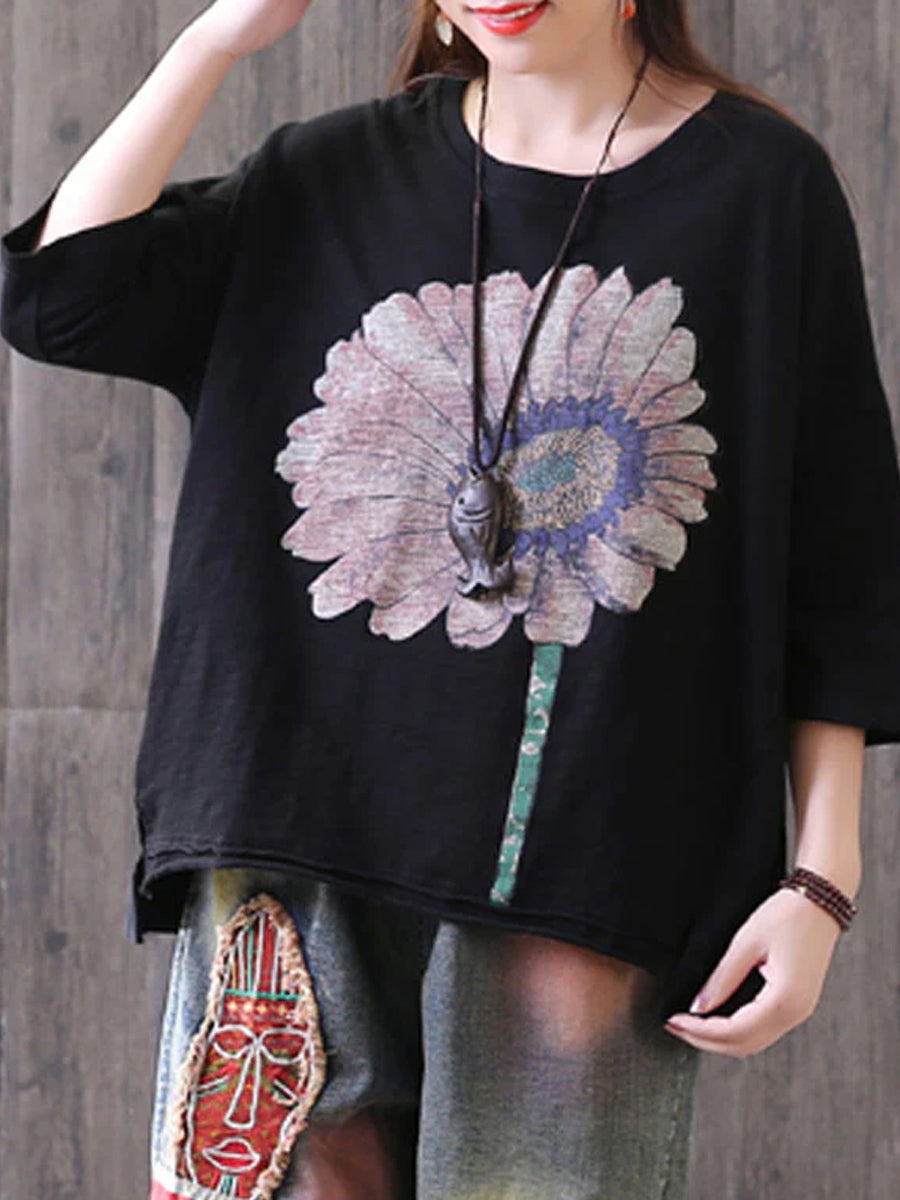 • Loose cotton sunflower printed red top, has a round neck, three quarter sleeve, you'll enjoy wearing across spring, summer, autumn.