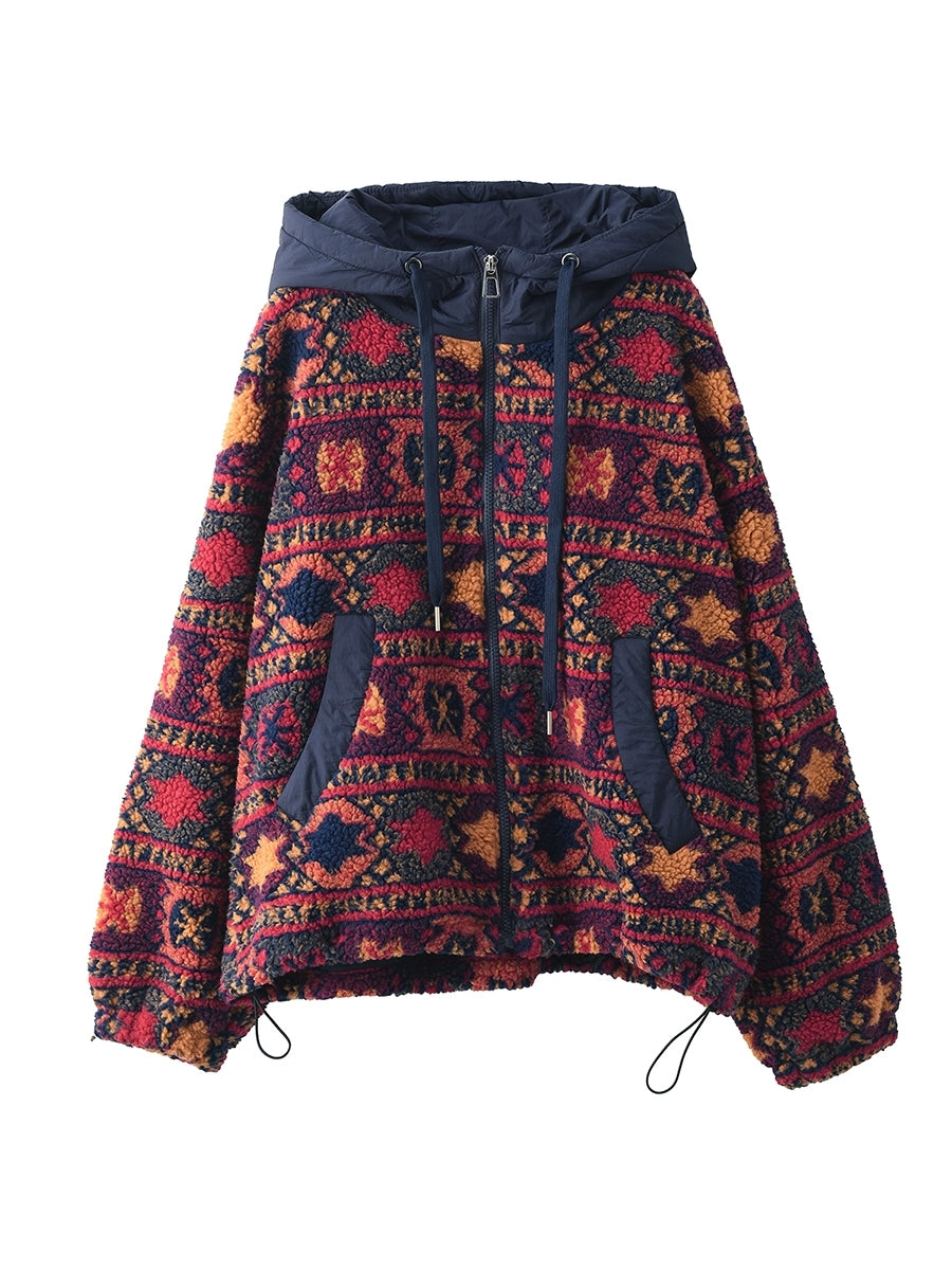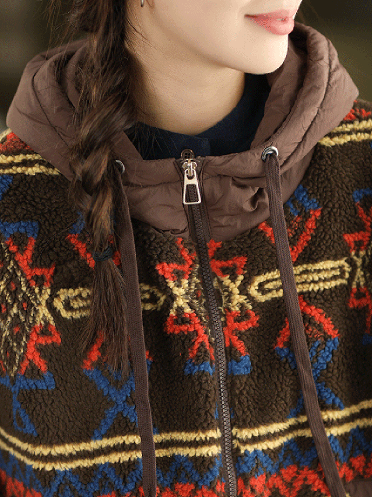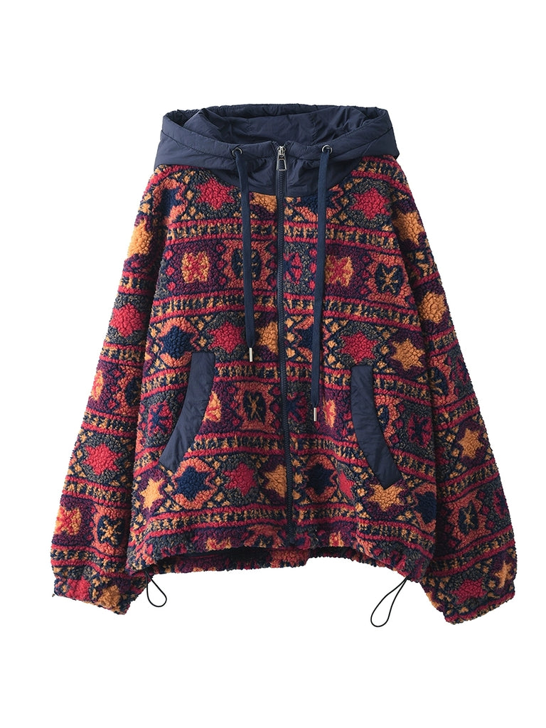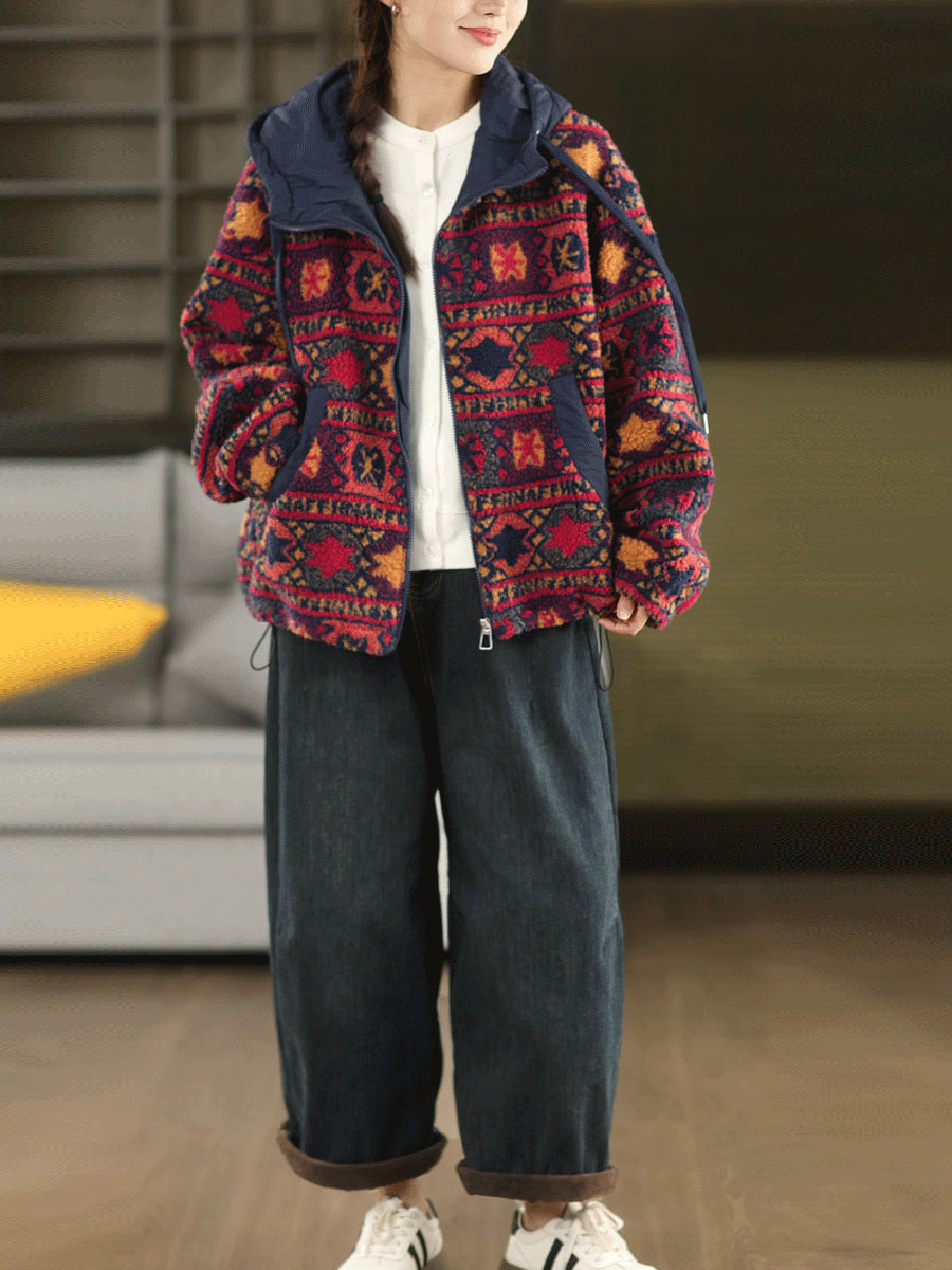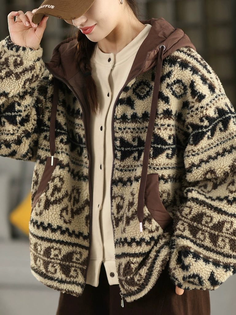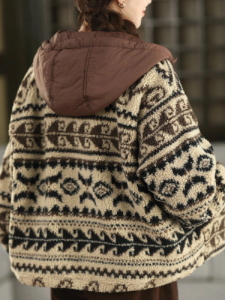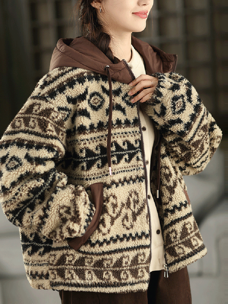 Featuring a printed design, this vintage-inspired fleece coat for women includes a hooded collar and full-length regular sleeves. Perfectly suited for autumn and winter seasons, it combines classic style with warmth and comfort.