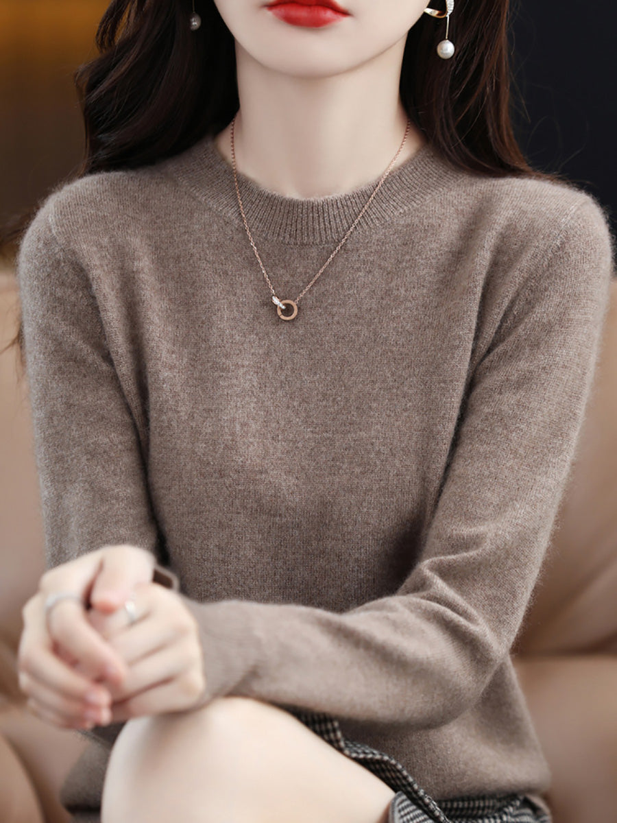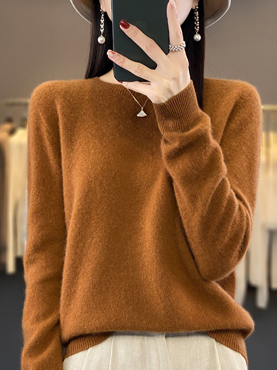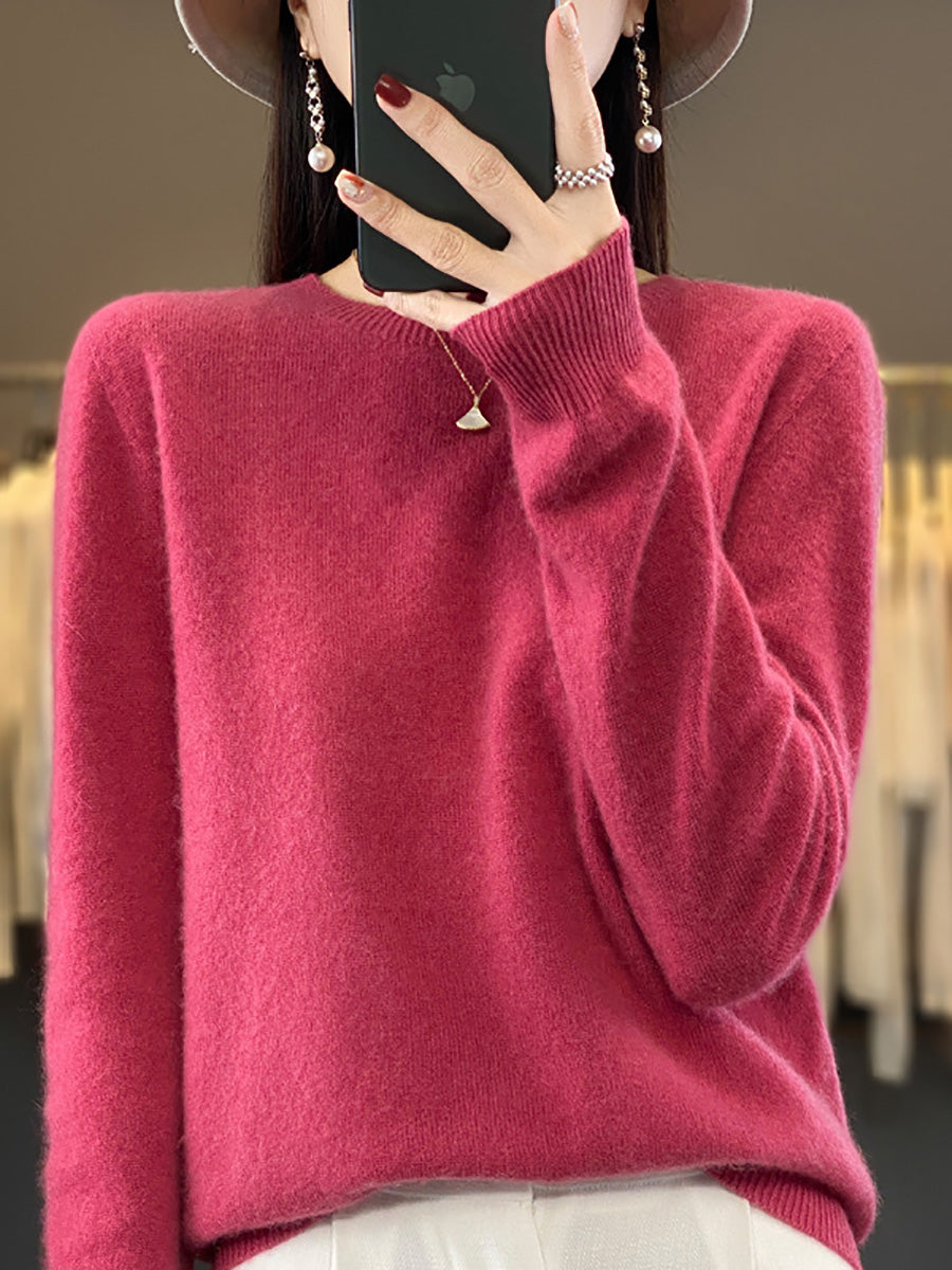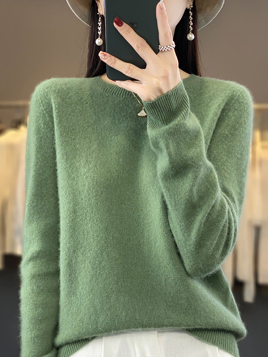 Women Autumn Artsy Pure Color Wool O-Neck Sweater