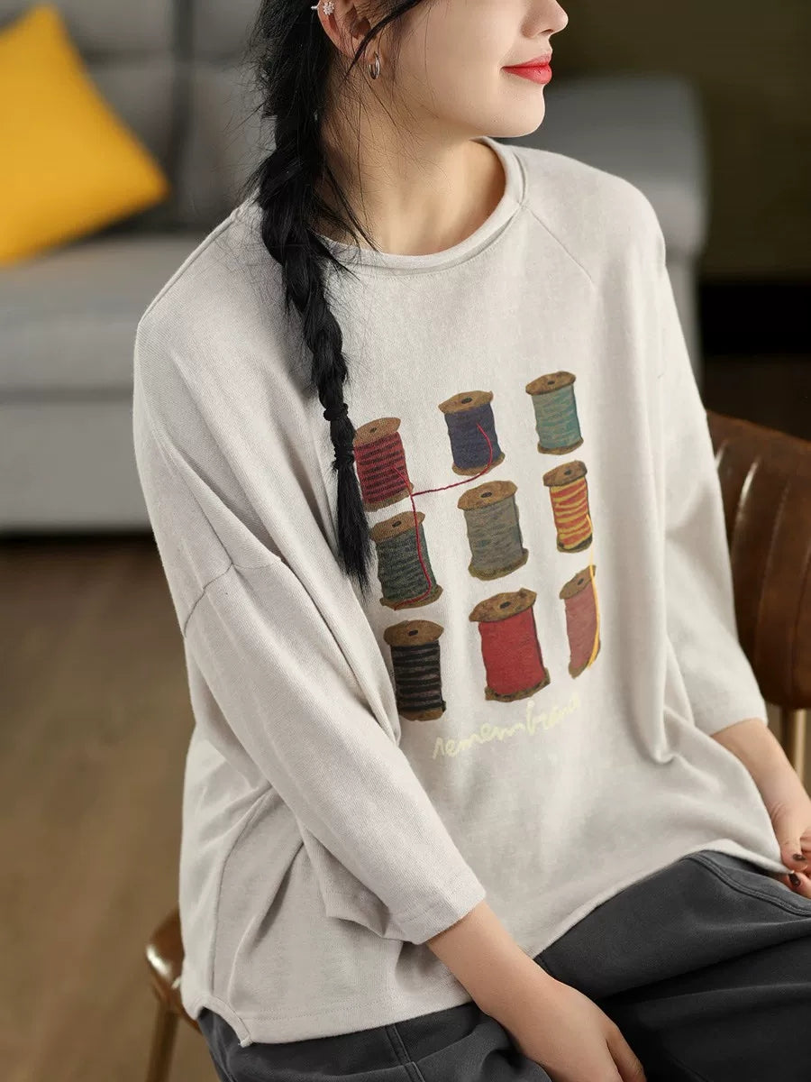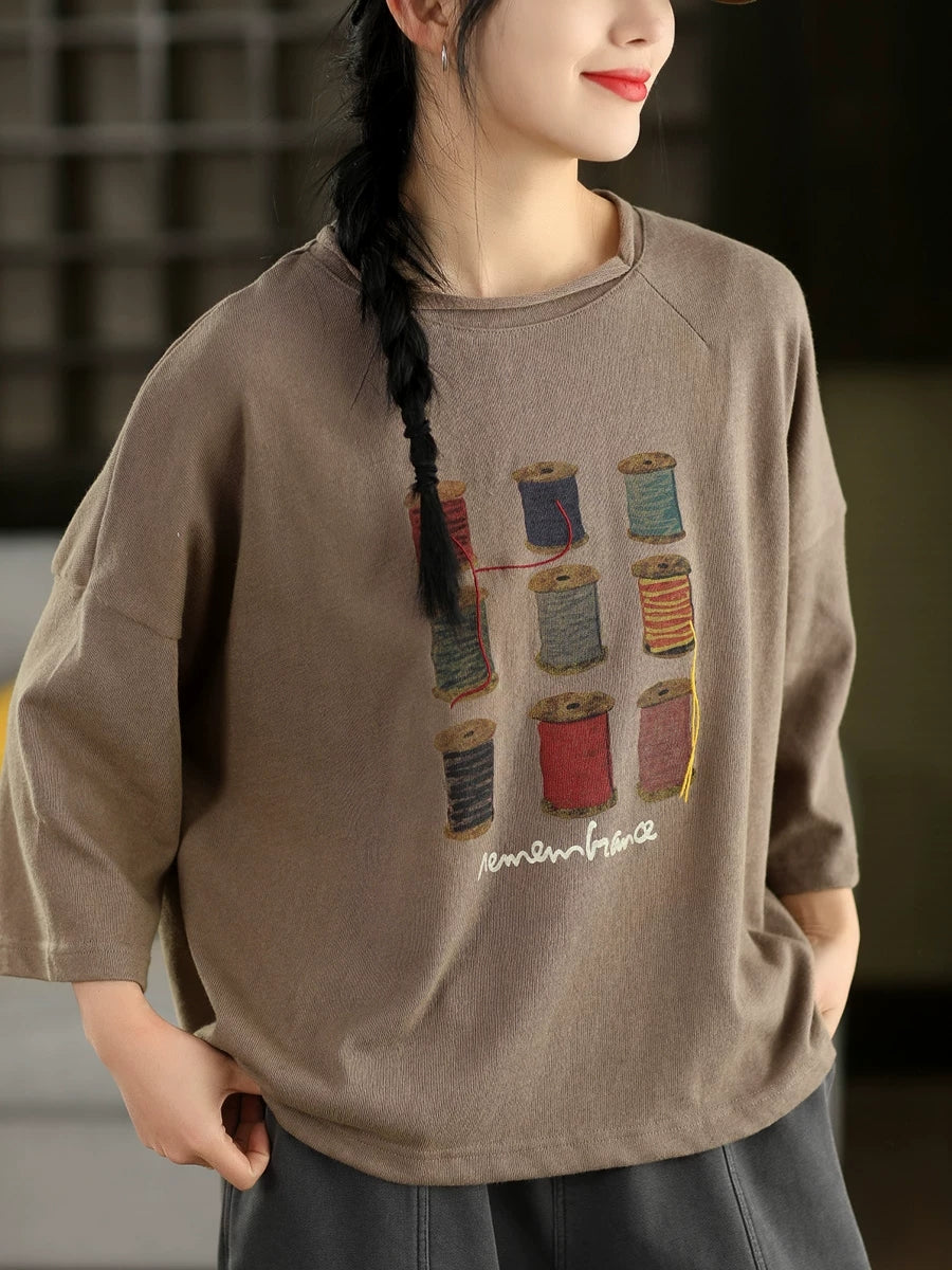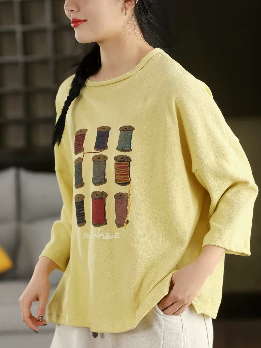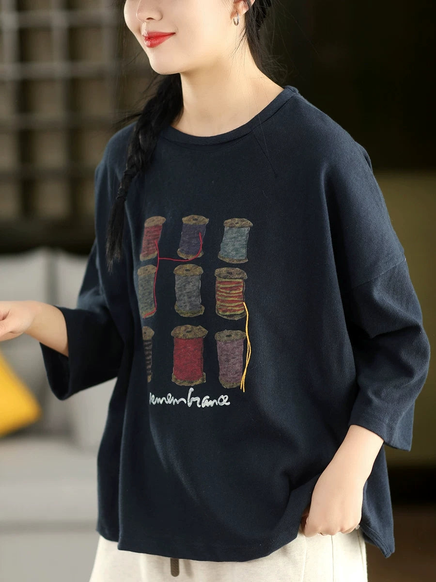 Women Spring Artsy Print Cotton O-Neck Blouse