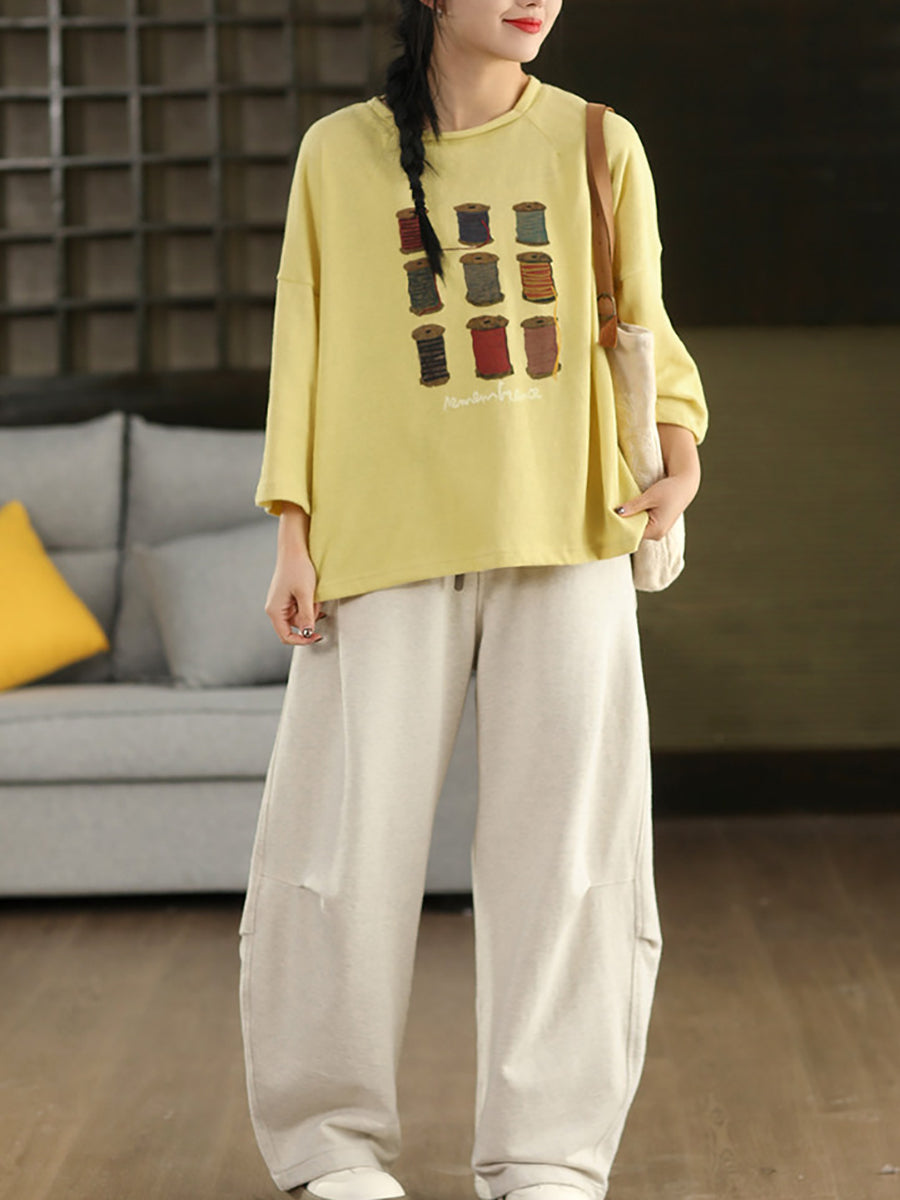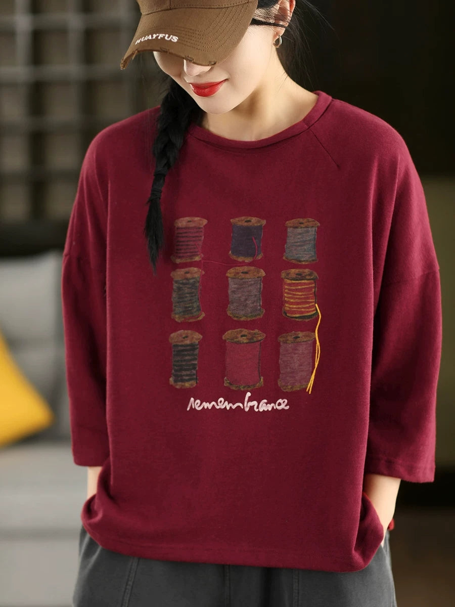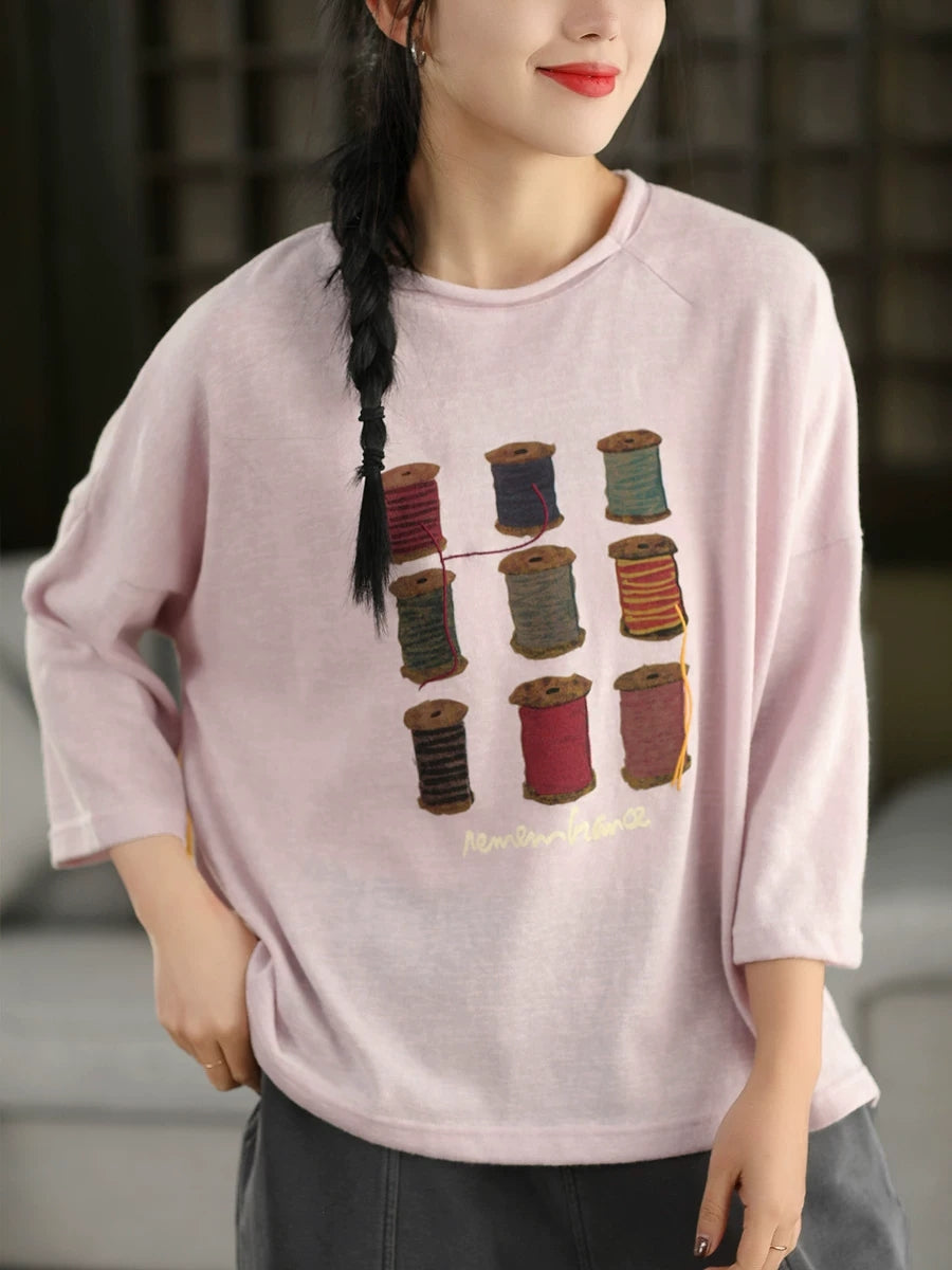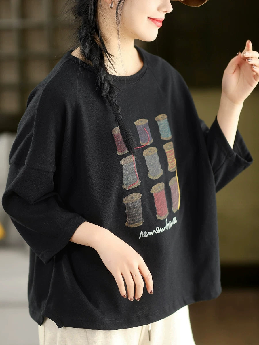 Women Spring Artsy Print Cotton O-Neck Blouse