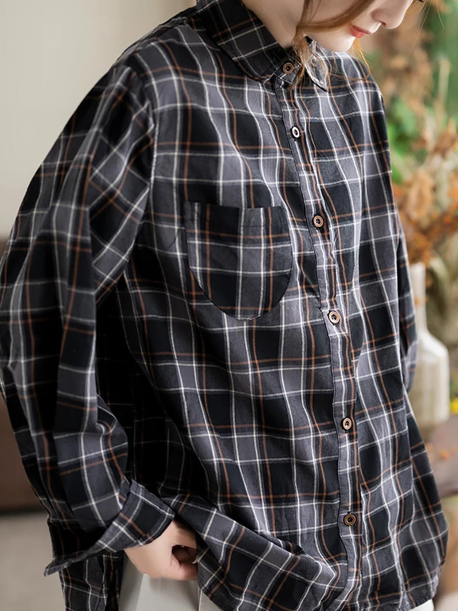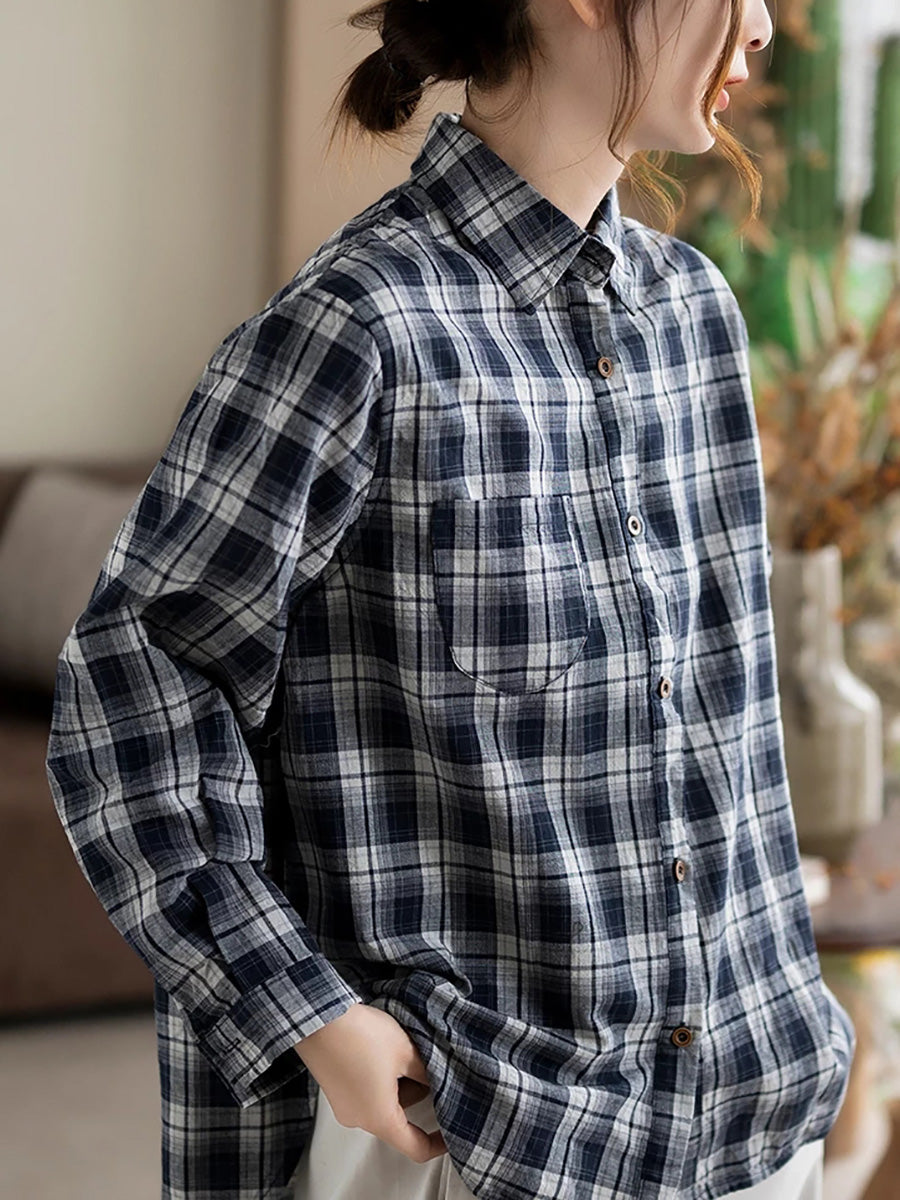 Women Spring Retro Plaid Cotton Turn-down Collar Shirt