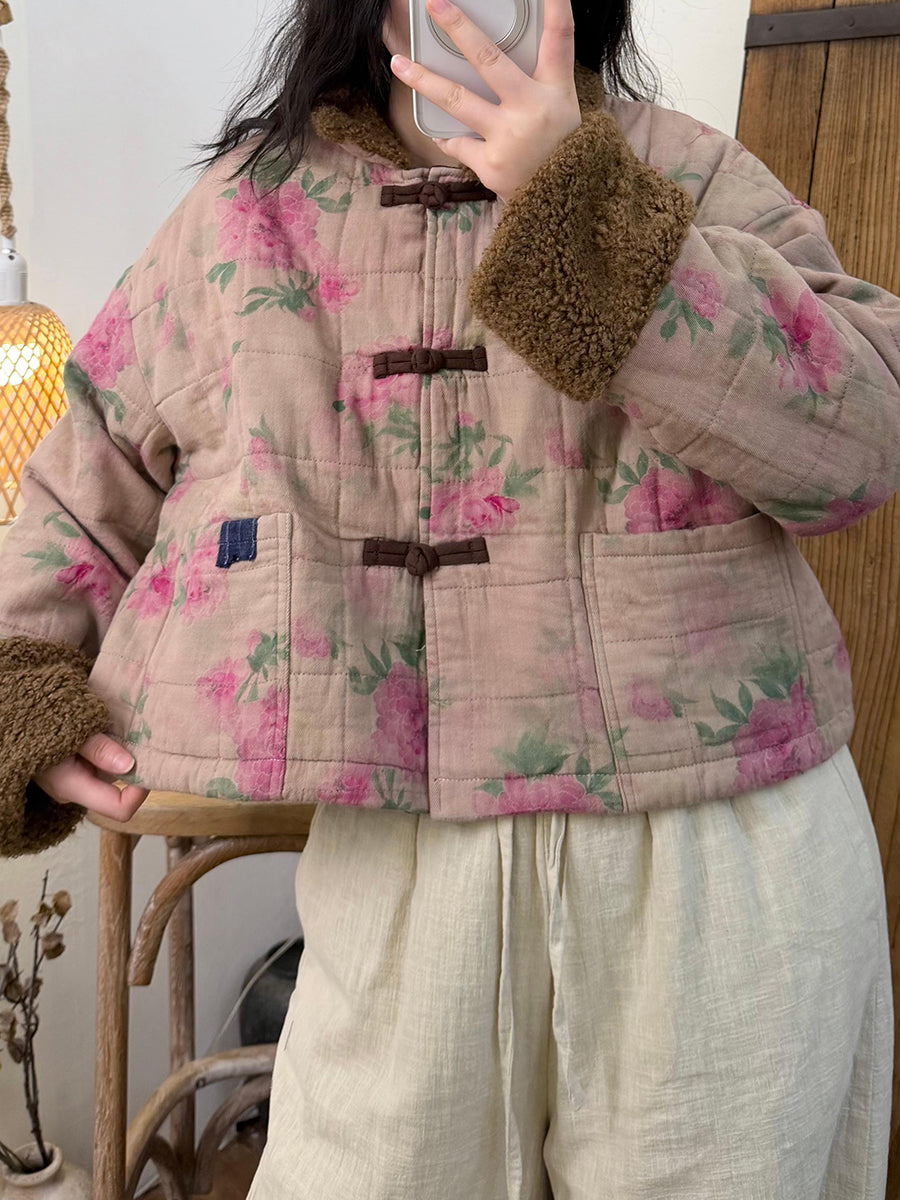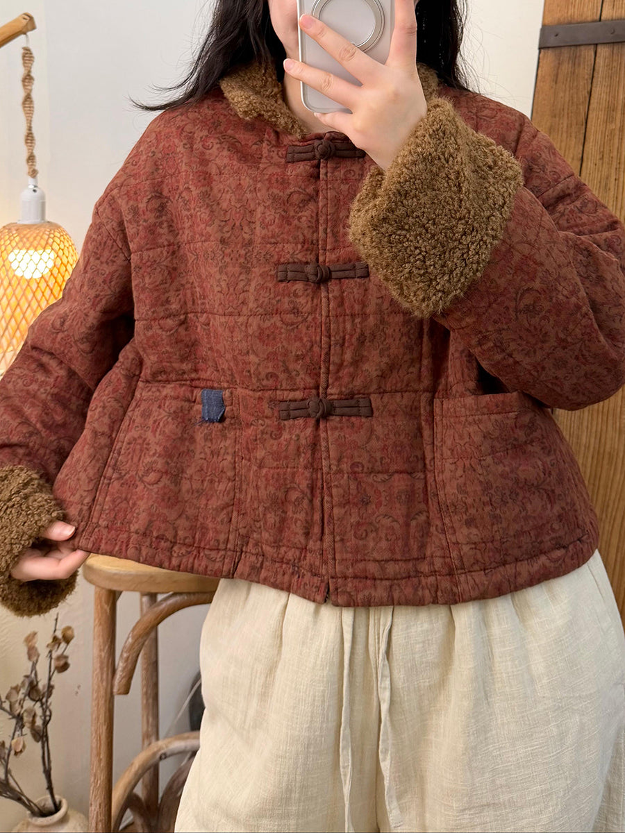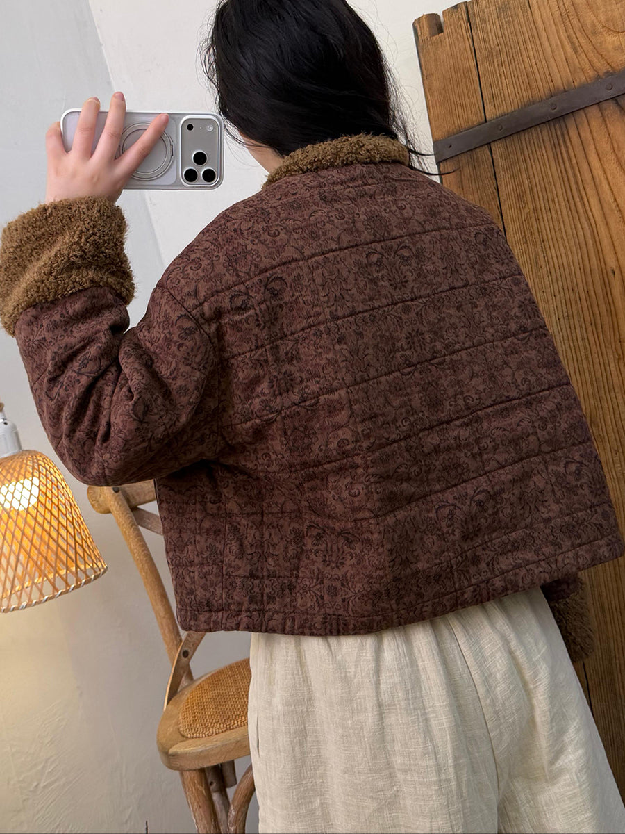 Women Winter Retro Print Fleece Spliced O-Neck Padded Coat