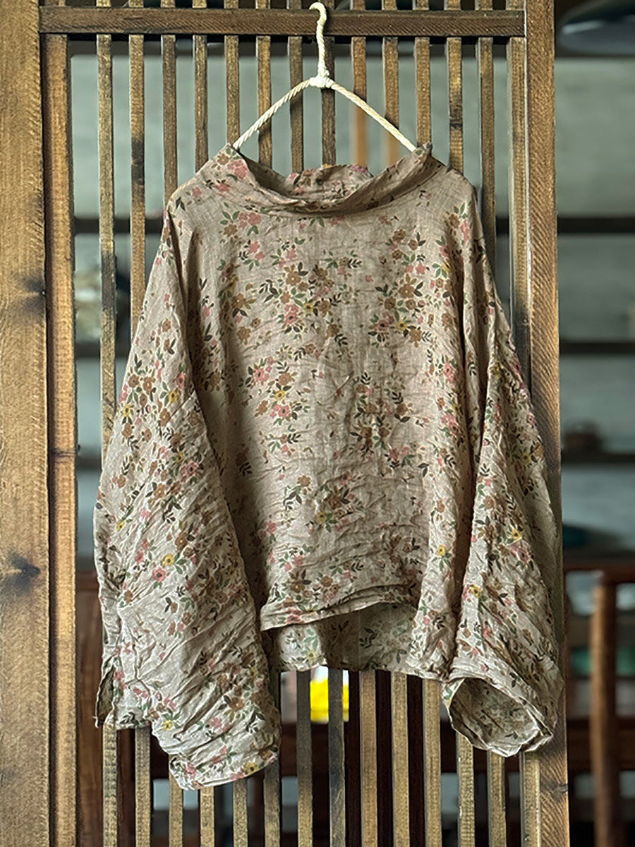This blouse features a stylish turtleneck collar, full sleeves with raglan style and a retro-inspired autumn flower pattern. Perfect for wearing in the spring and fall seasons. Made of high-quality Ramie material.