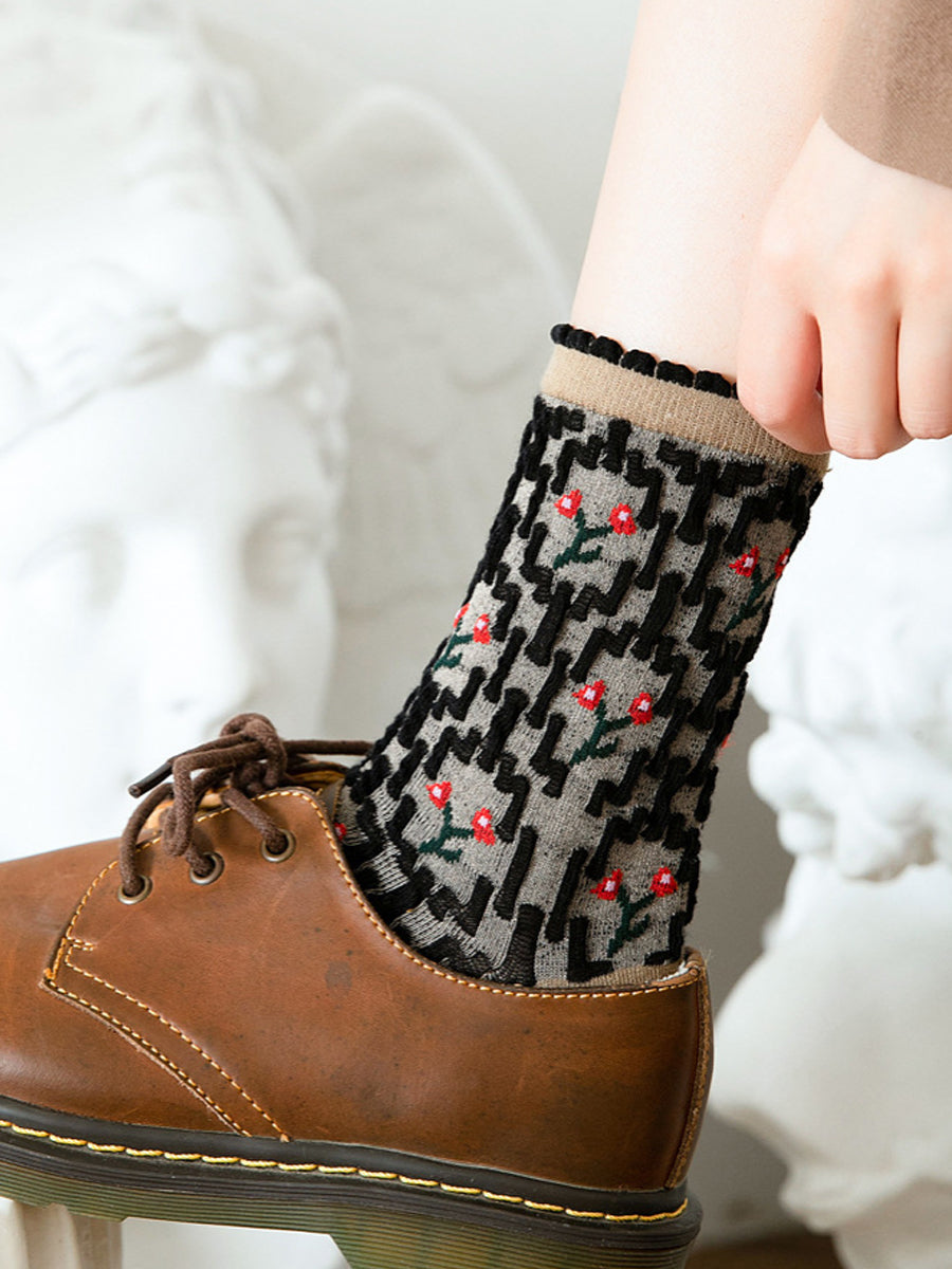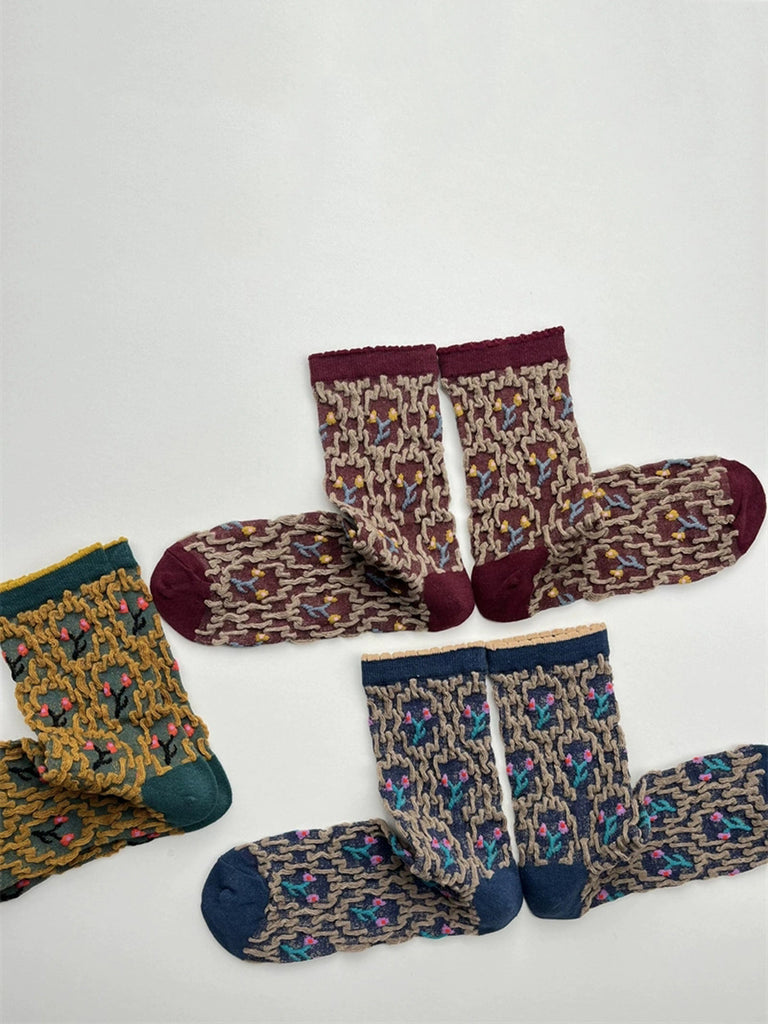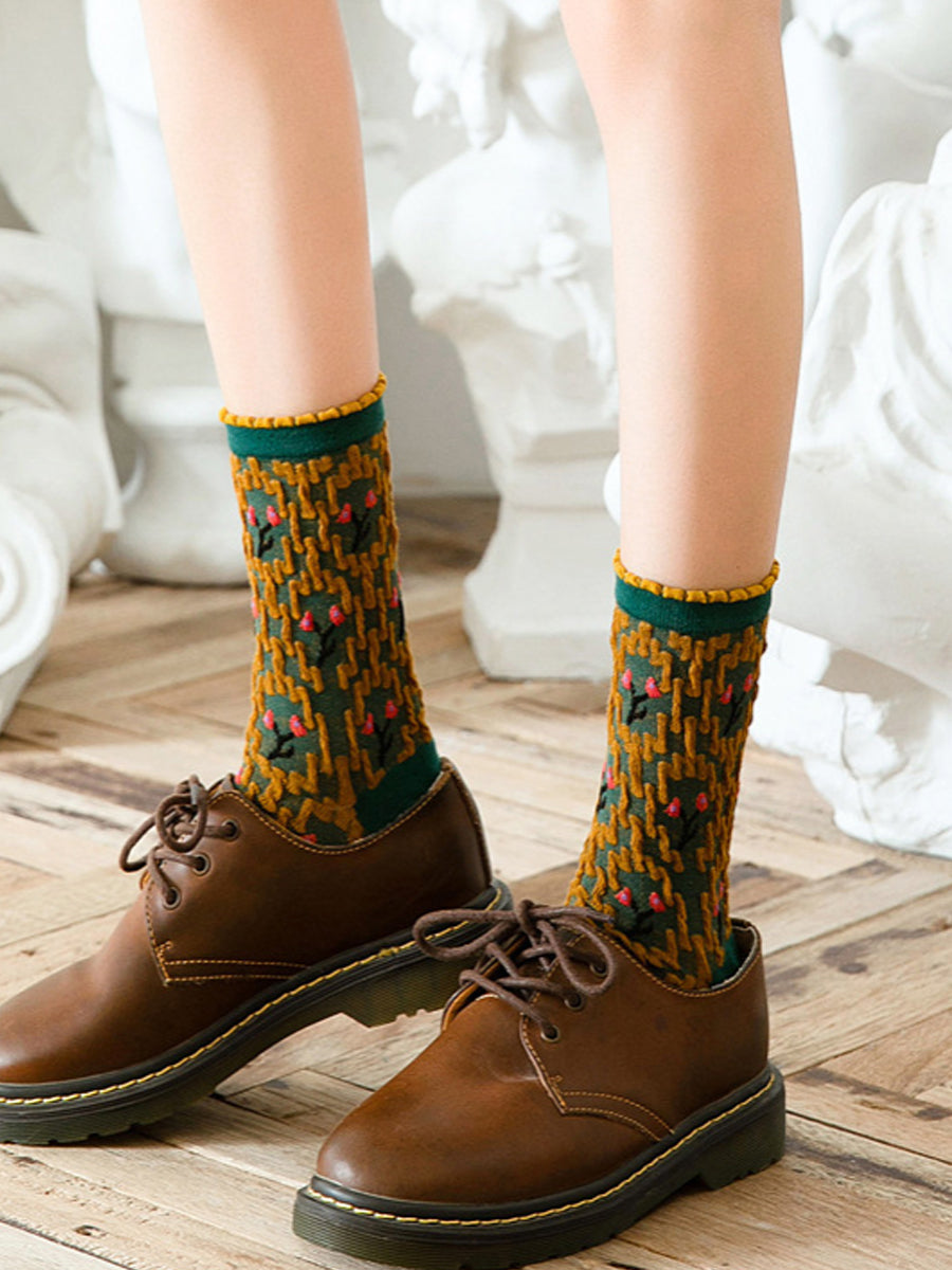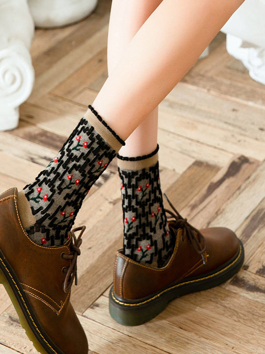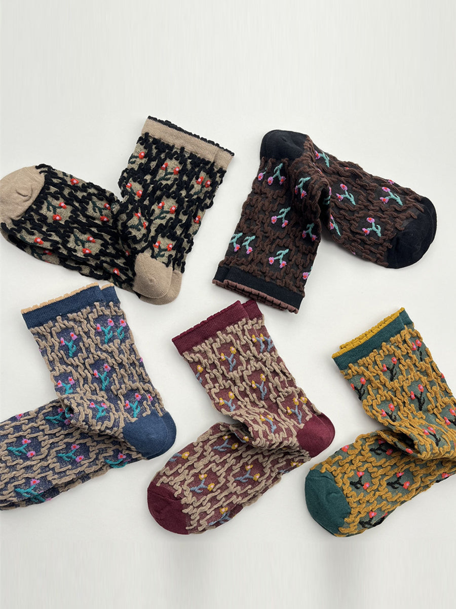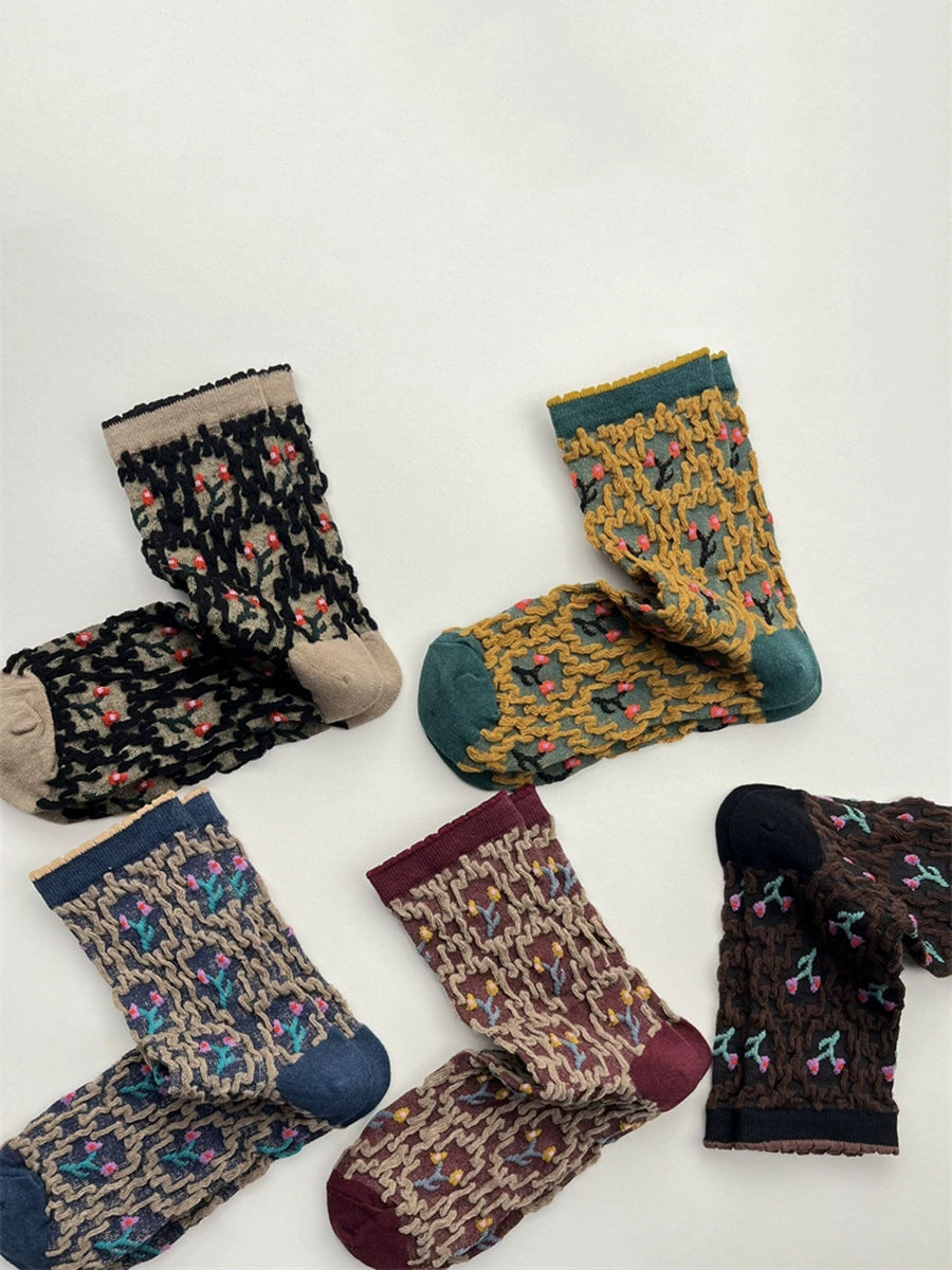 5 Pairs Women Artsy Cherry Jacquard Thick Socks