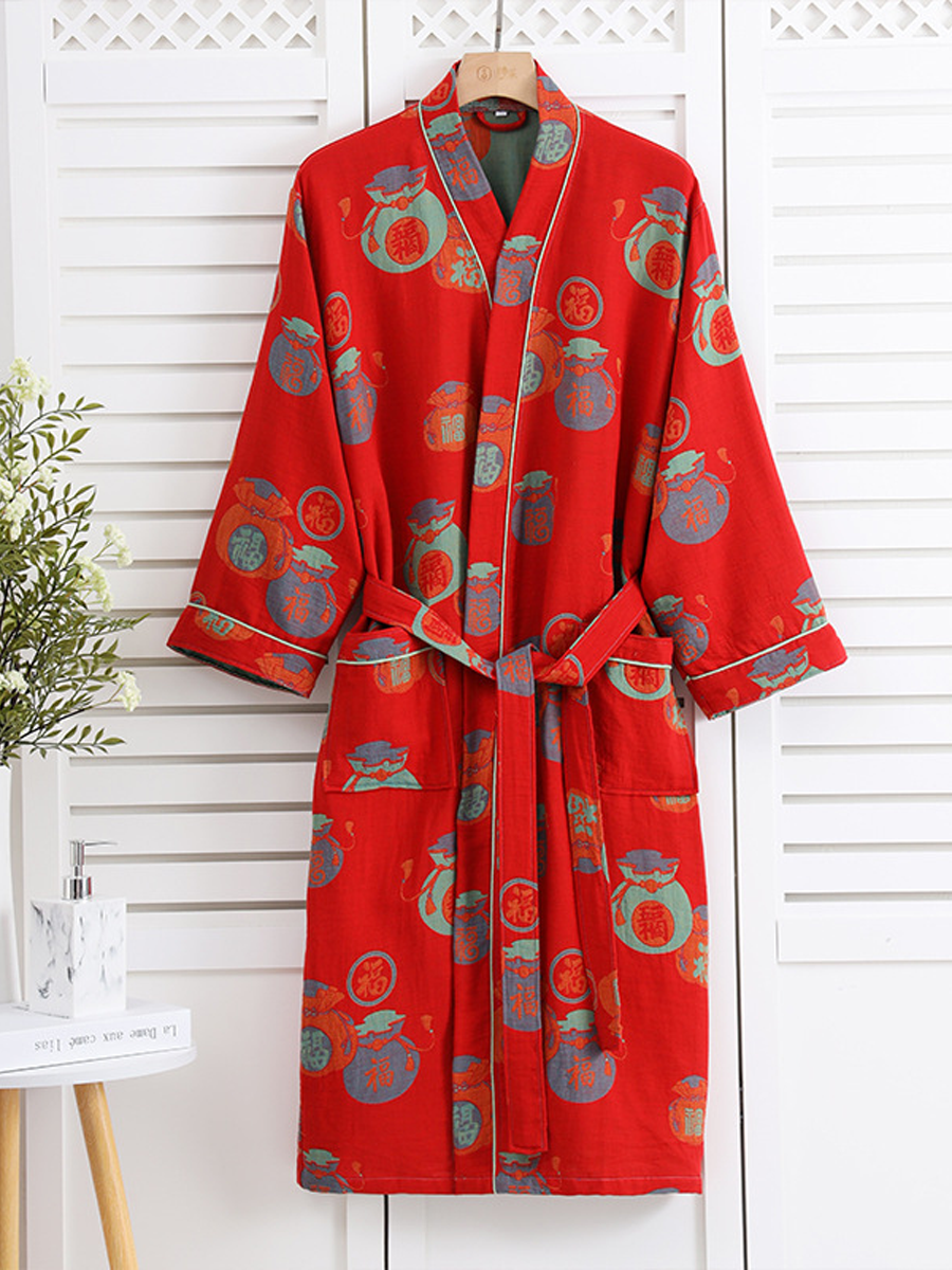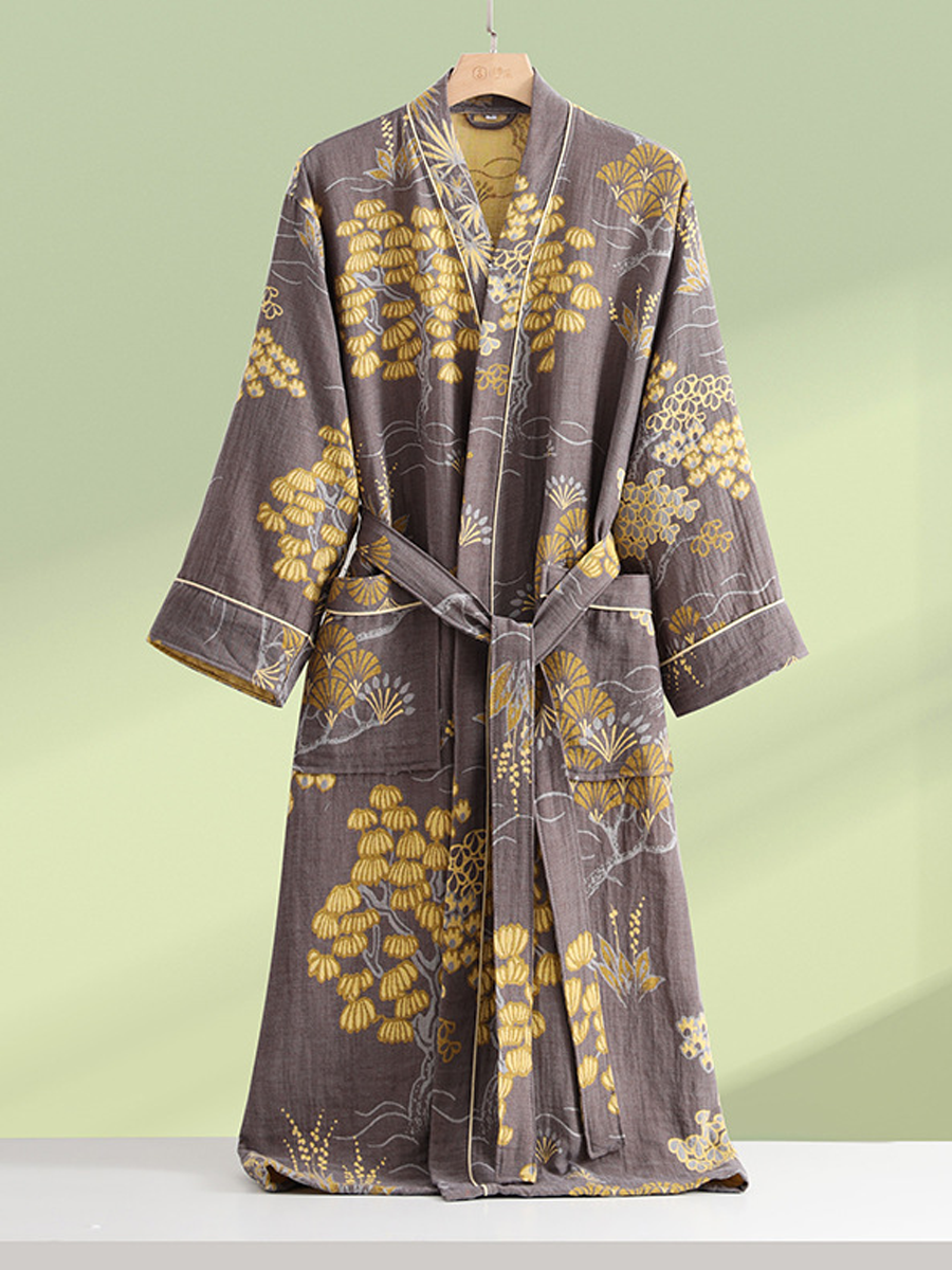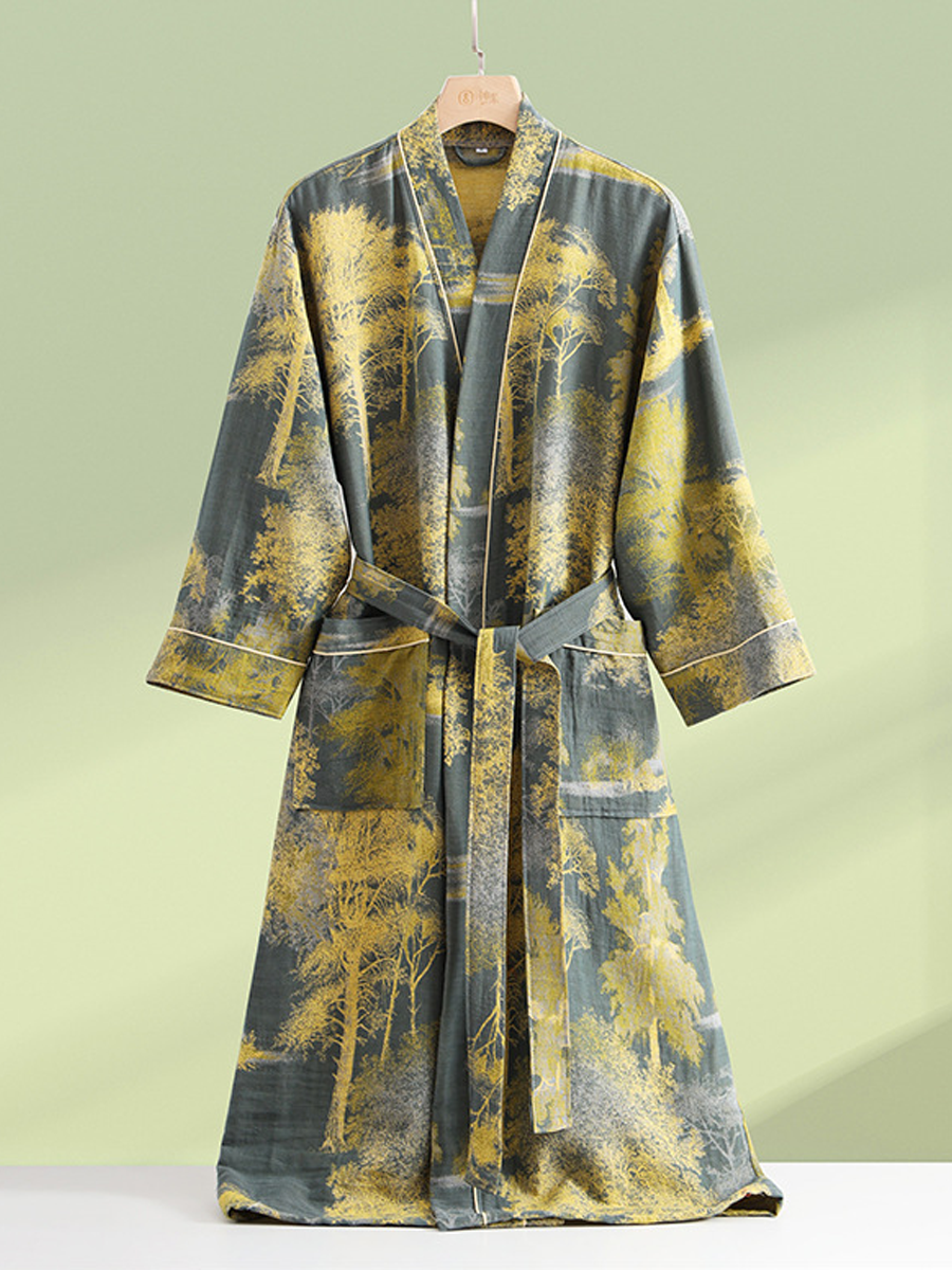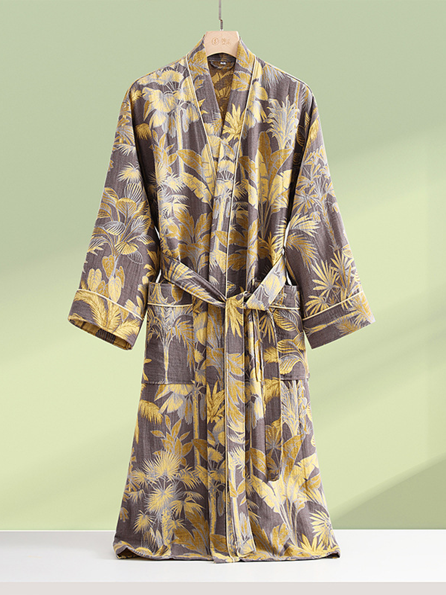 Crafted from 100% premium Xinjiang cotton, this double-layer gauze bathrobe is lightweight, breathable, and highly absorbent. The loose fit and soft, comfortable fabric provide a cozy, relaxed feel. Featuring an elegant floral pattern, wide cuffs, long sleeves, and a refined belt, this robe effortlessly blends simplicity and sophistication.