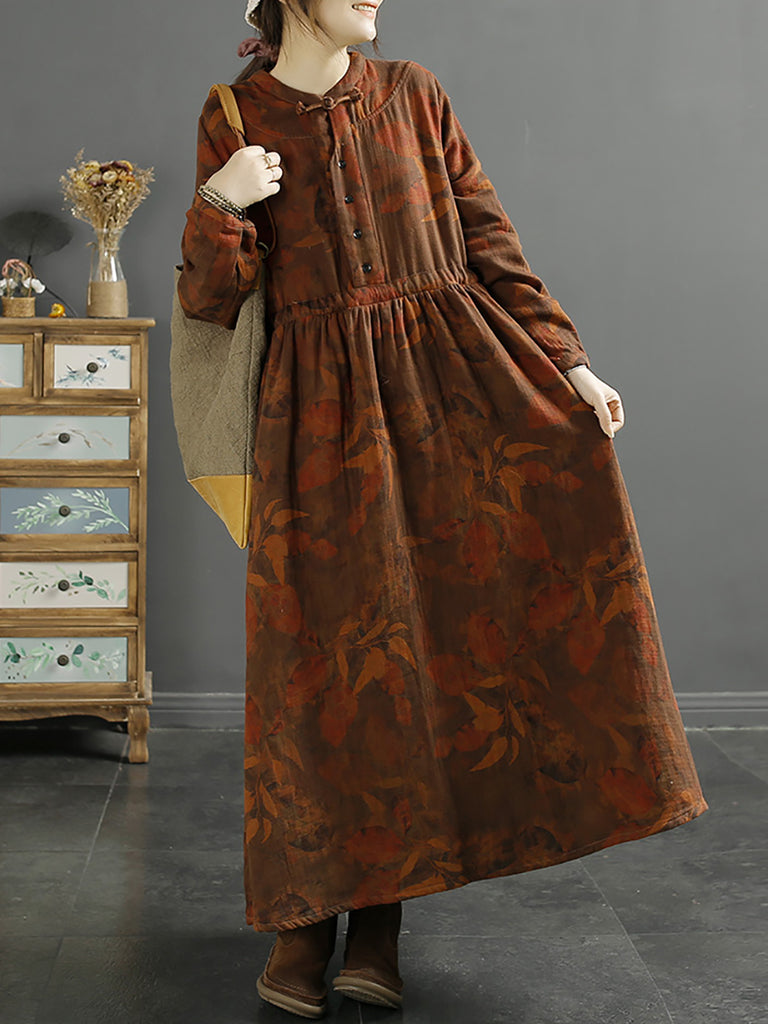 Plus Size Women Autumn Vintage Leaf Print Cotton Dress