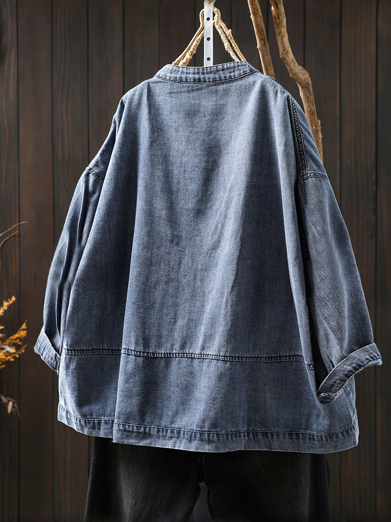 Plus Size Women Summer Retro Pure Color Stand Collar Denim Coat