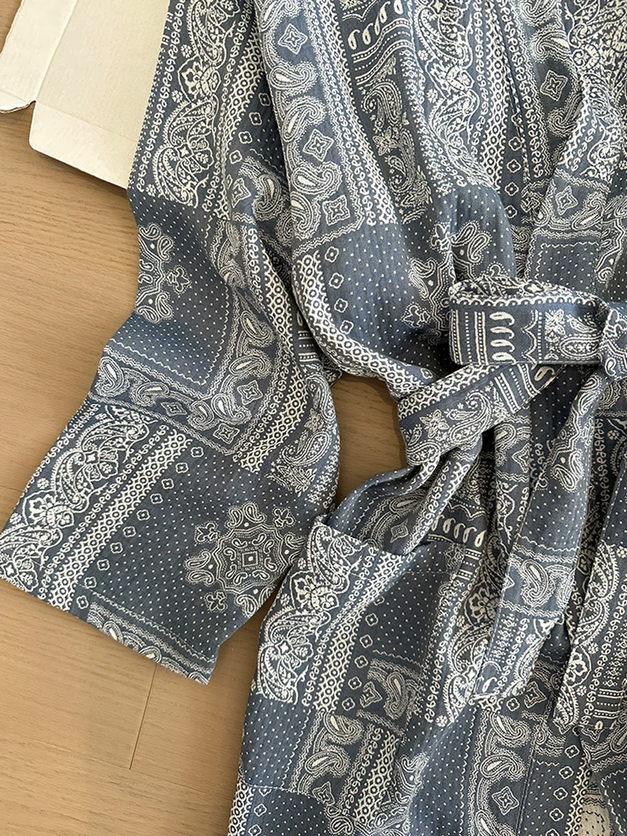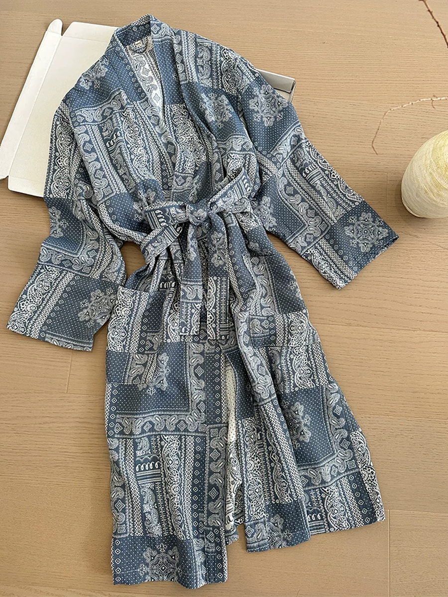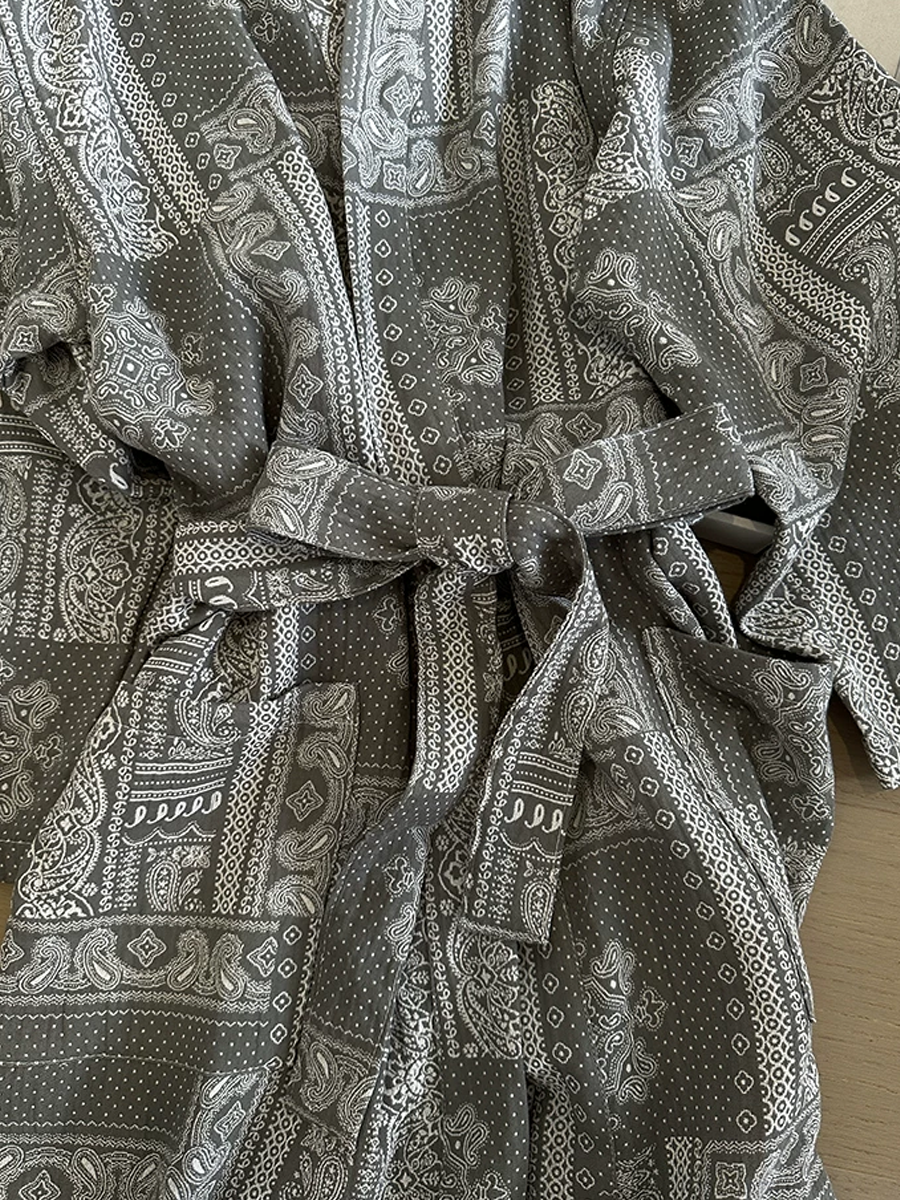 Our Cotton Gauze Bathrobe features a mid to long length that falls below the knee, crafted from 100% Cotton Gauze material. With its soft touch texture and elegant paisley floral pattern design, this breathable and durable bathrobe is perfect for lounging at home or after a shower, offering a stylish and comfortable experience.