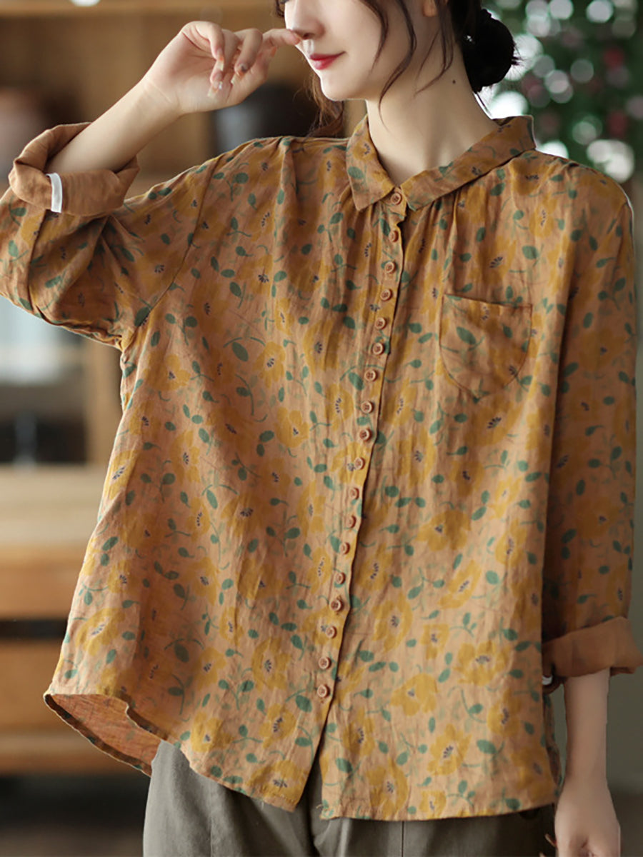Summer Vintage Printed Linen Shirt Turn-down Collar Top