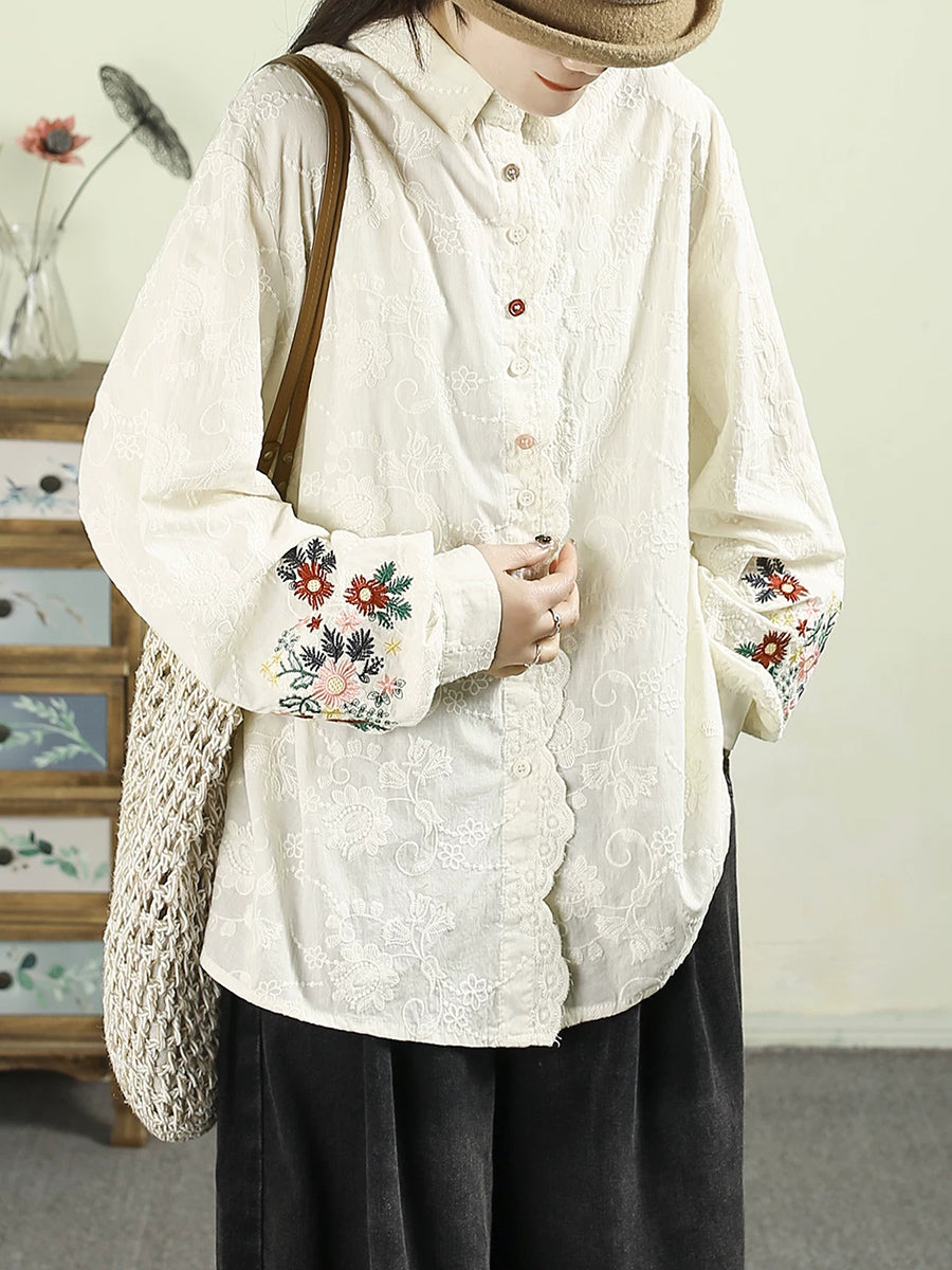 Women Artsy Autumn Embroidery 100%Cotton Shirt