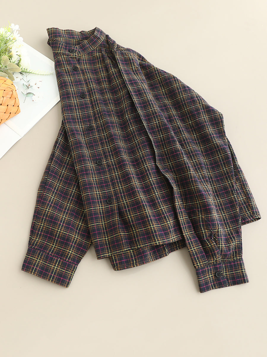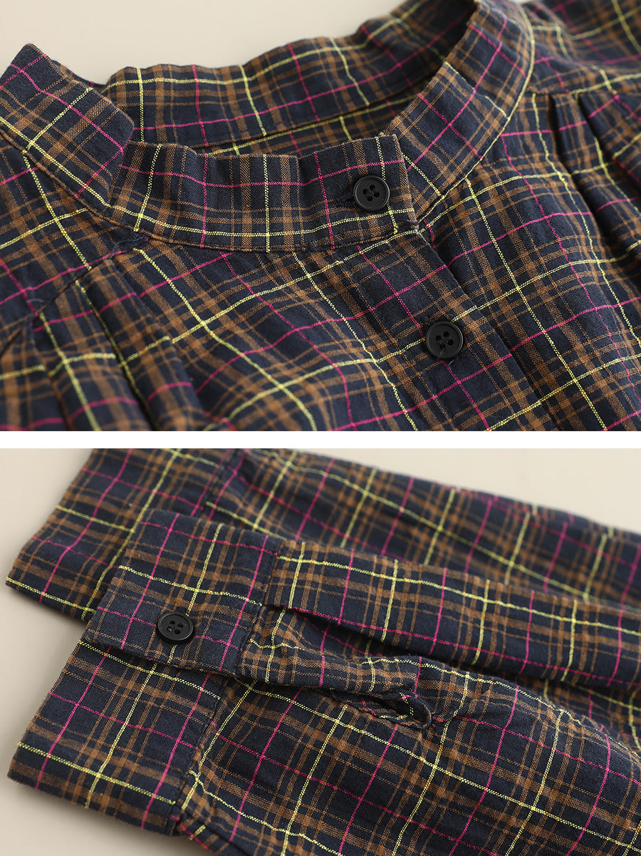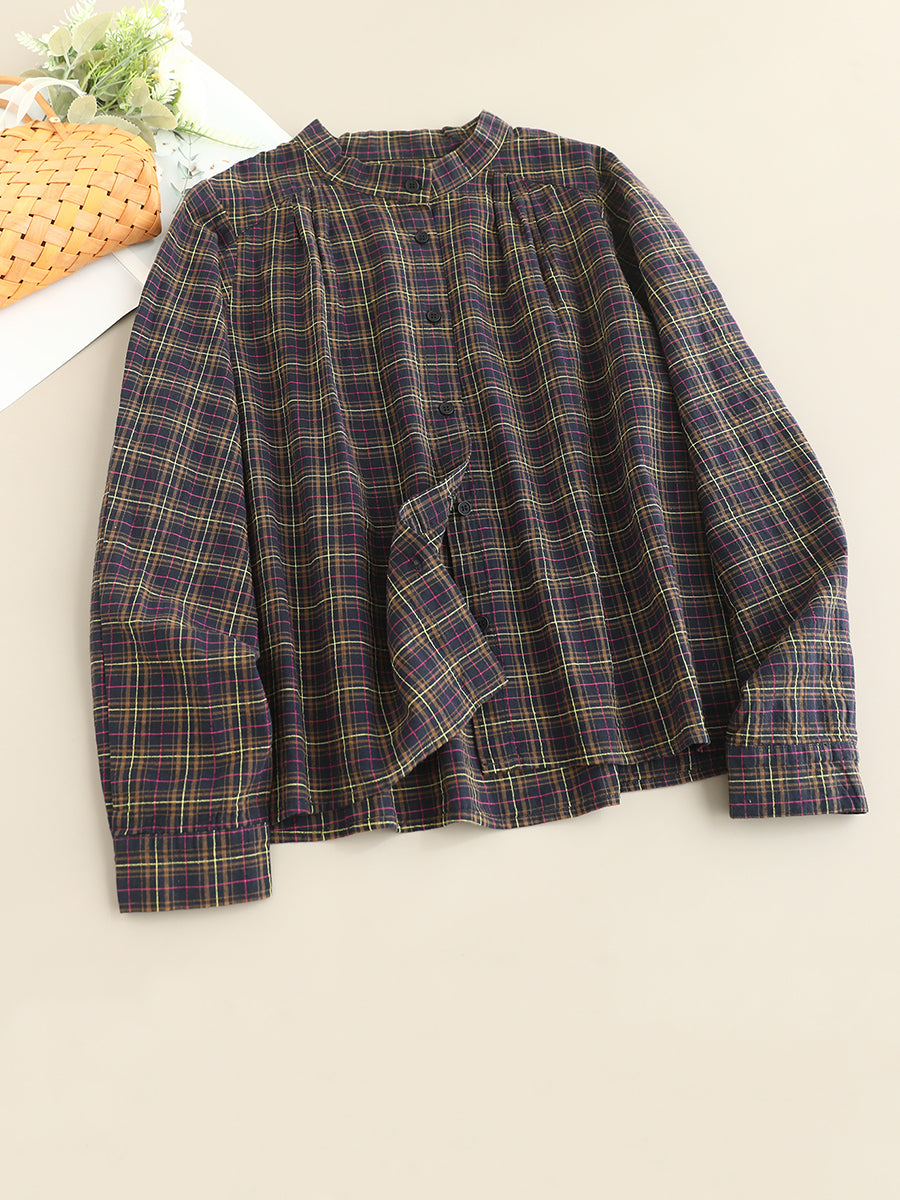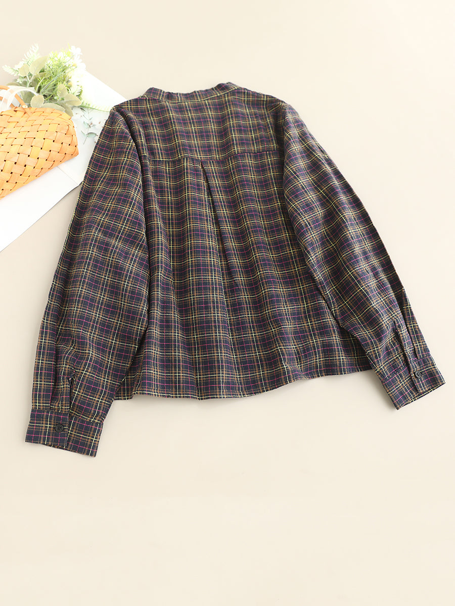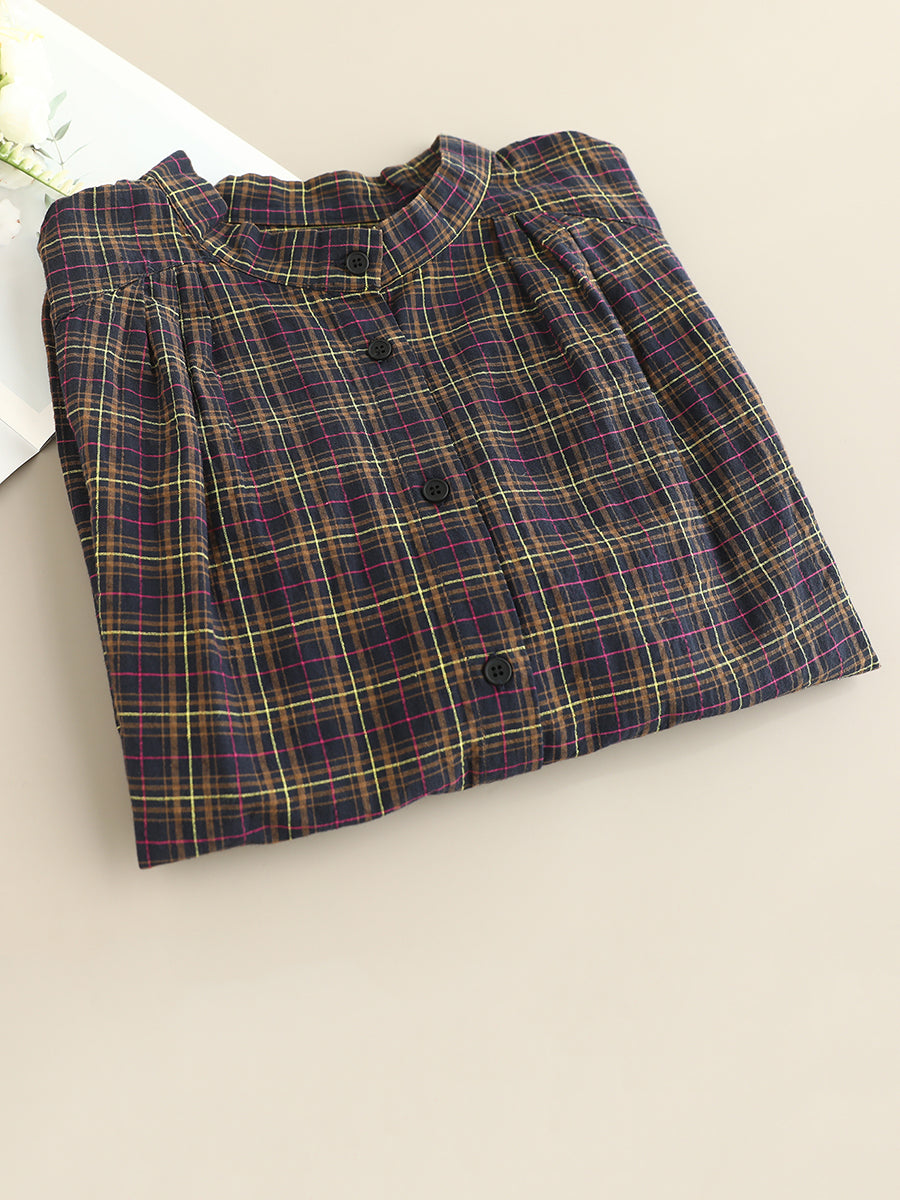 Women Artsy Autumn Plaid Stand Collar 100%Cotton Shirt