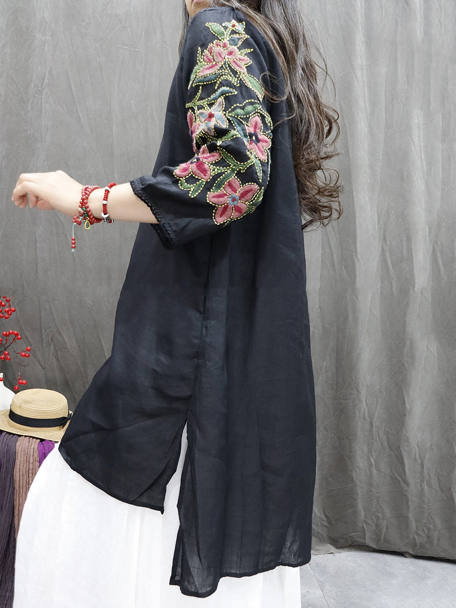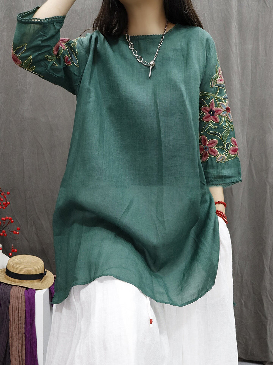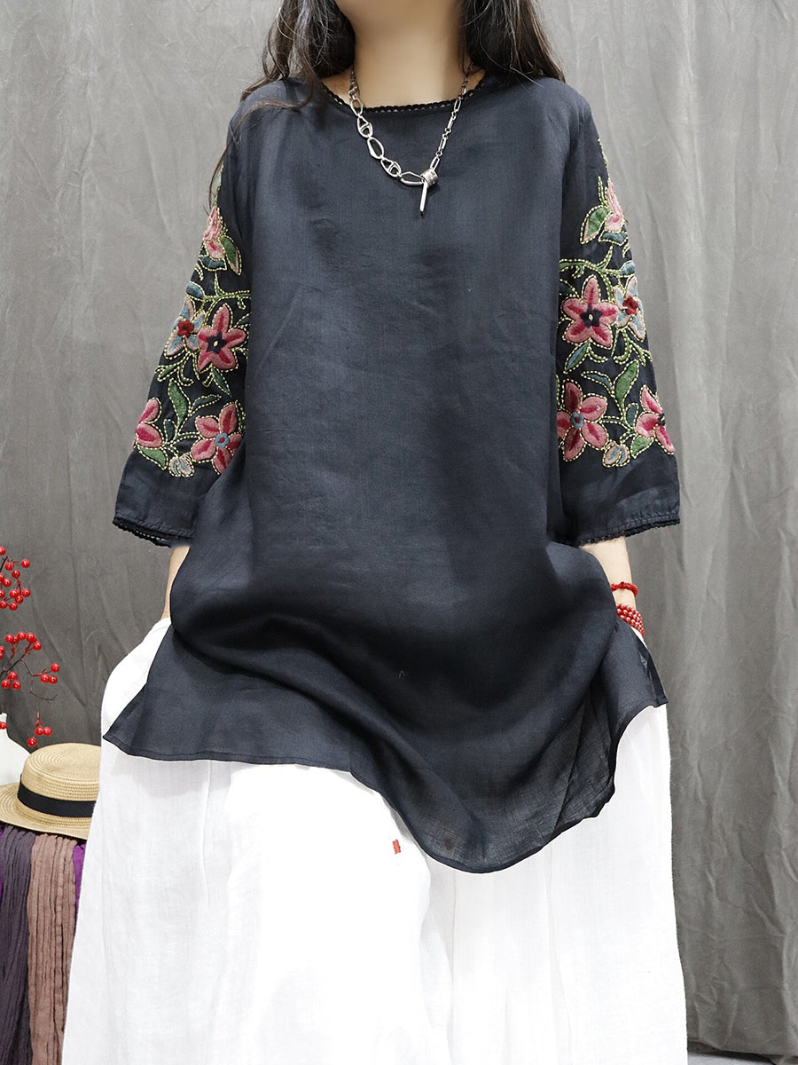 Women Artsy Embroidery Flower O-Neck 100%Ramie Blouse
