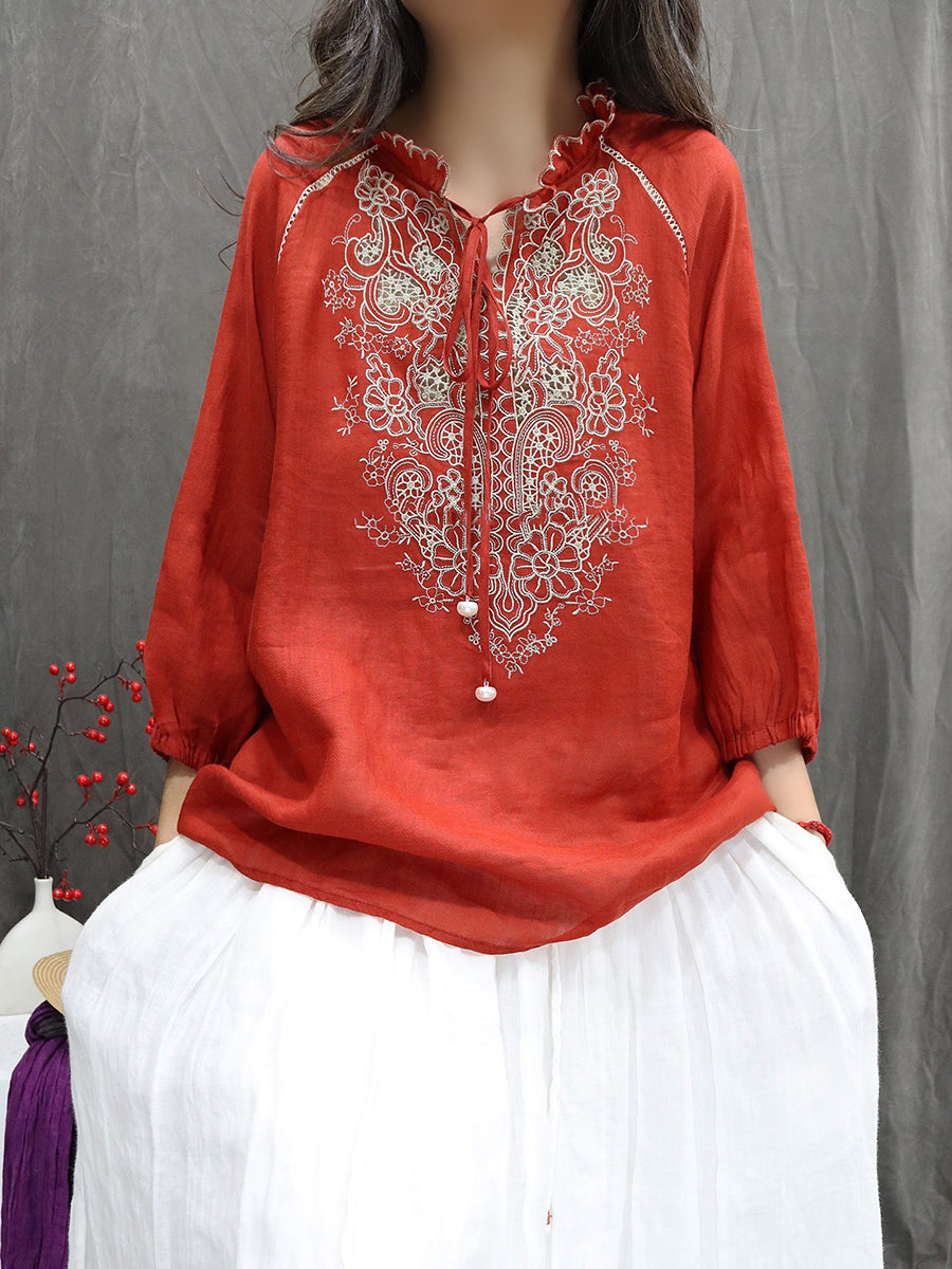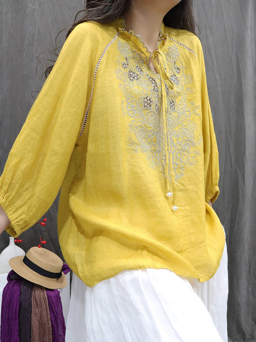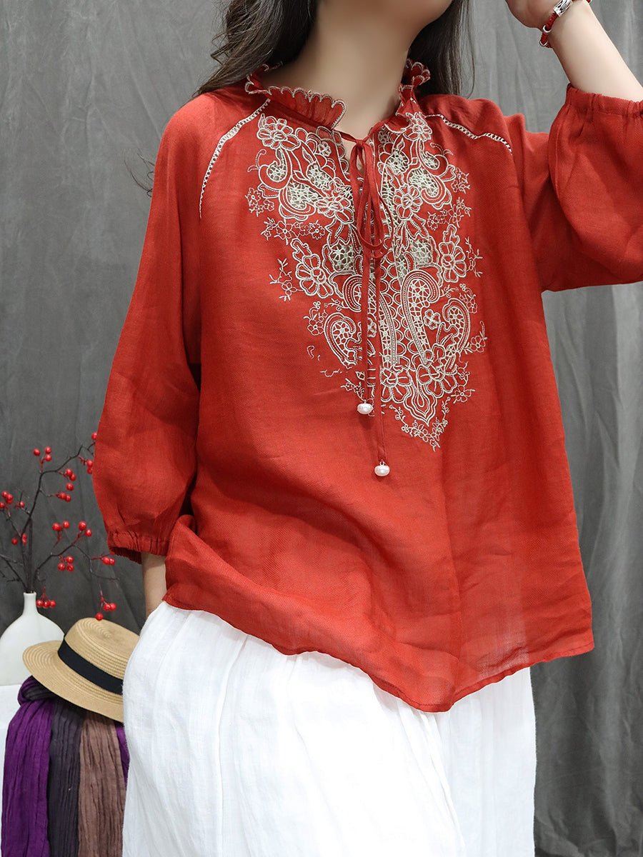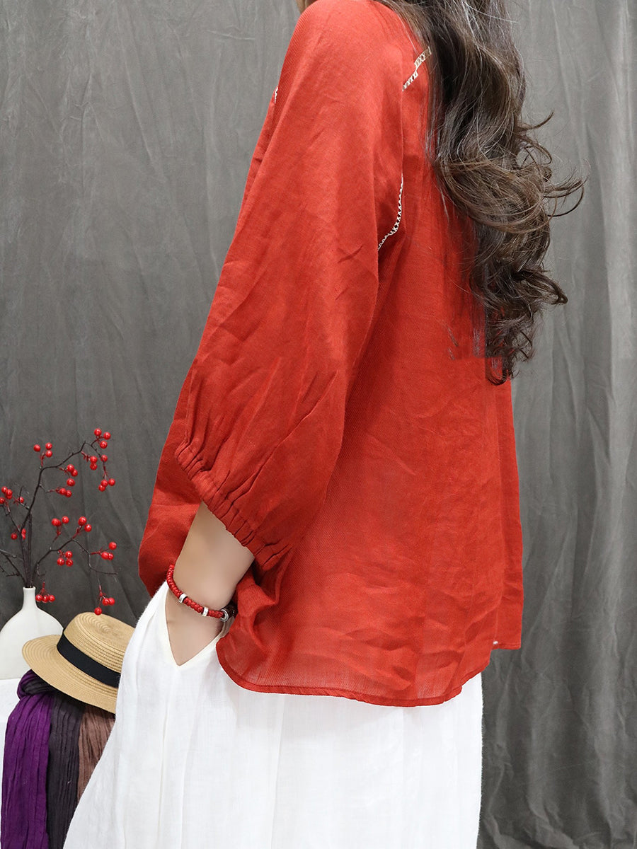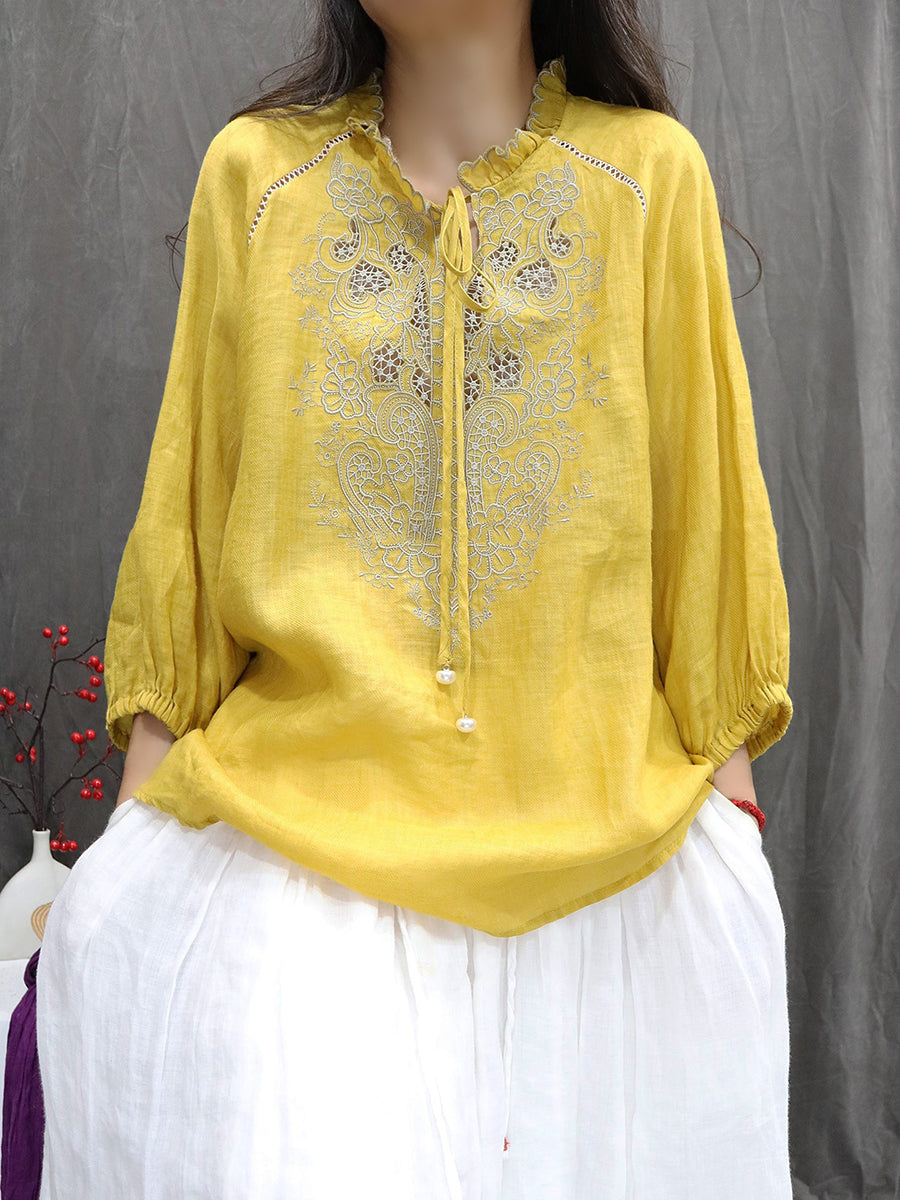 Women Artsy Spring Embroidery Stand Collar 100%Ramie Blouse