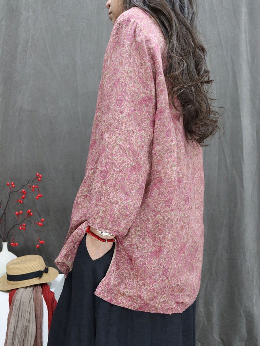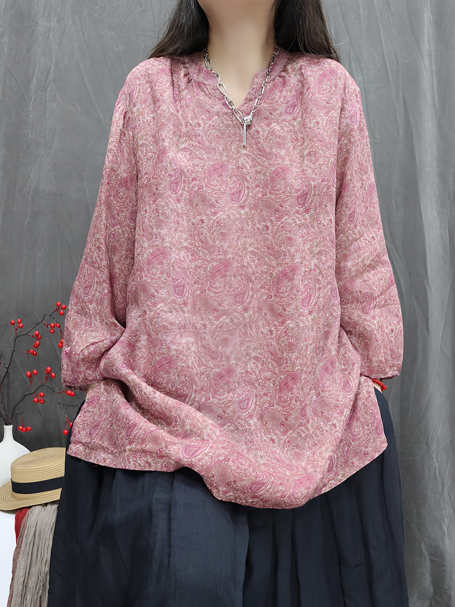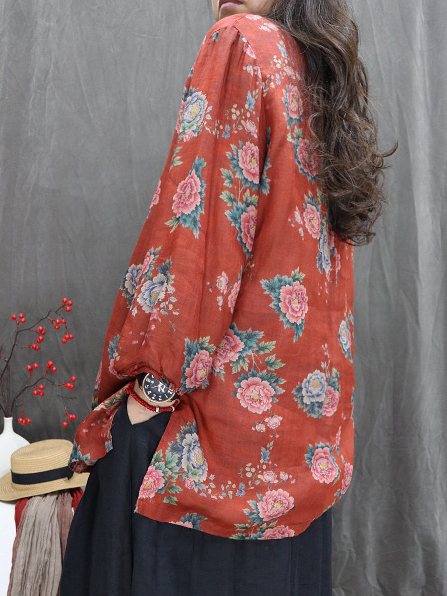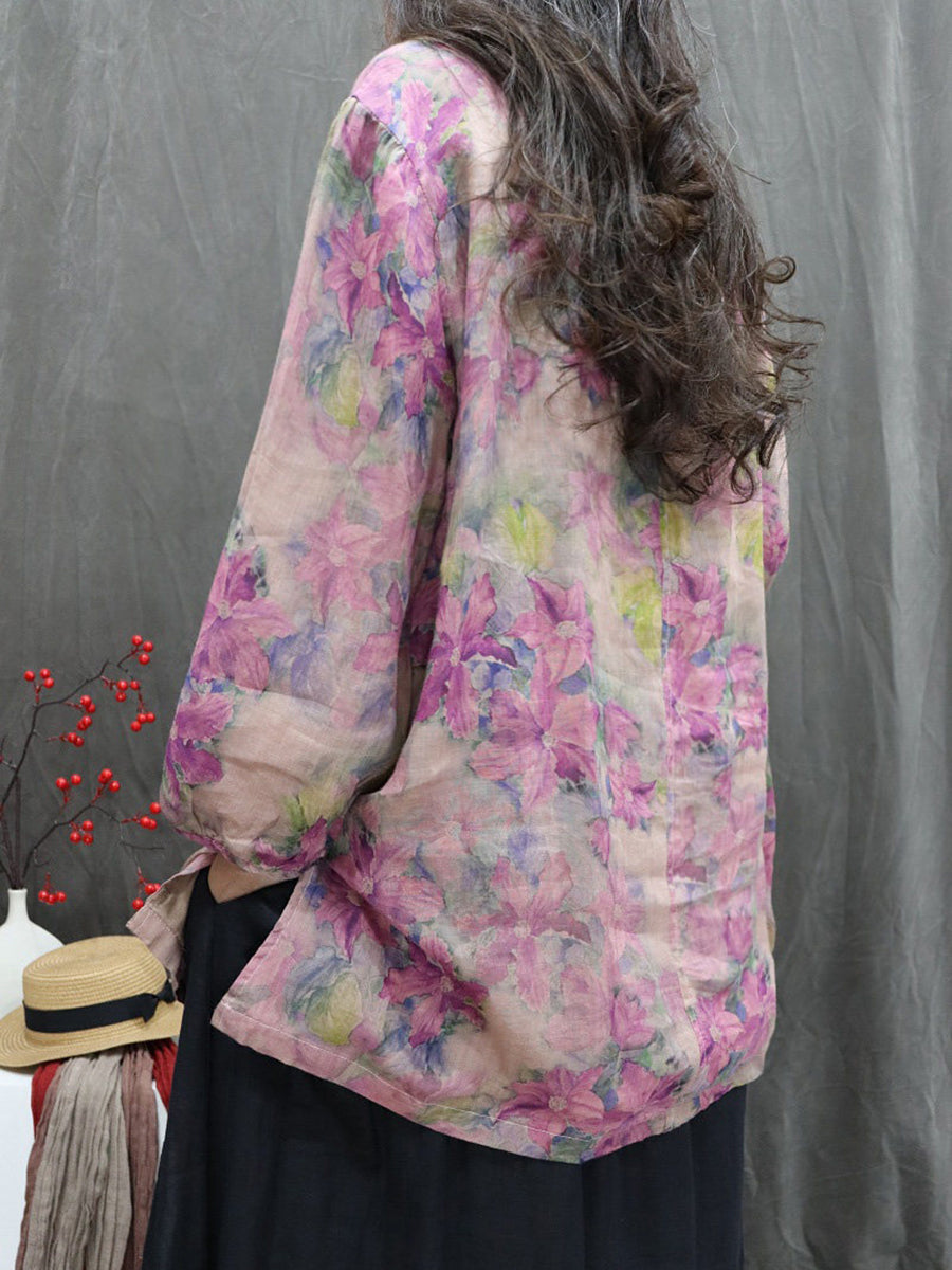 Women Artsy Spring Flower V-Neck 100%Ramie Blouse
