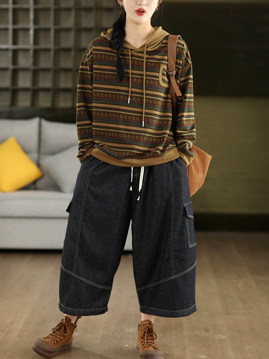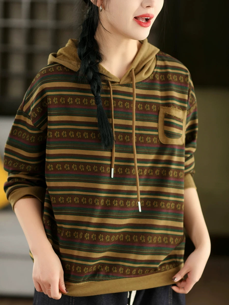 Women Retro Spring Stripe Hooded Sweater