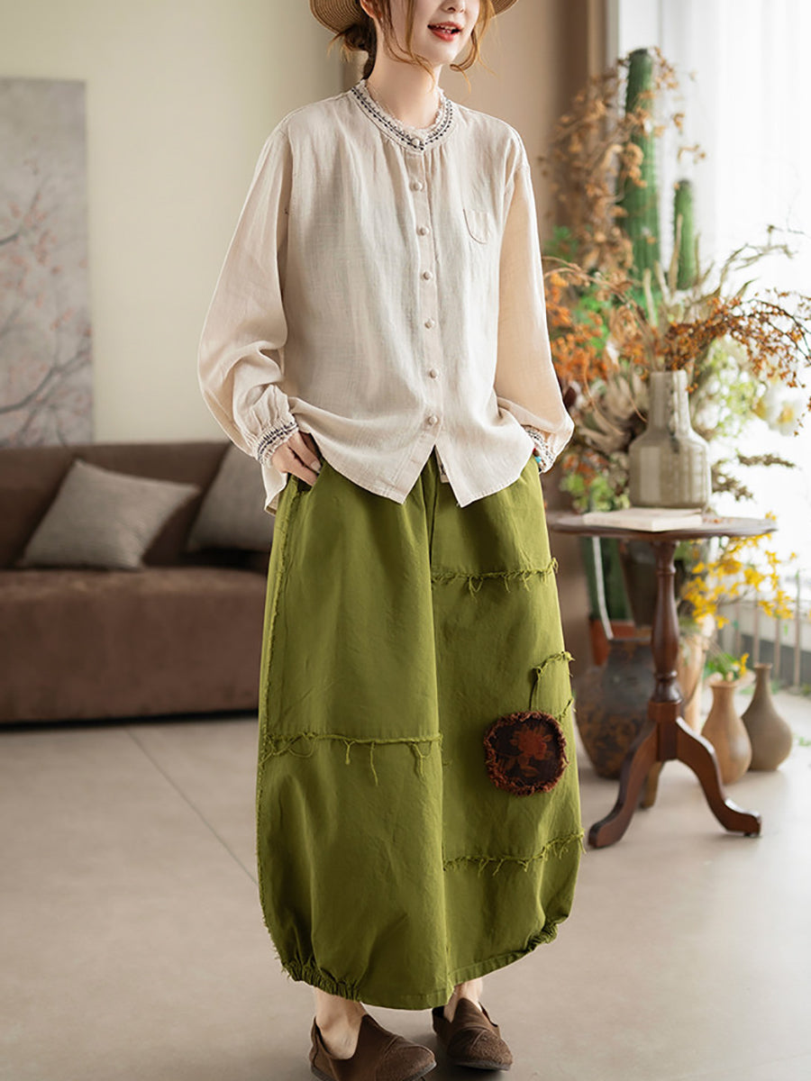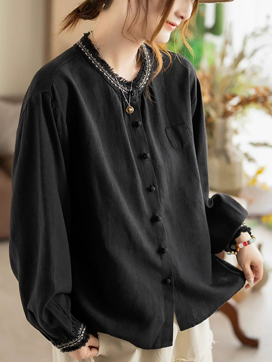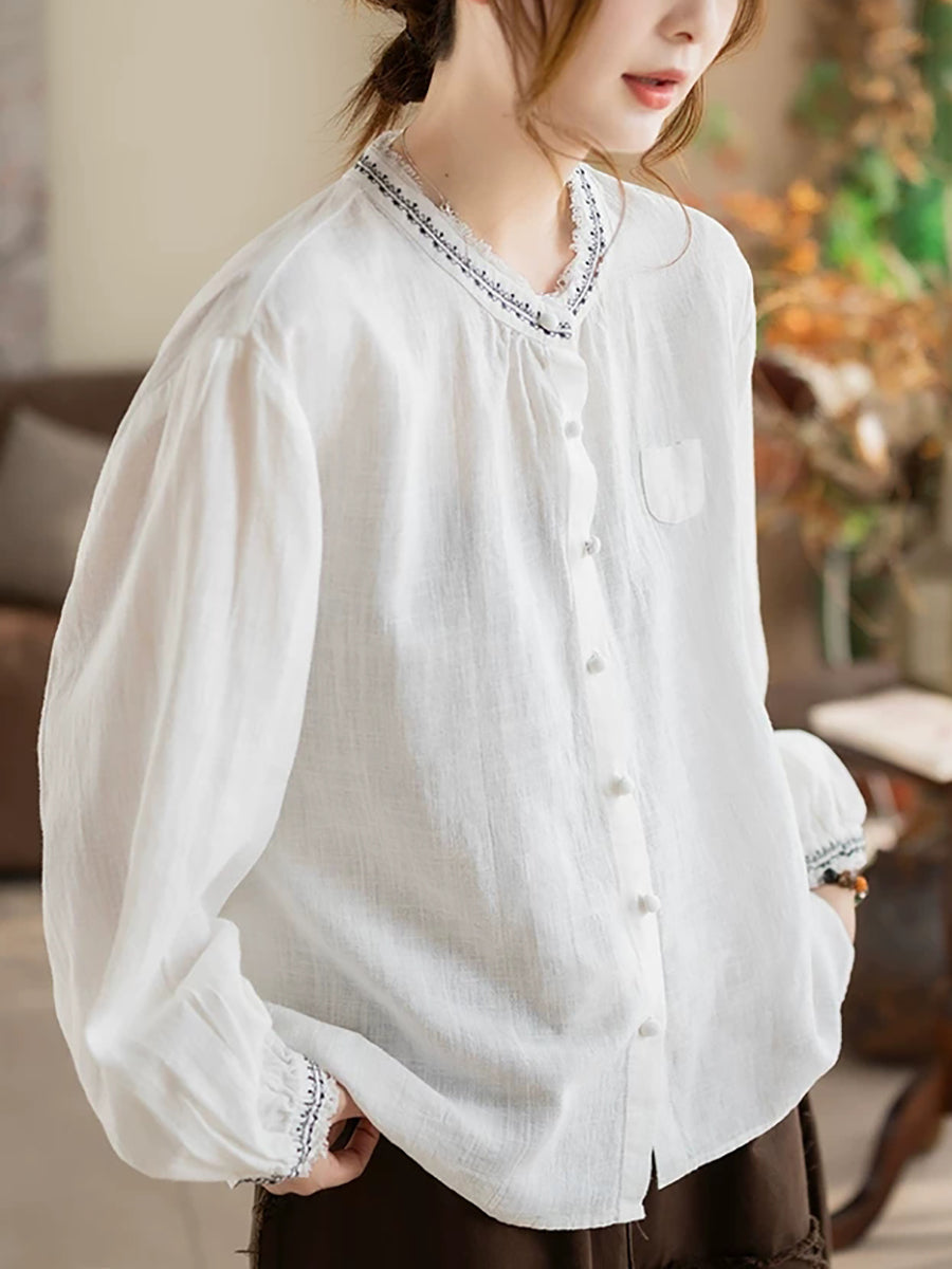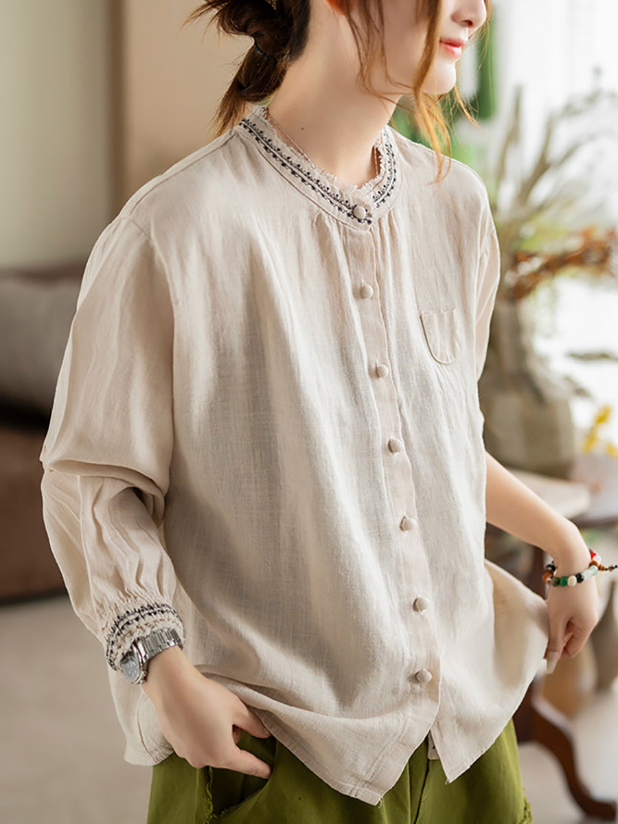 Women Artsy Summer Embroidery O-Neck Ramie Blouse