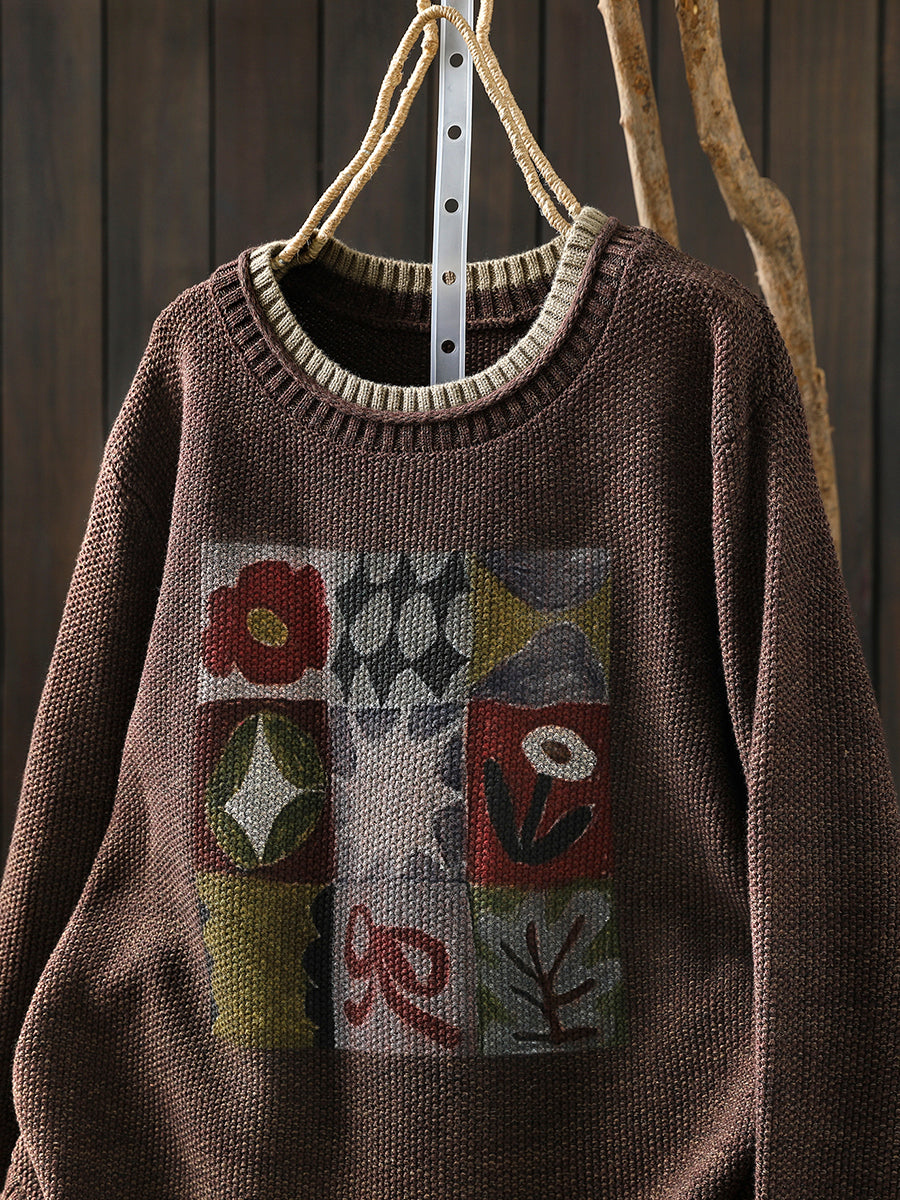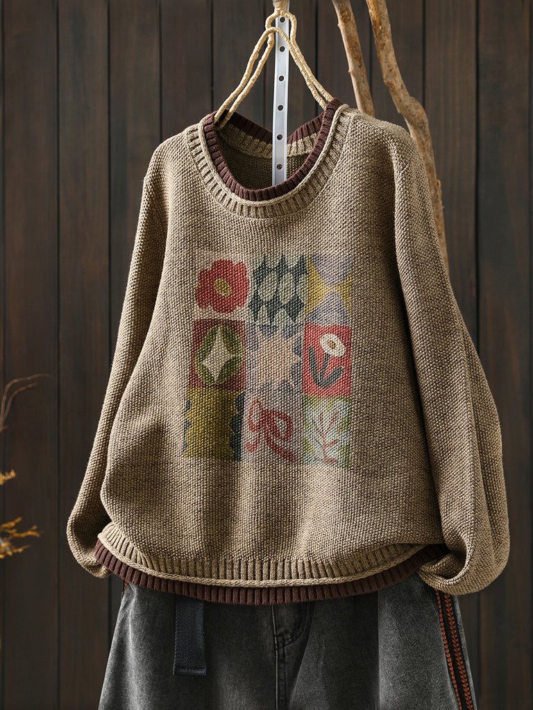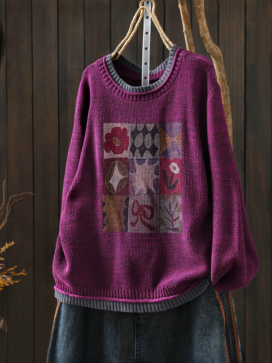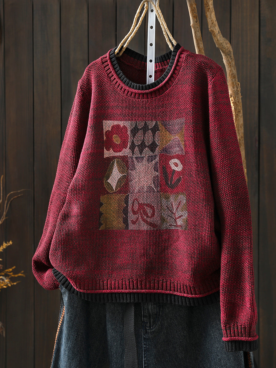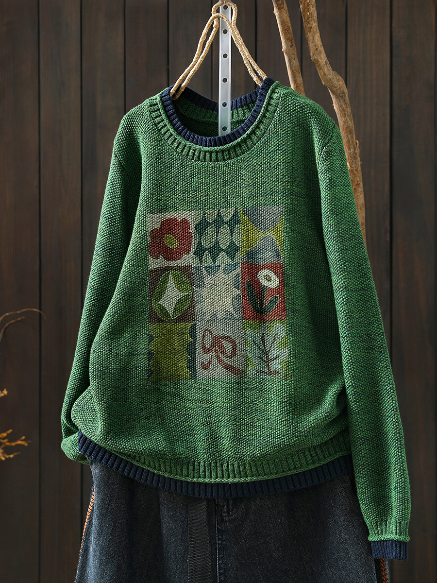Women Autumn Artsy Colorblock Knitted O-Neck Sweater