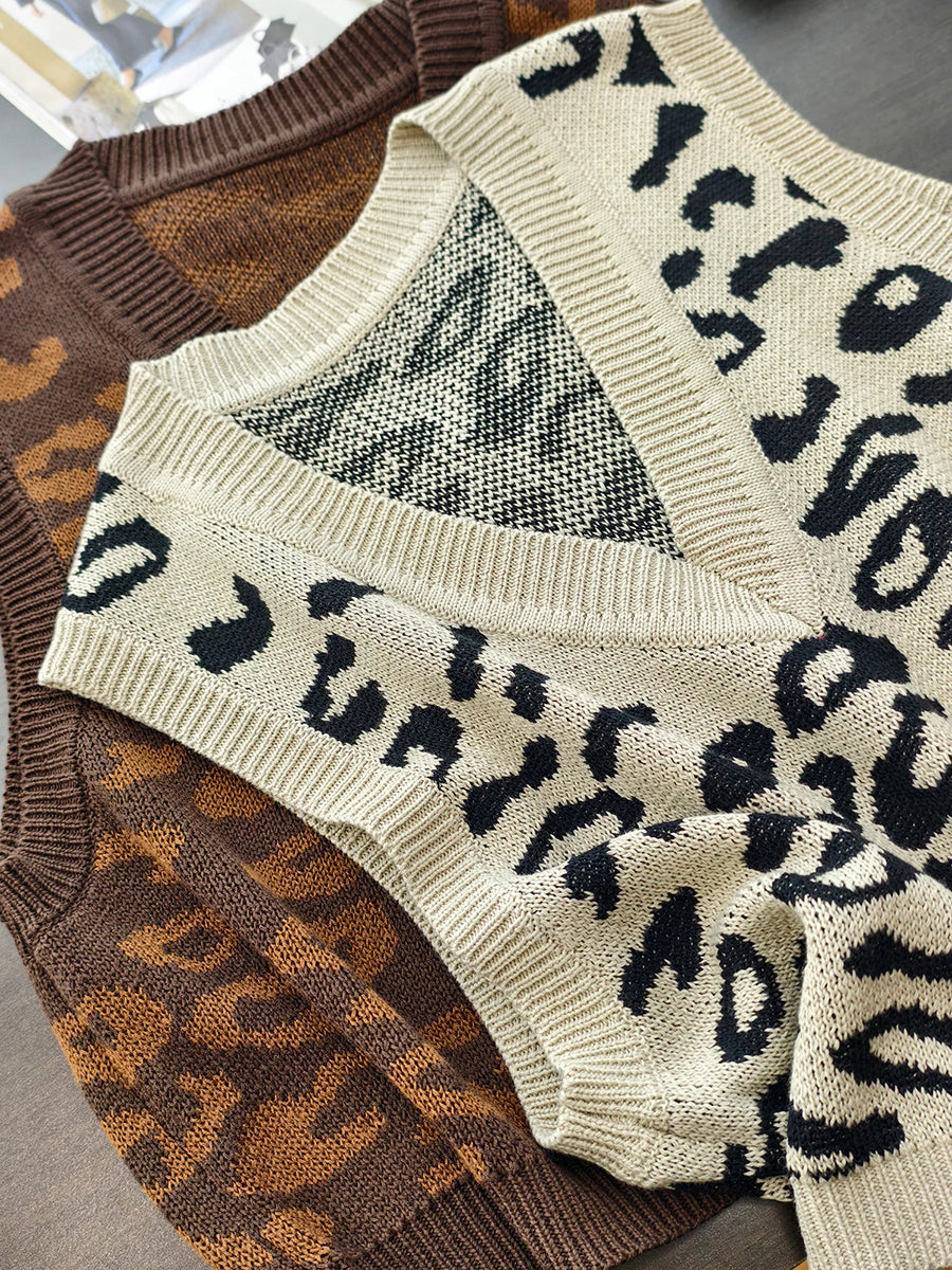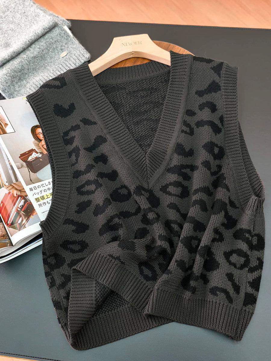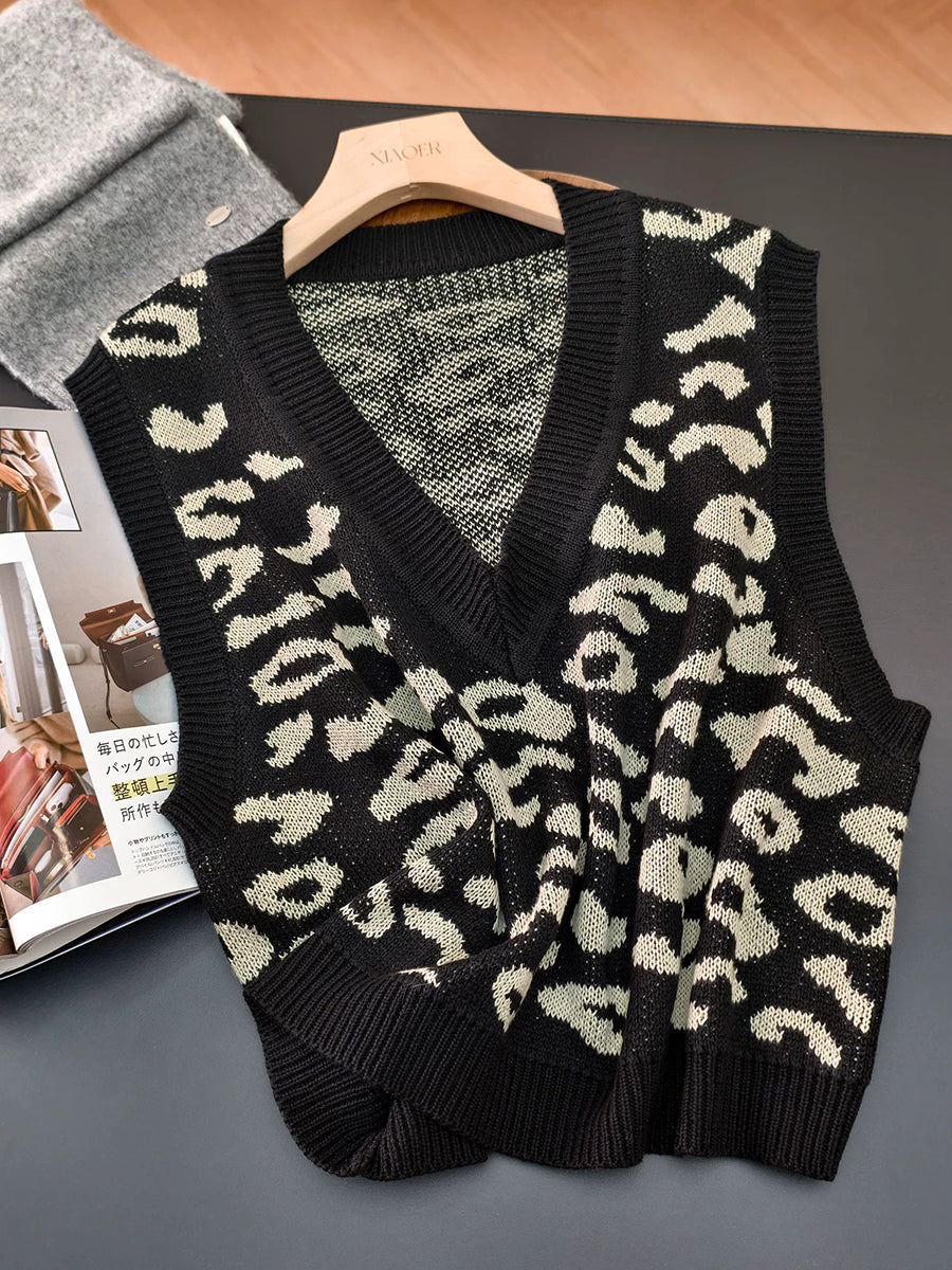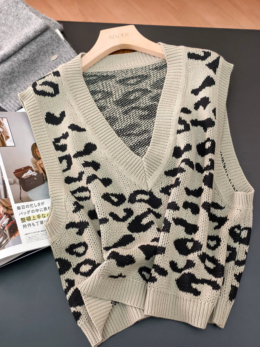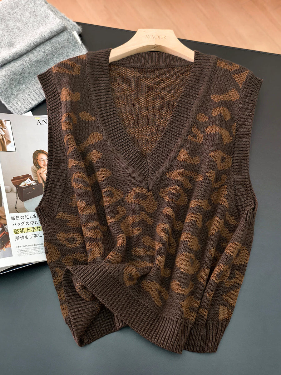 Women Autumn Artsy Leopard V-Neck Knitted Vest