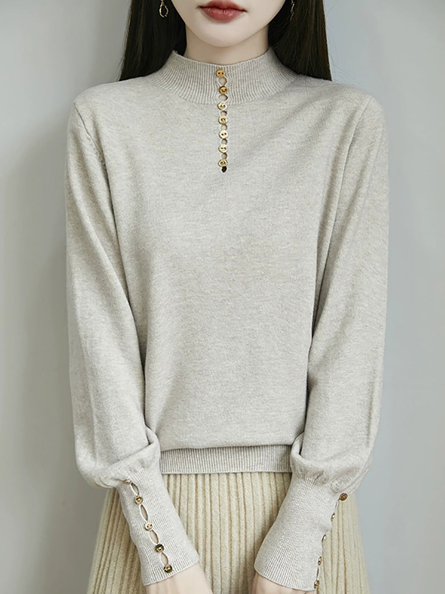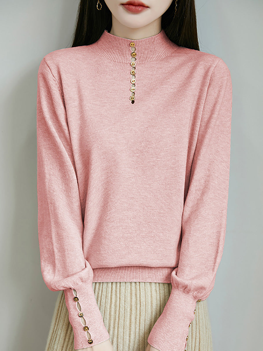 Women Autumn Artsy Pure Color Button Half-Turtleneck Sweater