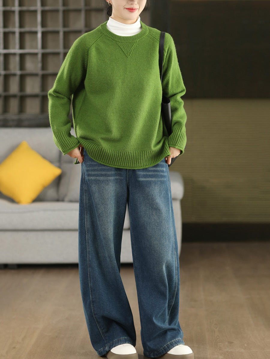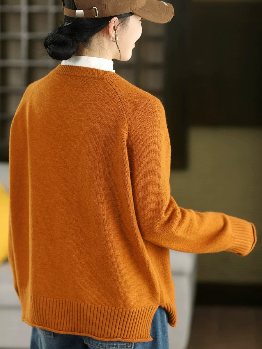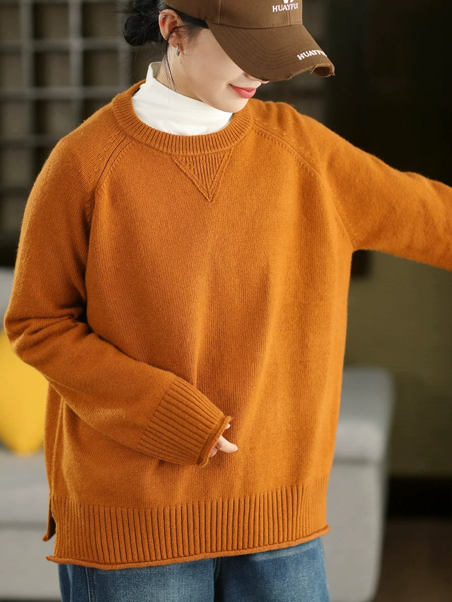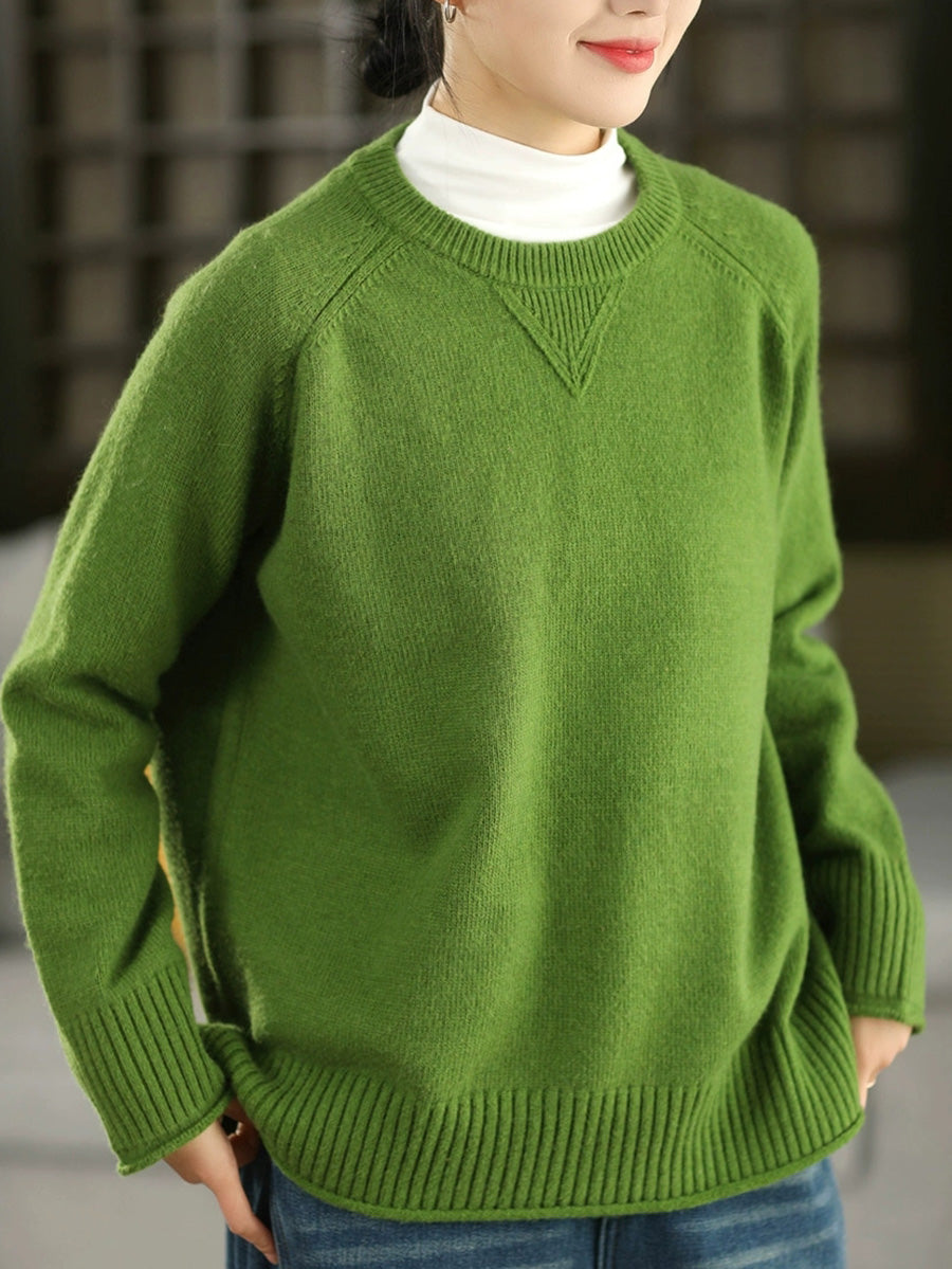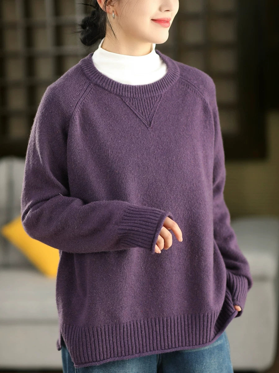 Women Autumn Artsy Pure Color Knitted O-Neck Sweater
