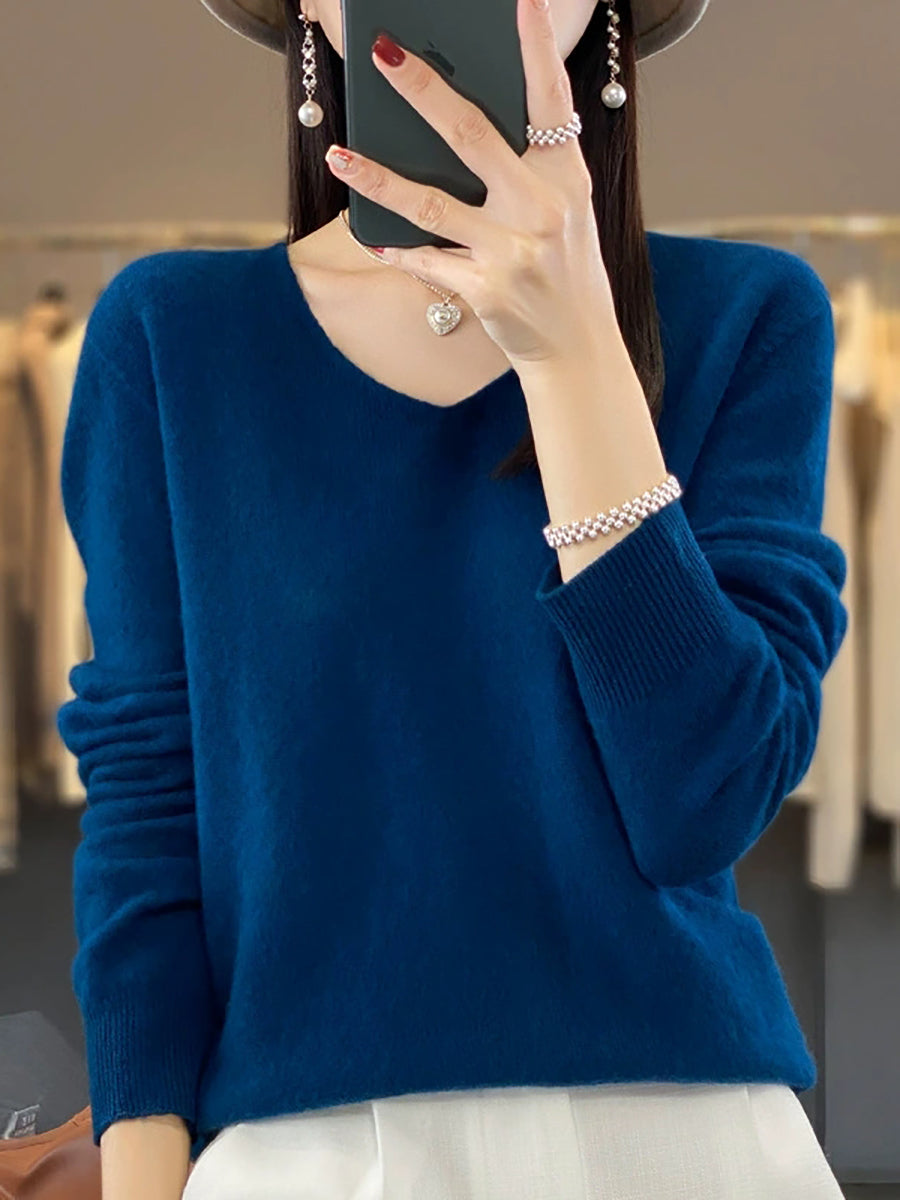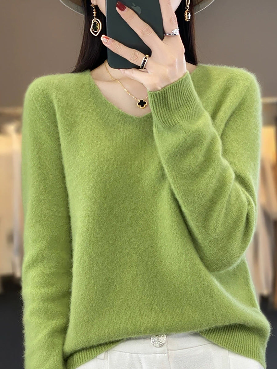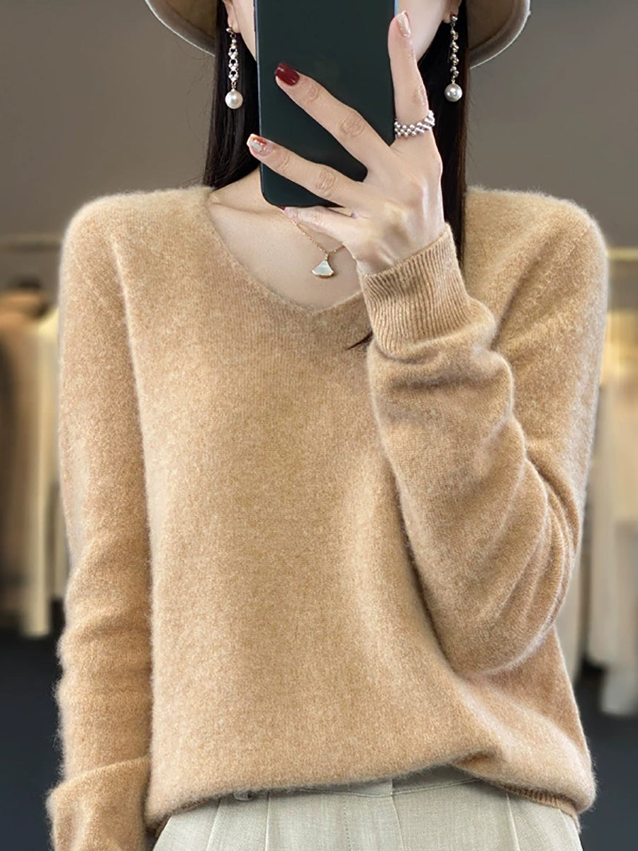 Women Autumn Artsy Pure Color V-Neck Sweater