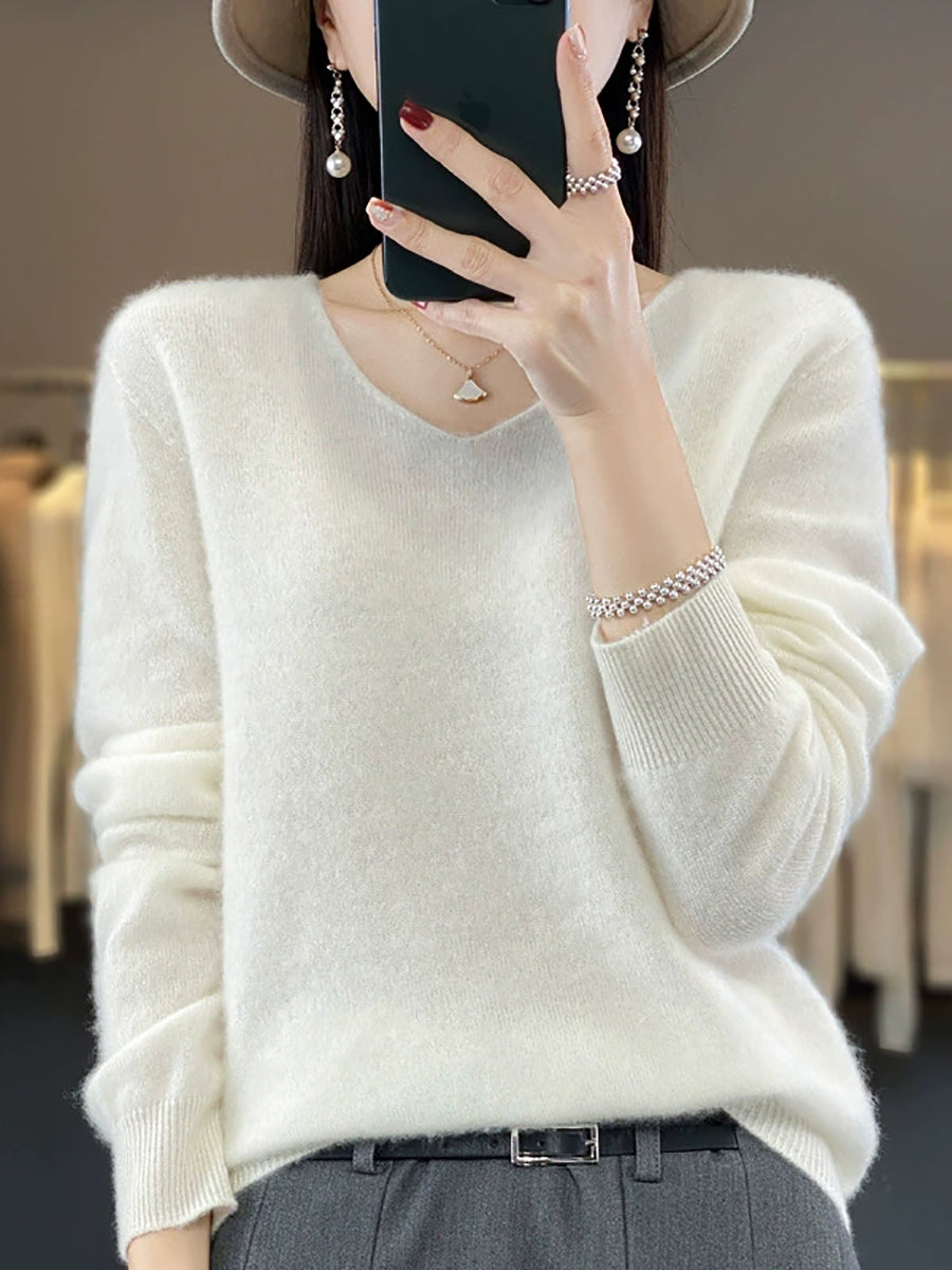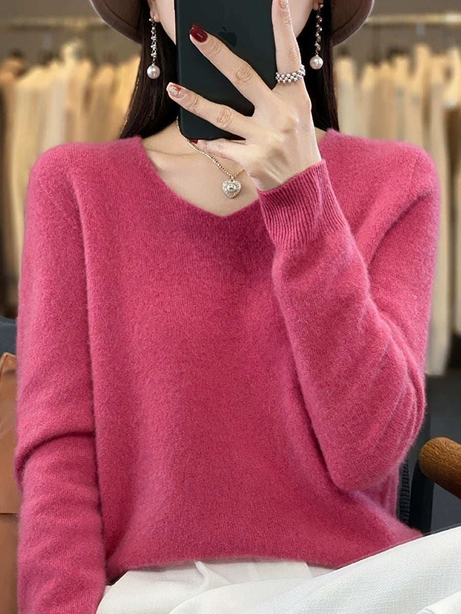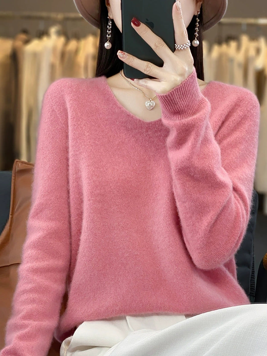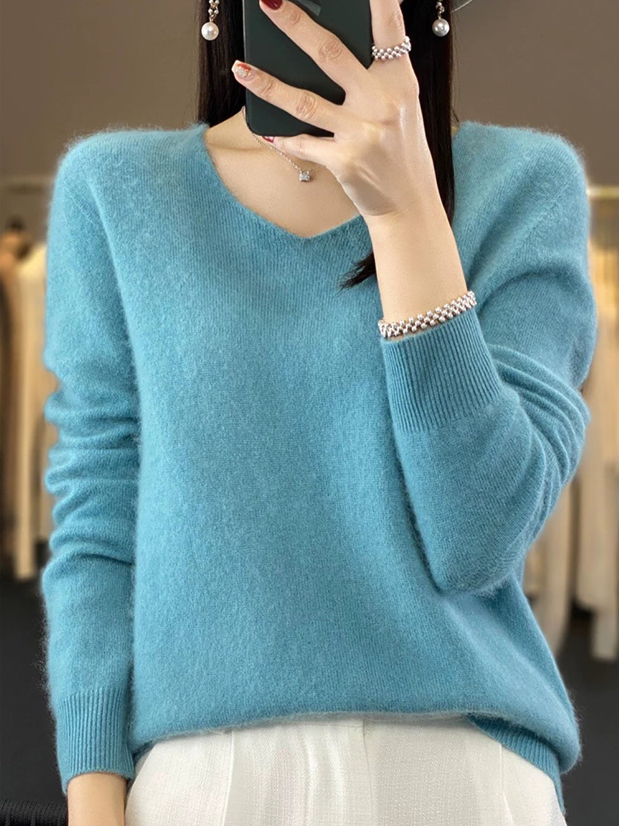Women Autumn Artsy Pure Color V-Neck Sweater