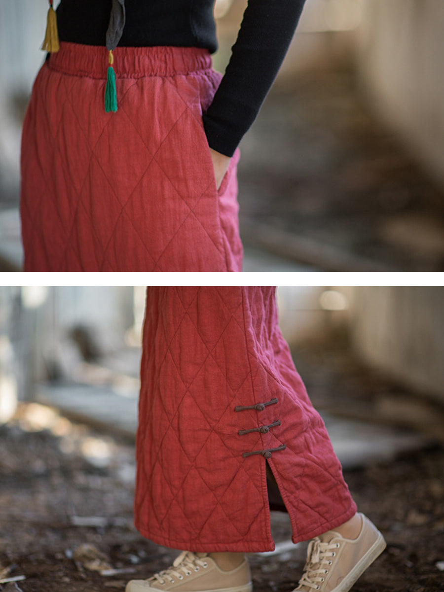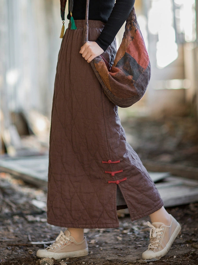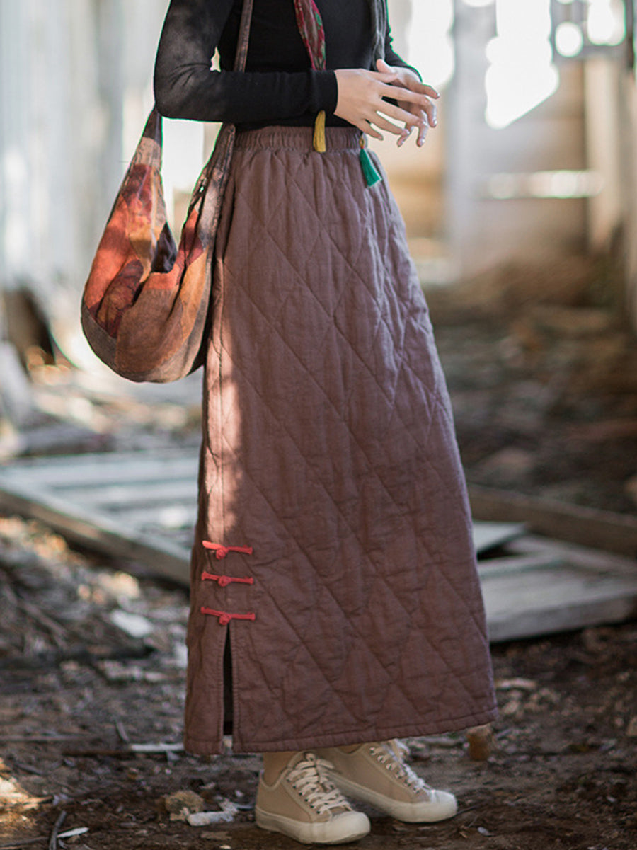 Women Autumn Ethnic Pure Color A-Shape Ramie Padded Skirt