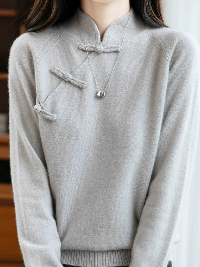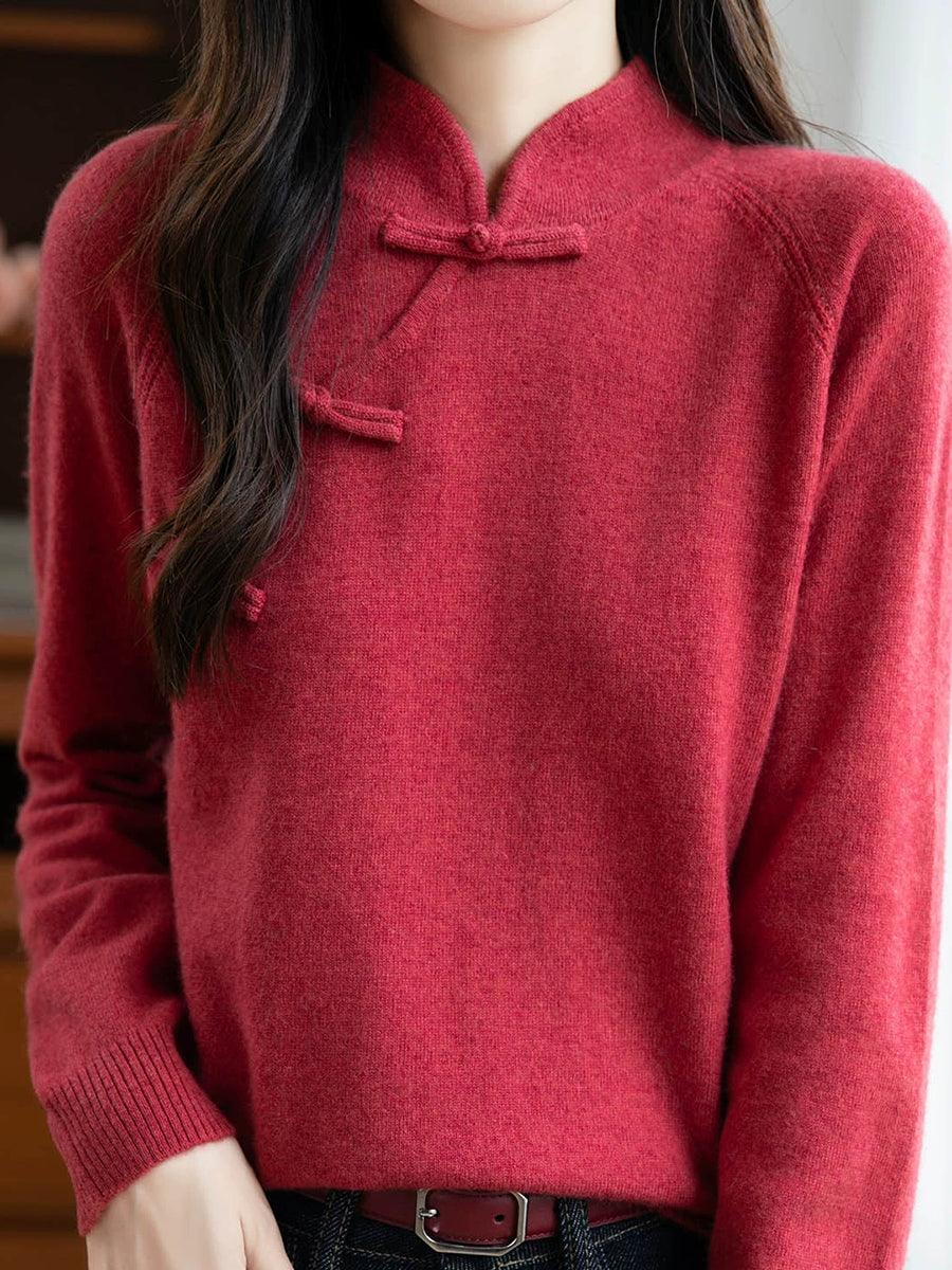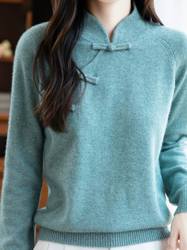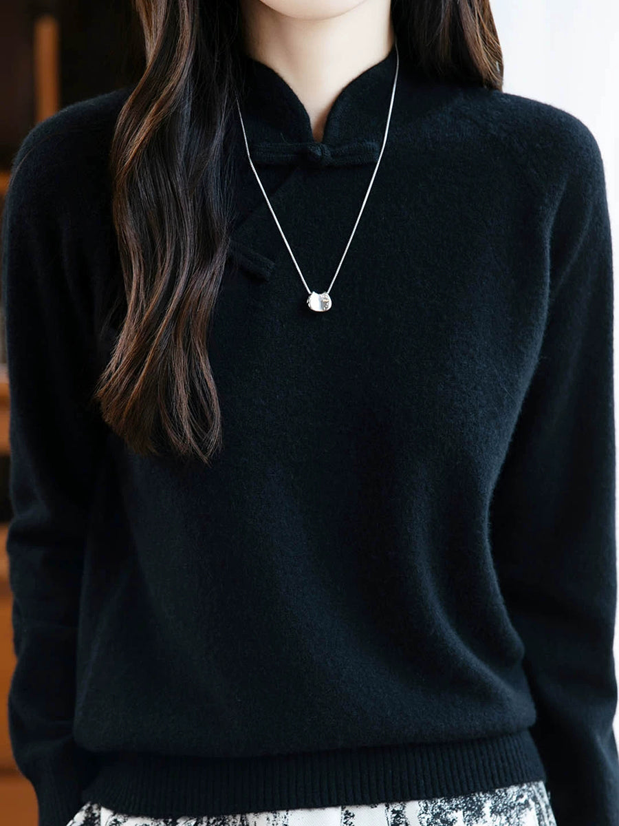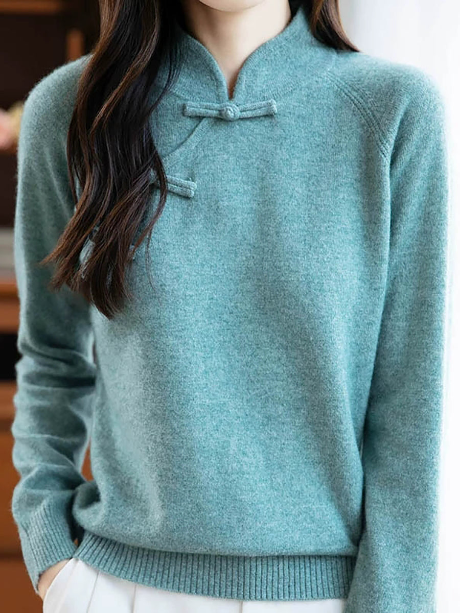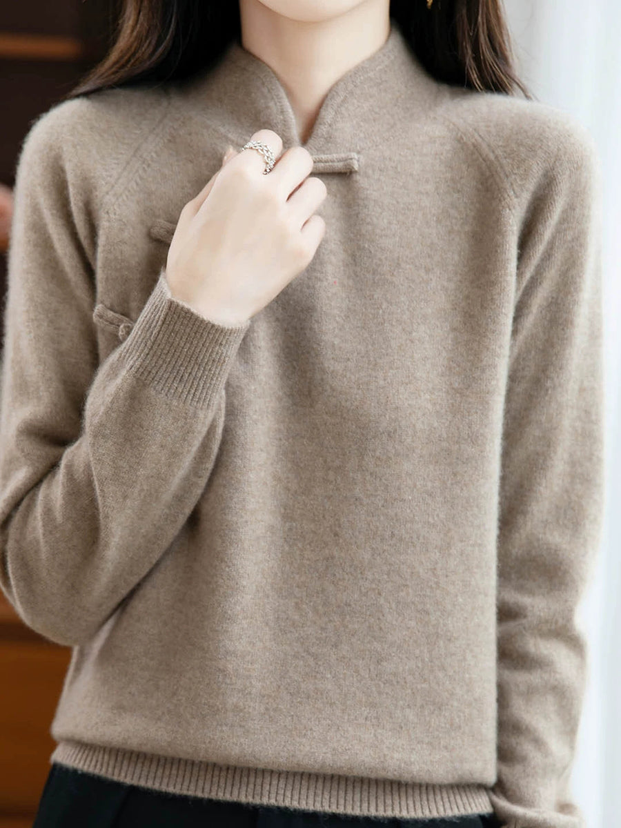 Women Autumn Ethnic Pure Color Stand Collar Sweater