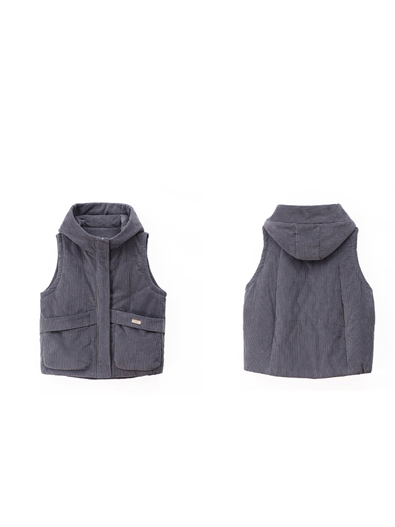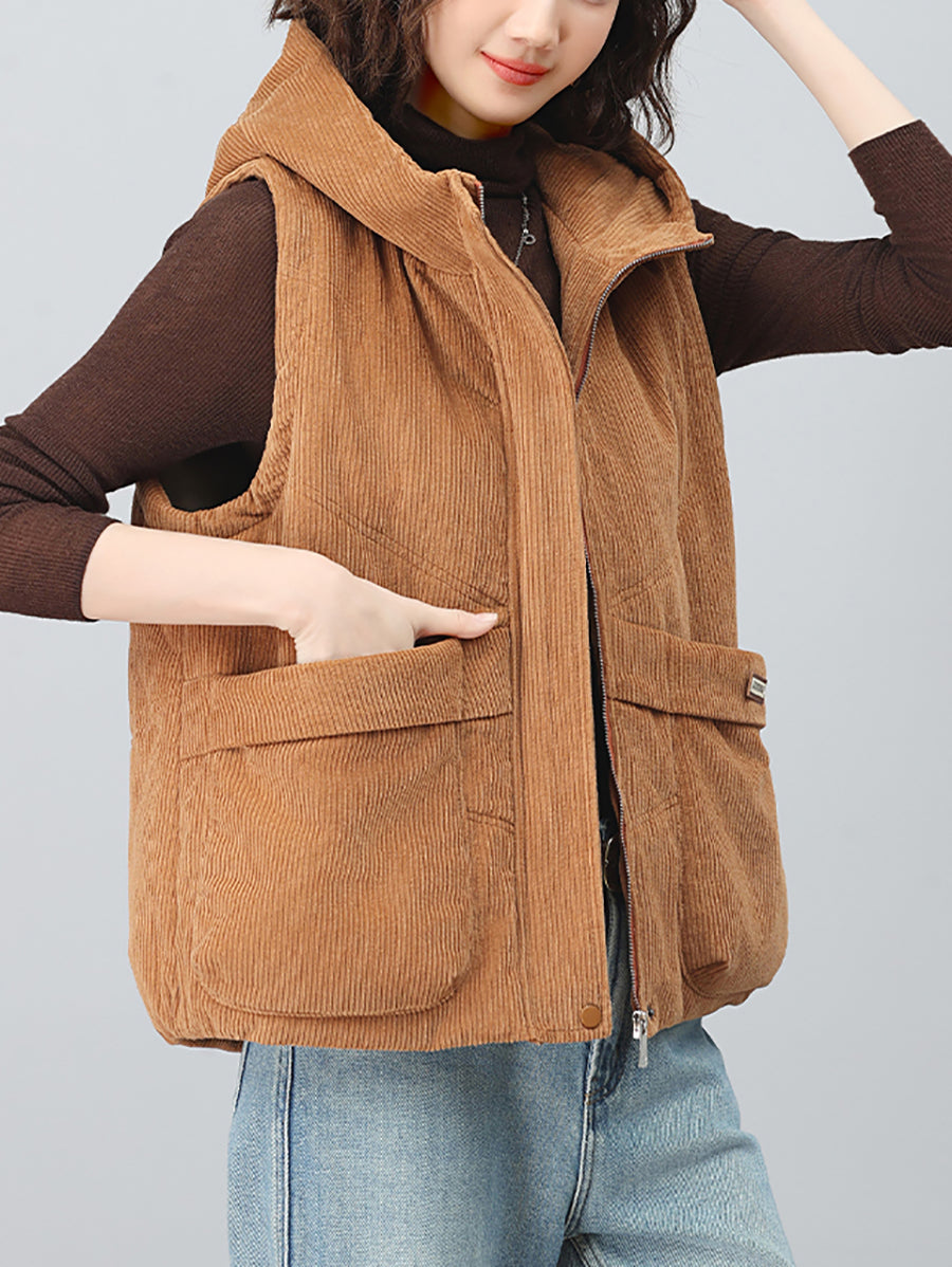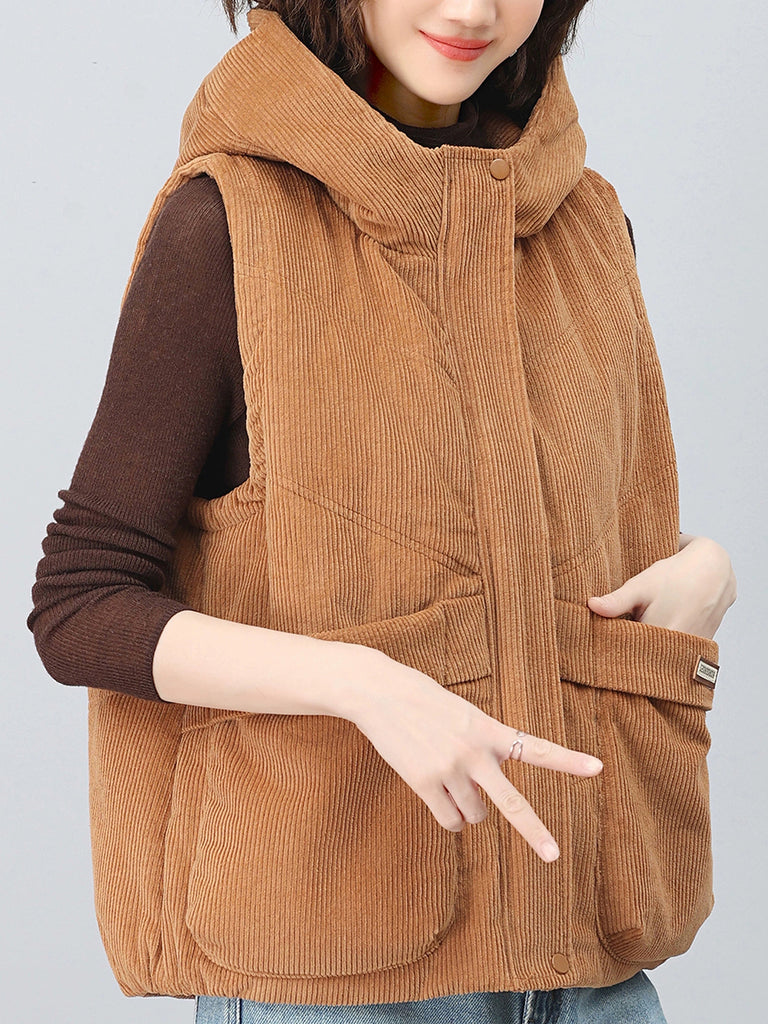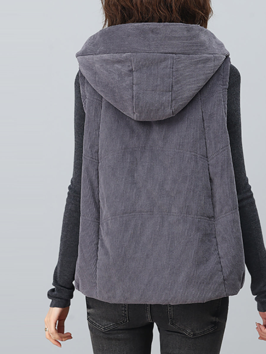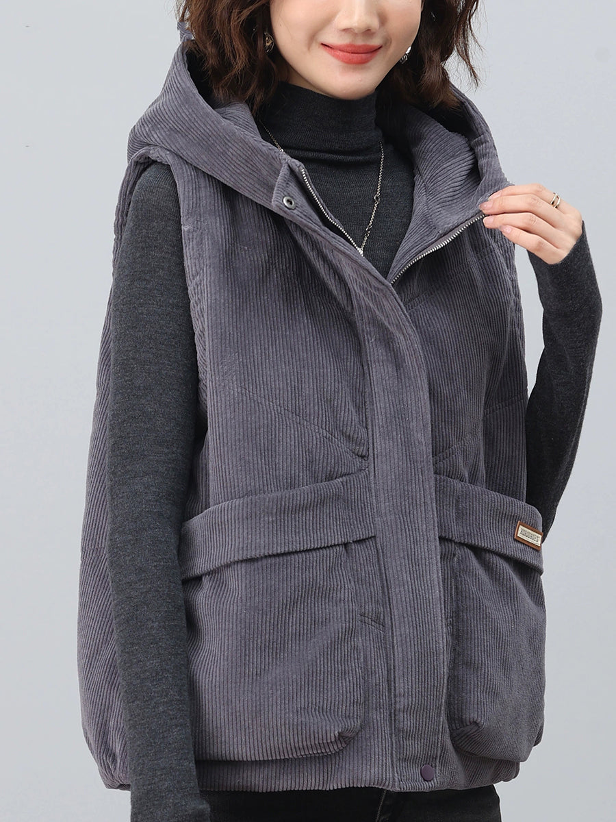Women Autumn Retro Pure Color Hooded Corduroy Vest
