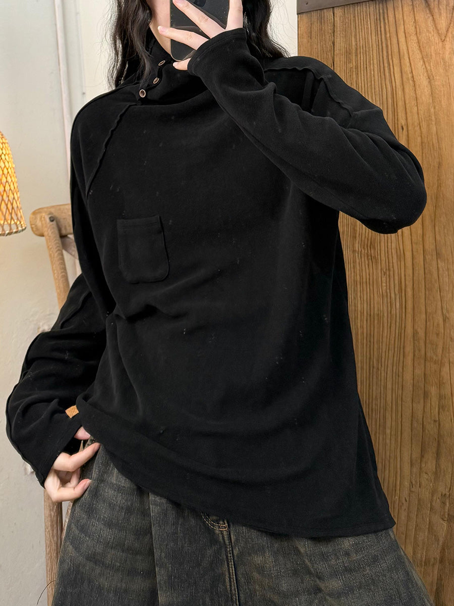Women Autumn Retro Pure Color Turtleneck Cotton Blouse