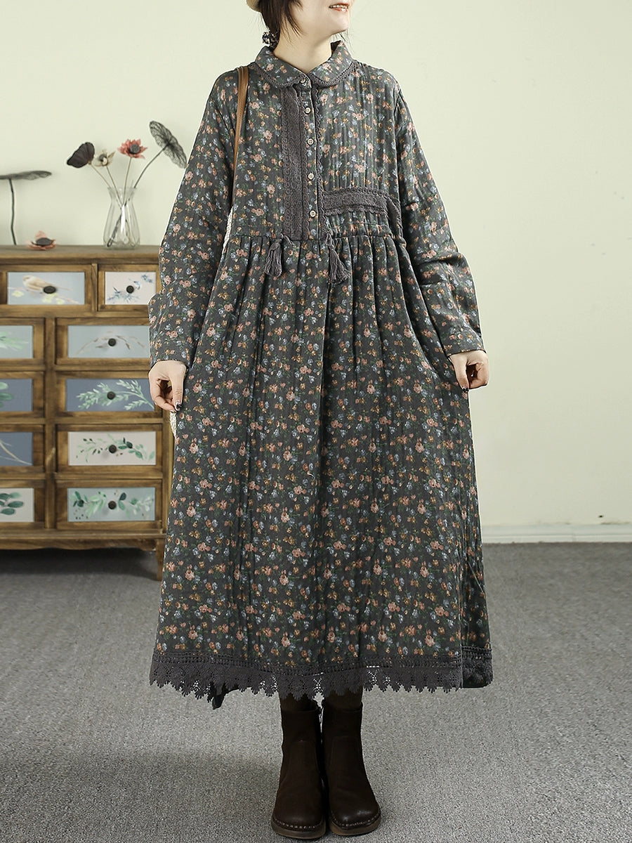 Women Autumn Vintage Floral Turn-down Collar 100%Cotton Dress