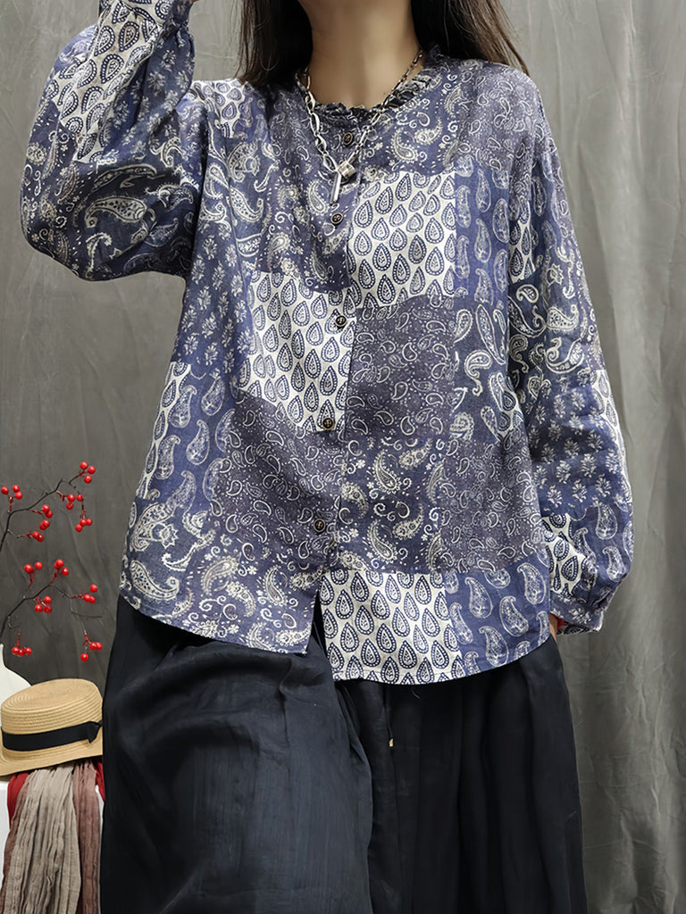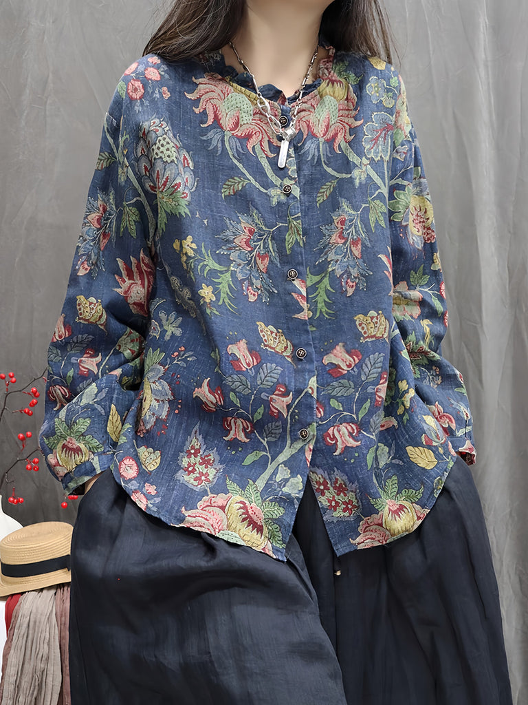 Women Autumn Vintage Flower 100%Linen O-Neck Shirt