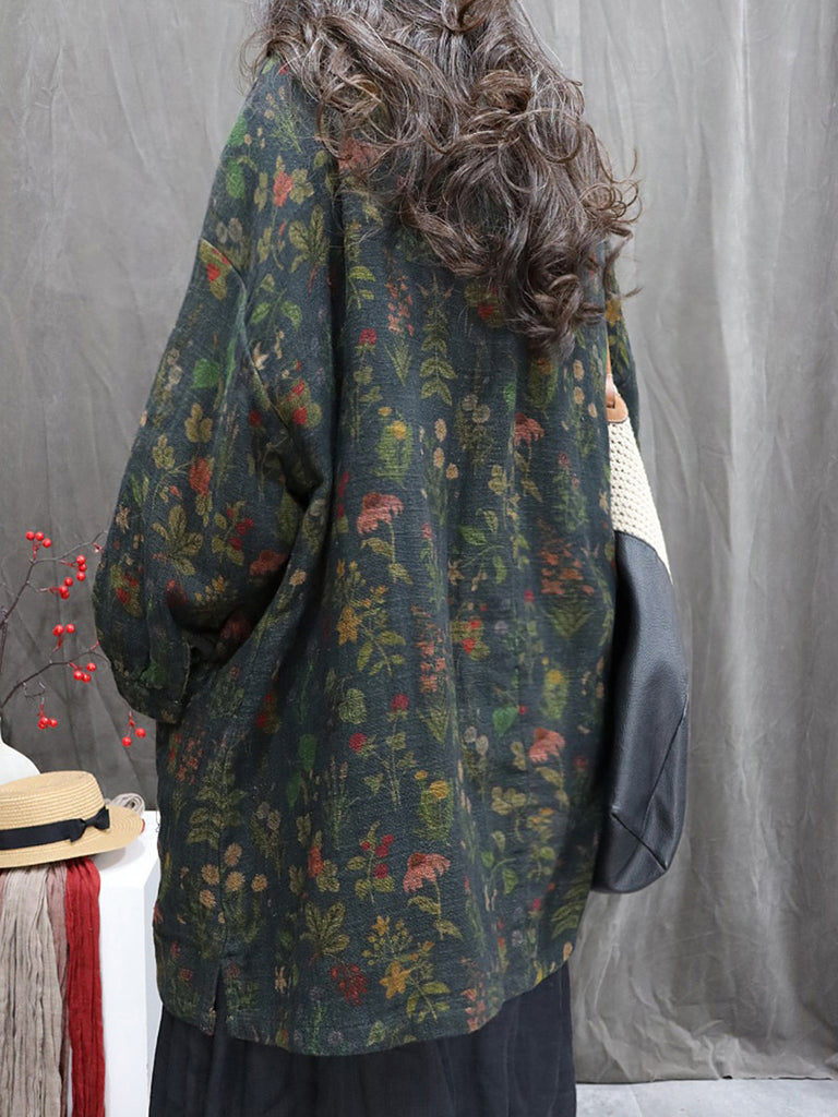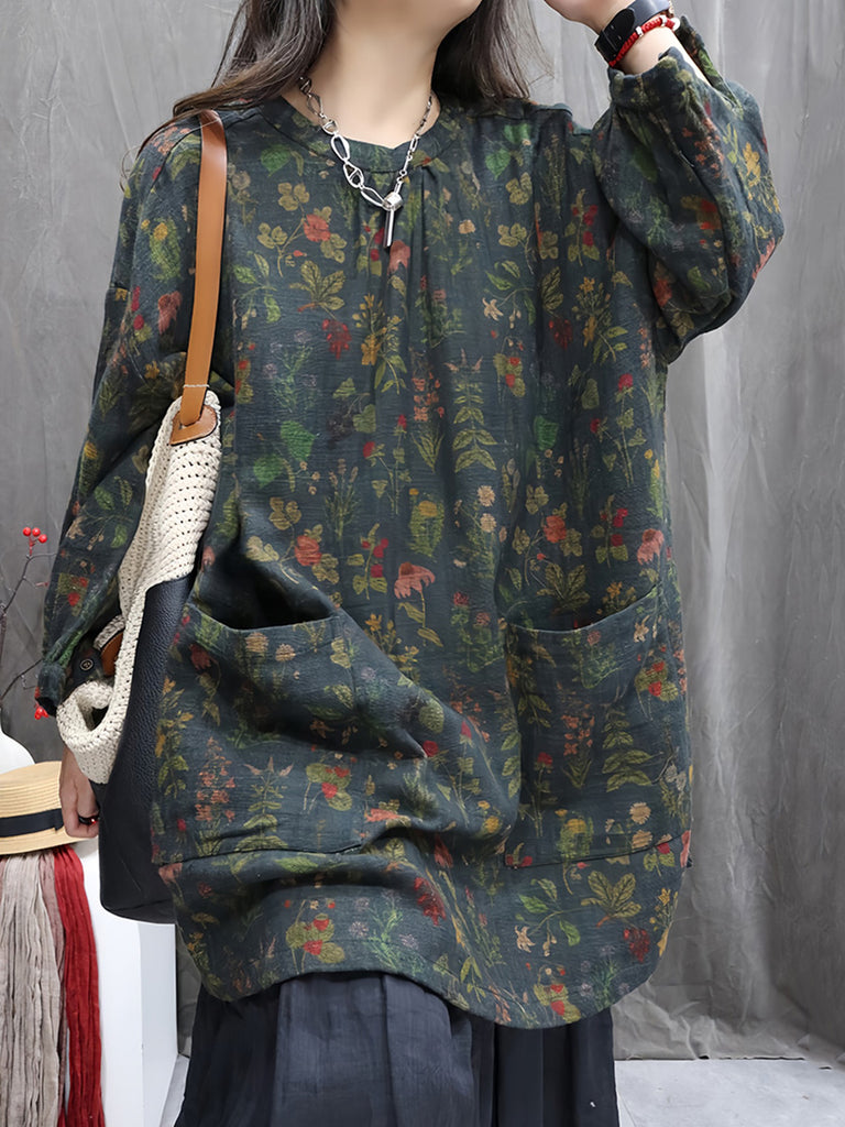 Women Autumn Vintage Flower Linen O-Neck Shirt