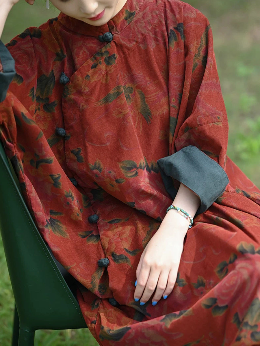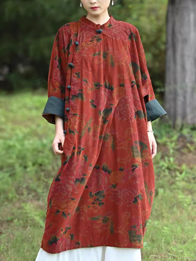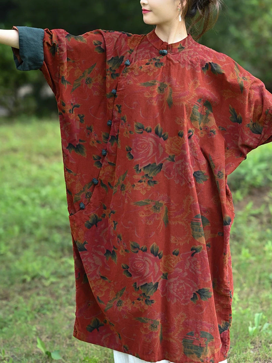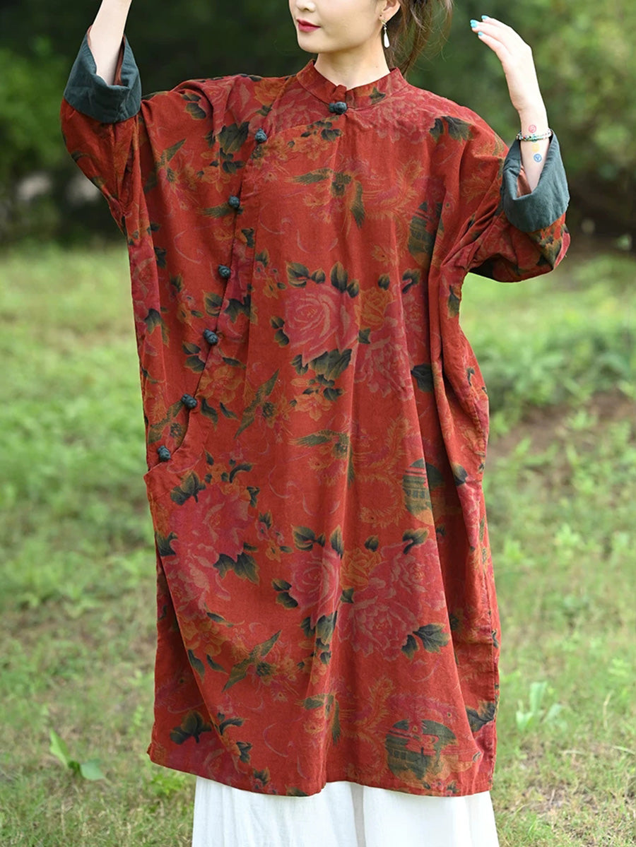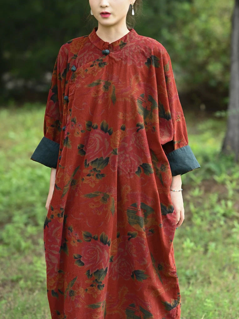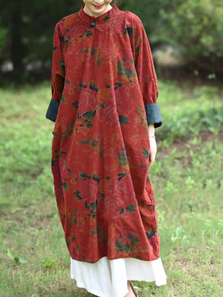 Women Autumn Vintage Flower Stand Collar 100%Cotton Dress