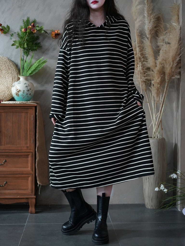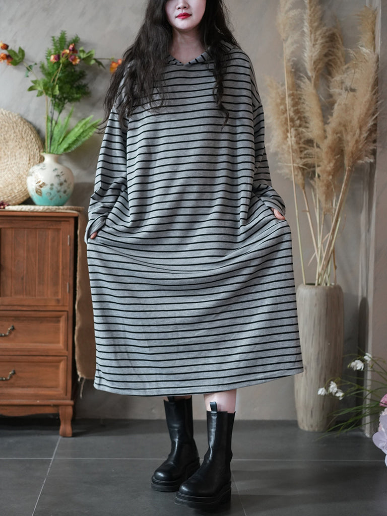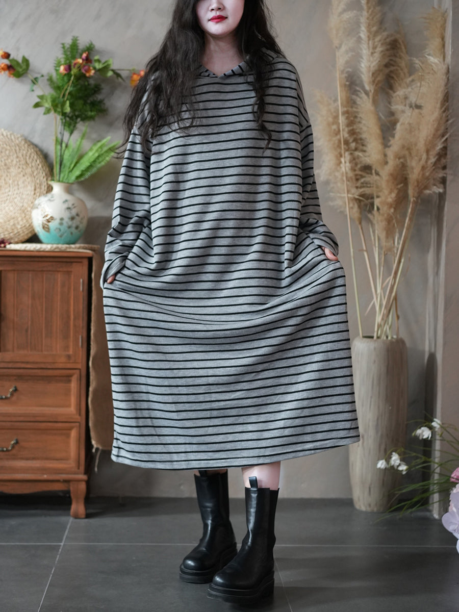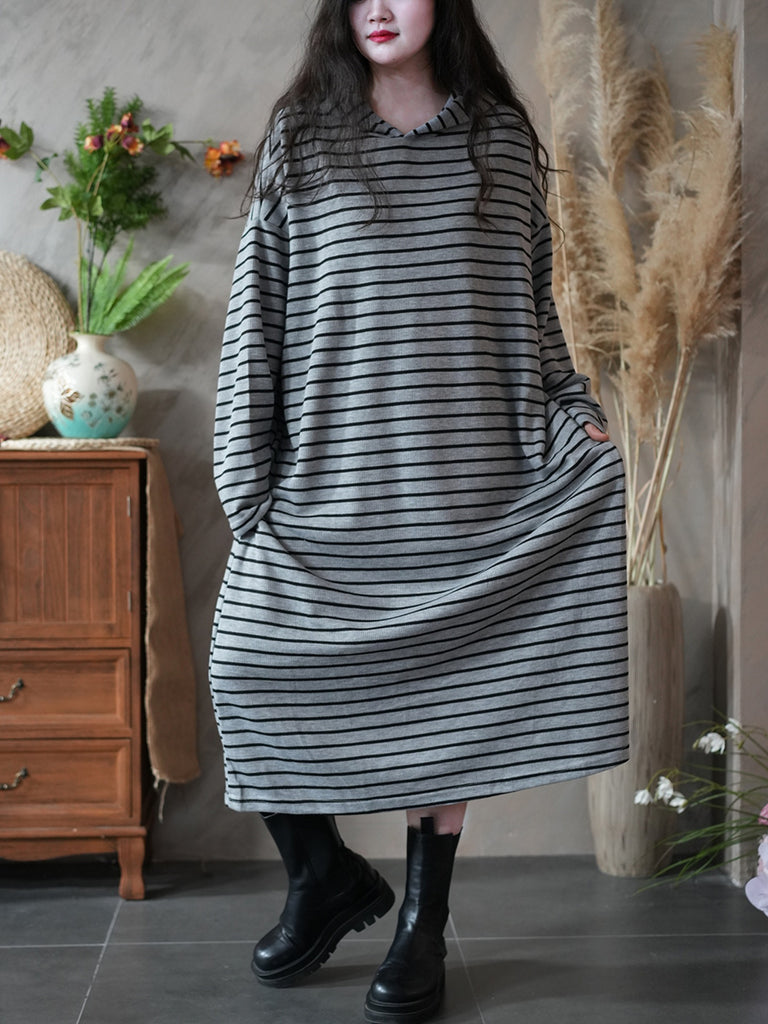 Women Autumn Vintage Stripe Hooded Dress