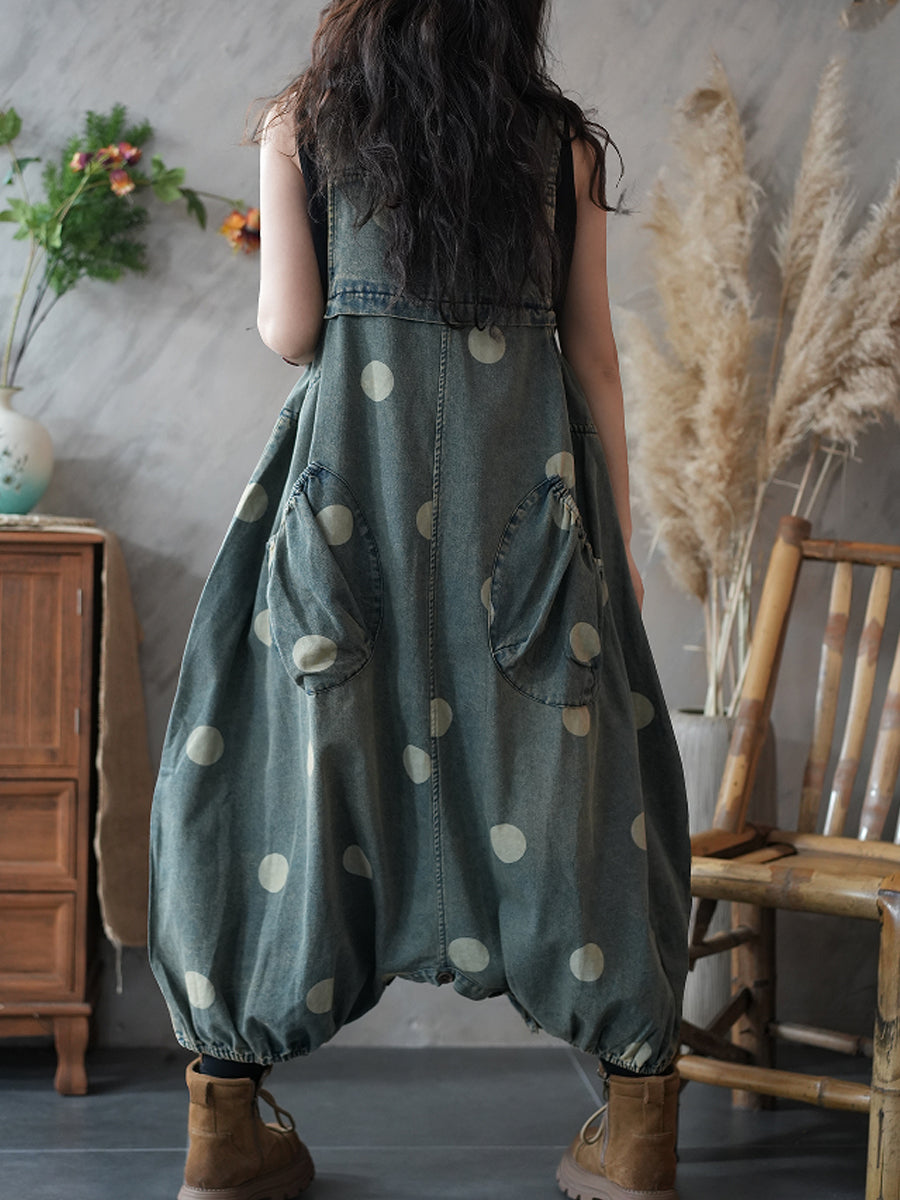 Women Casual Dot Denim Low Crotch Jumpsuit