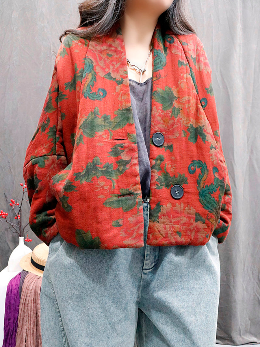 Women Retro Flower 100%Cotton V-Neck Padded Coat