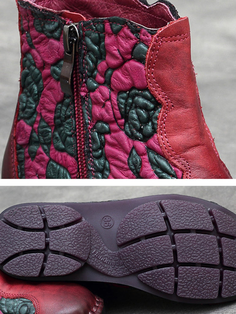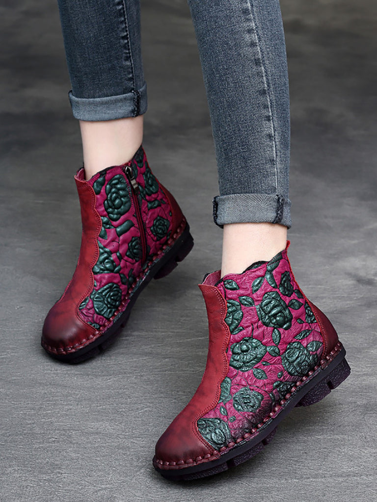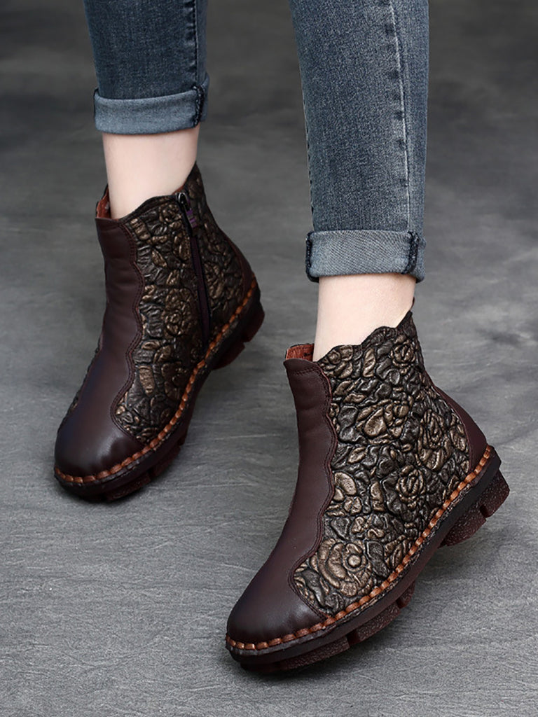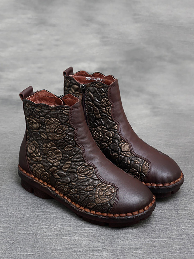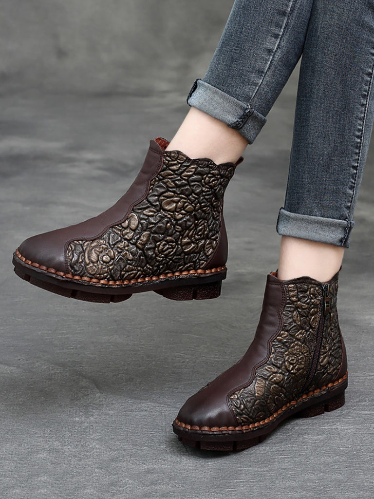 Women Retro Flower Leather Spliced Zipper Low Heel Boots