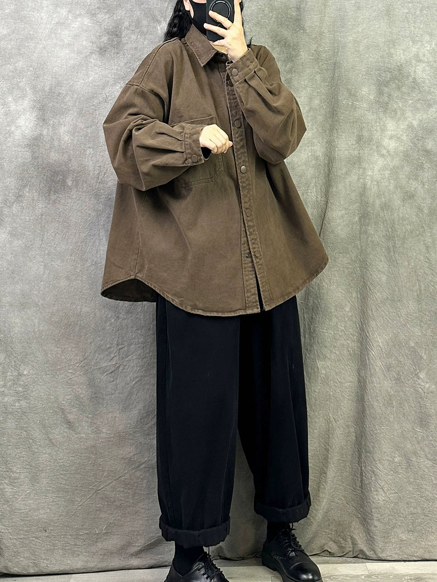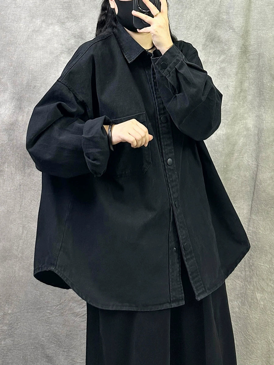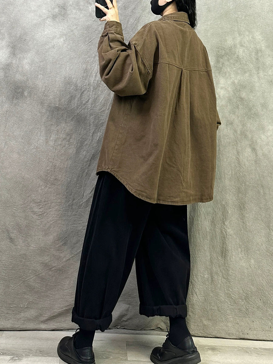 Women Retro Spring Pure Color Turn-down Collar Cotton Shirt